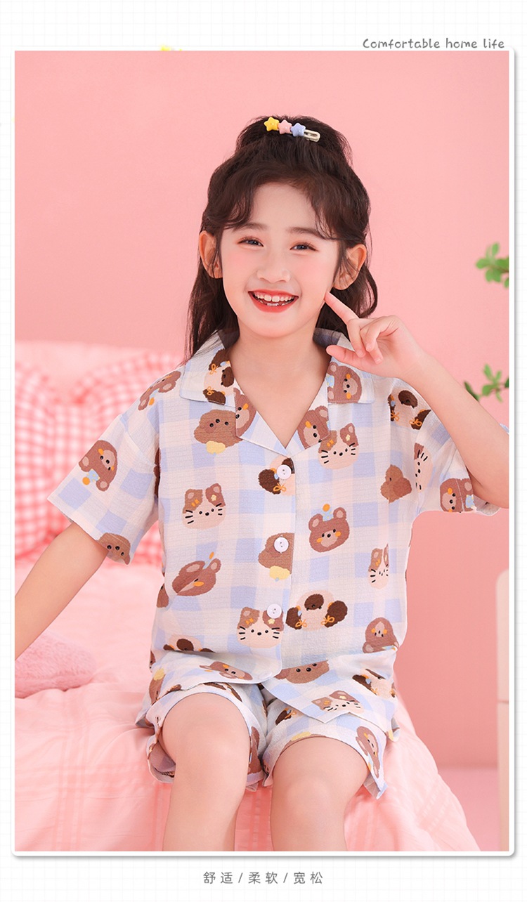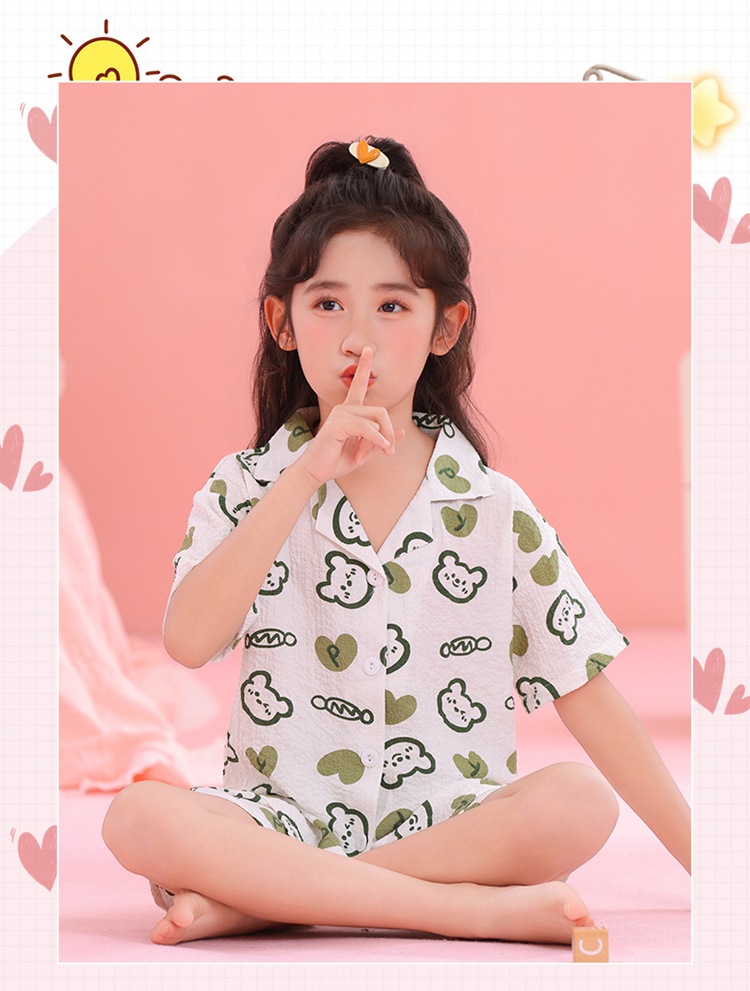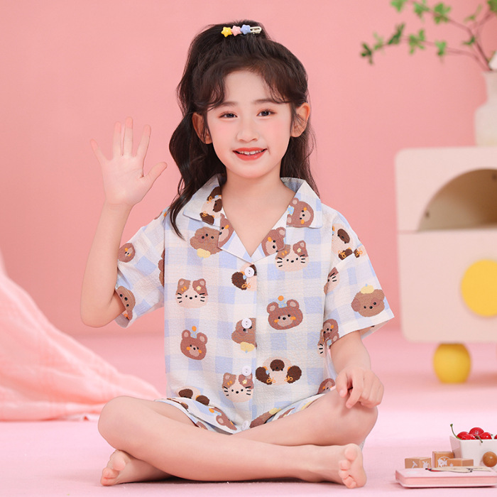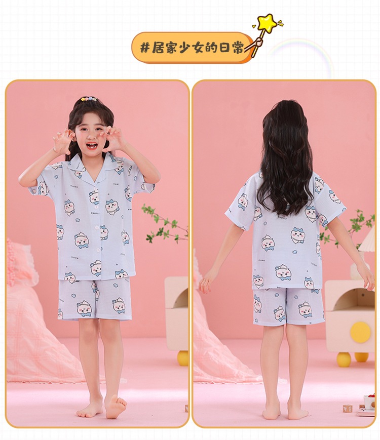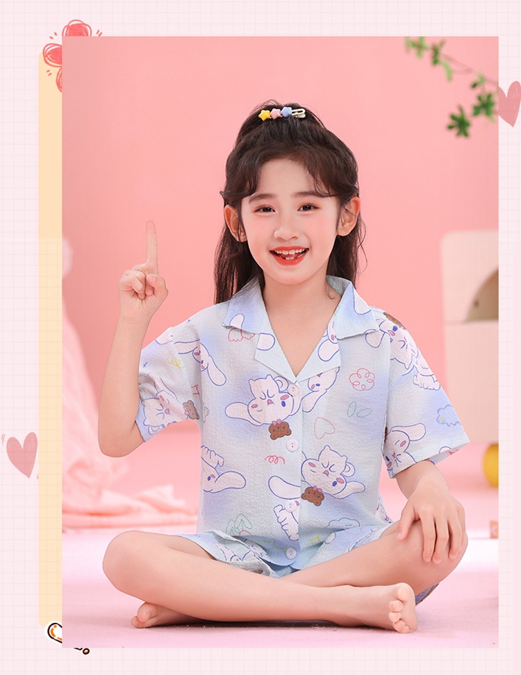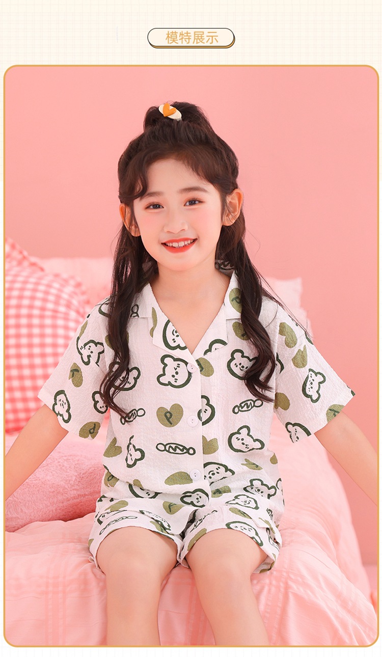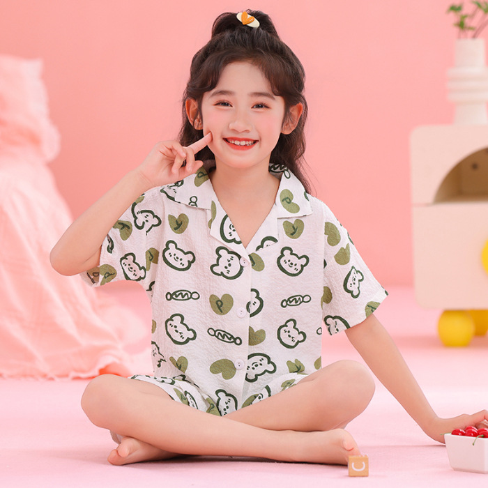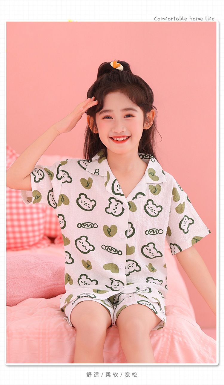 어린이 잠옷 옷깃 카디건 버블 코튼 소녀 만화 여름 반팔 반바지 중소형 및 대형 어린이 홈 의류 세트스토어 가기