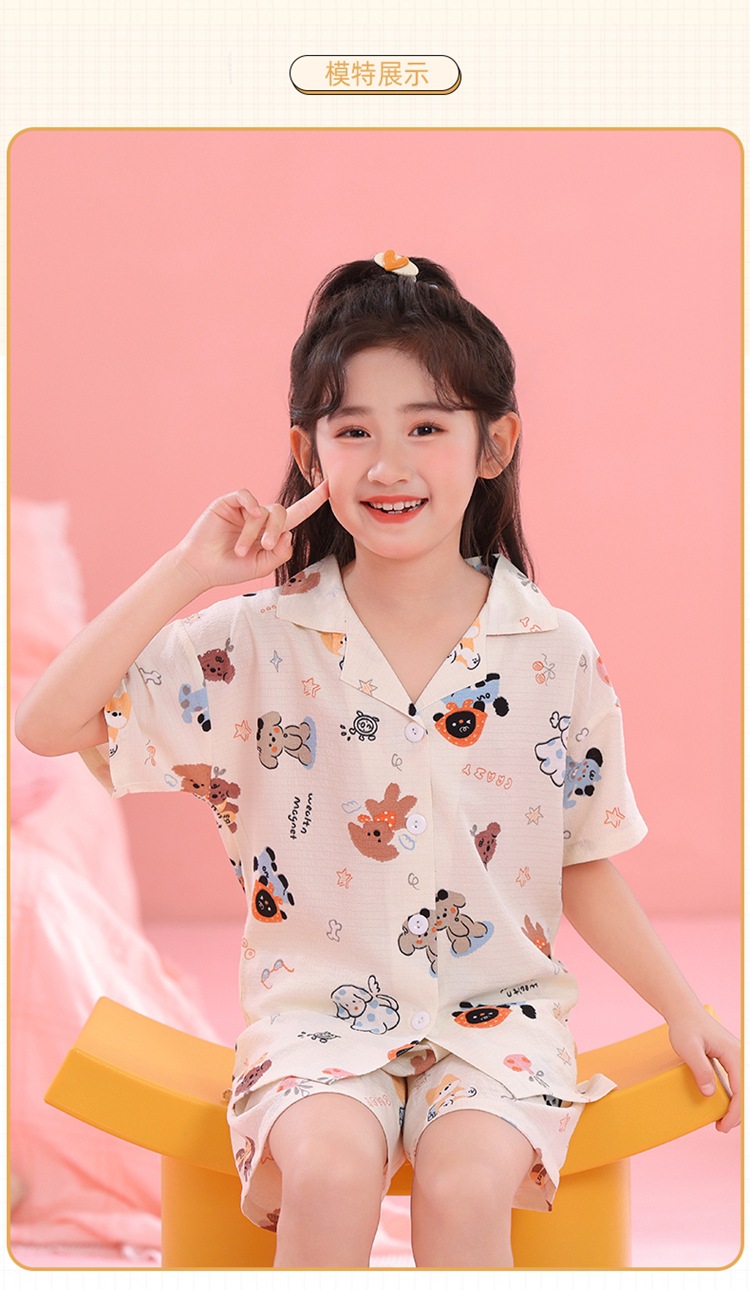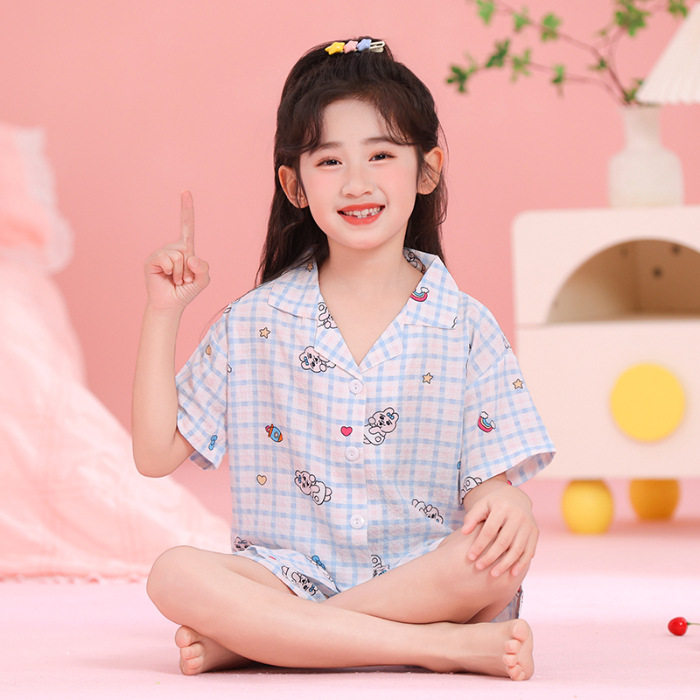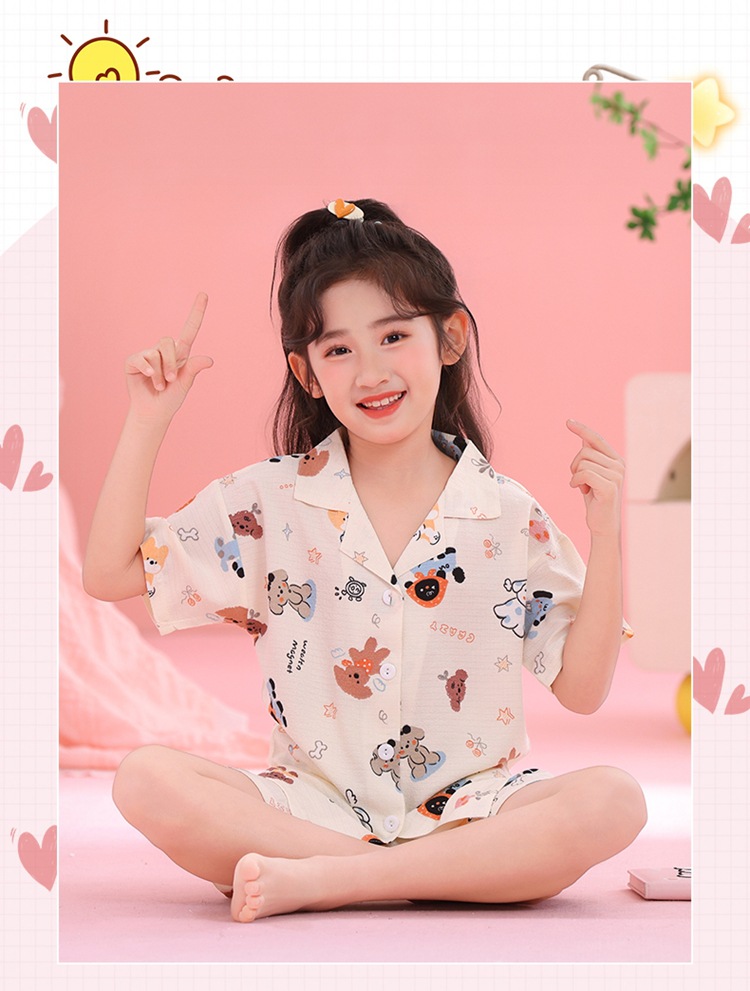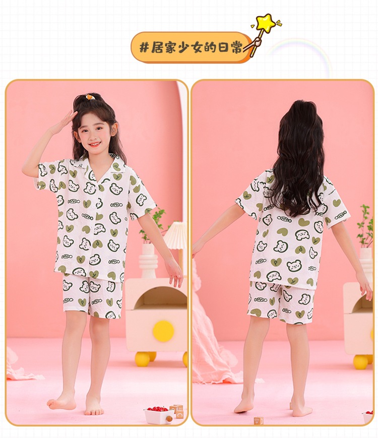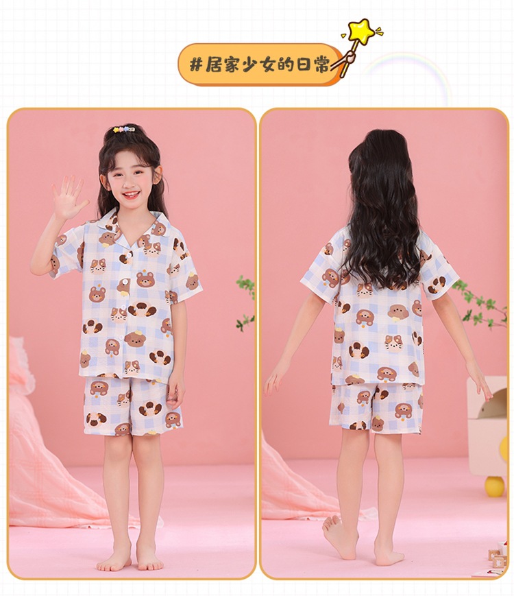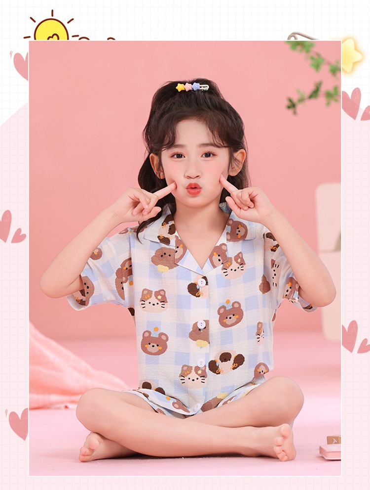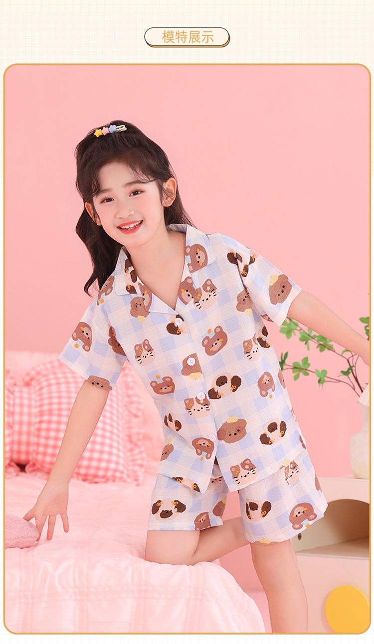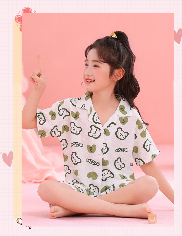 어린이 잠옷 옷깃 카디건 버블 코튼 소녀 만화 여름 반팔 반바지 중소형 및 대형 어린이 홈 의류 세트스토어 가기