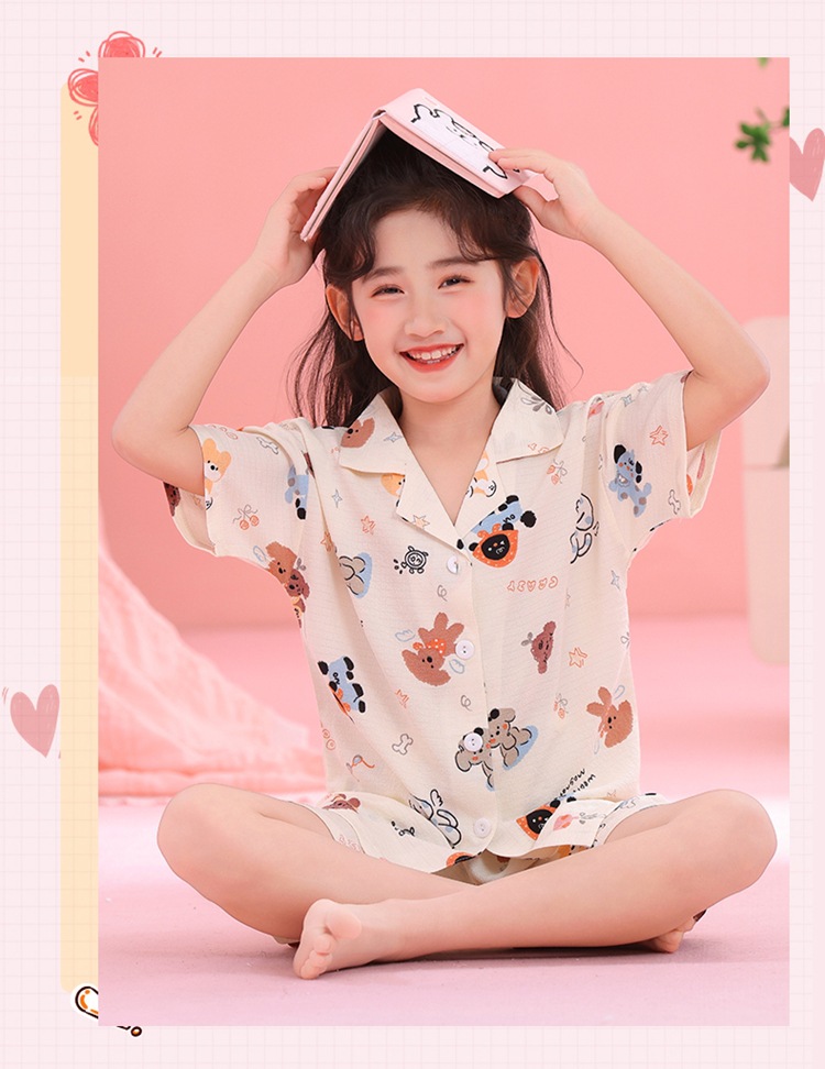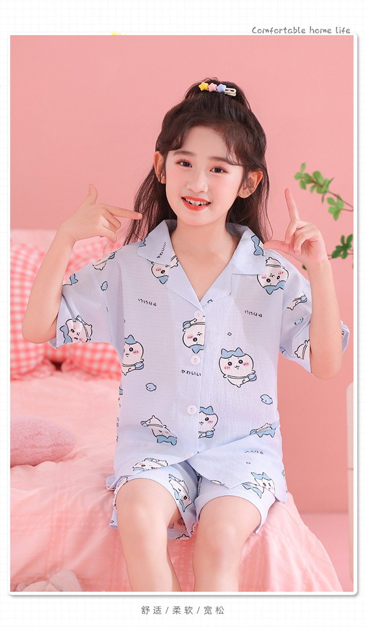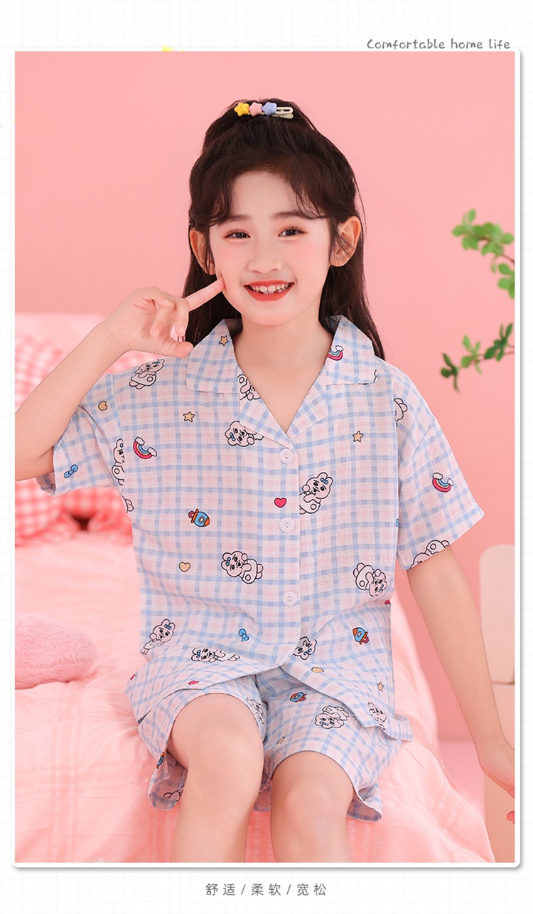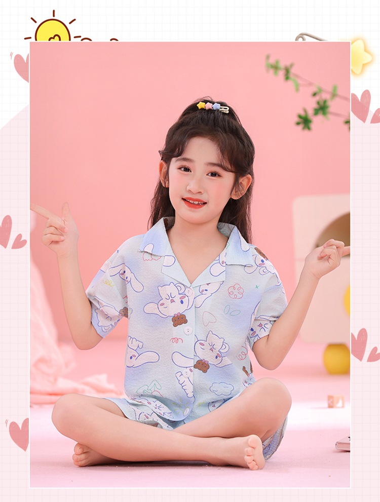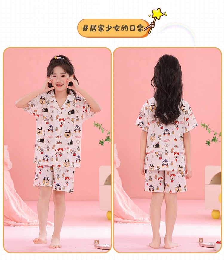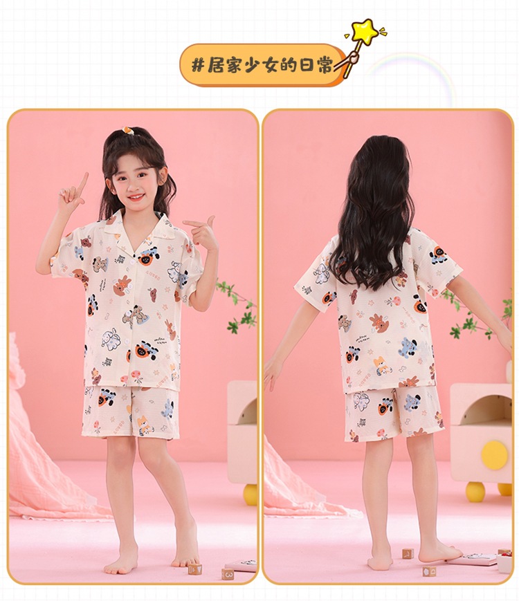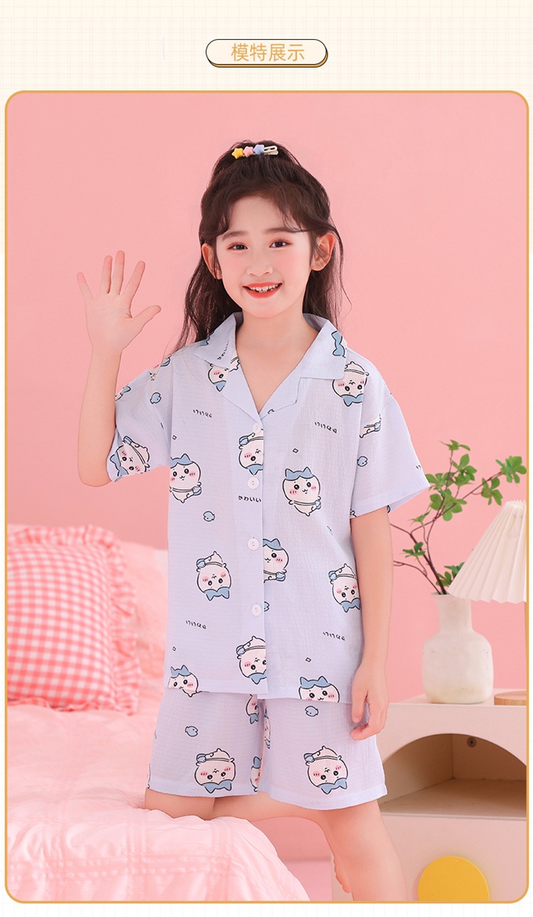 어린이 잠옷 옷깃 카디건 버블 코튼 소녀 만화 여름 반팔 반바지 중소형 및 대형 어린이 홈 의류 세트스토어 가기