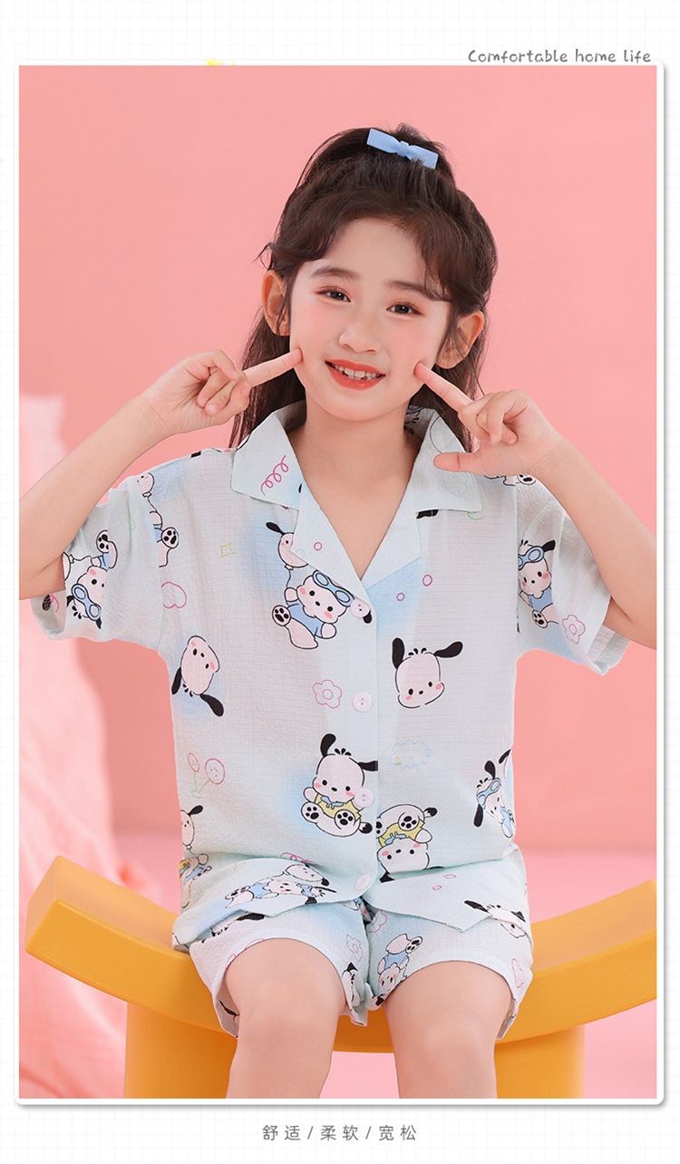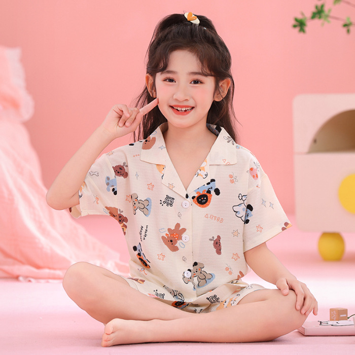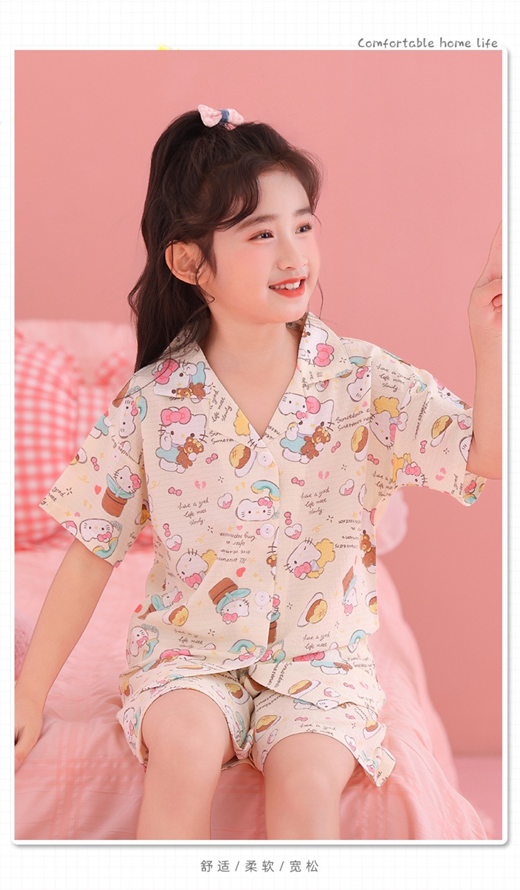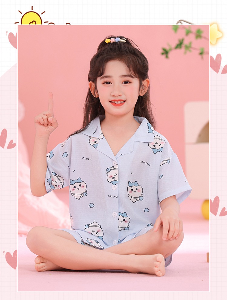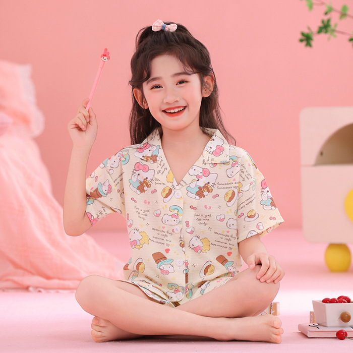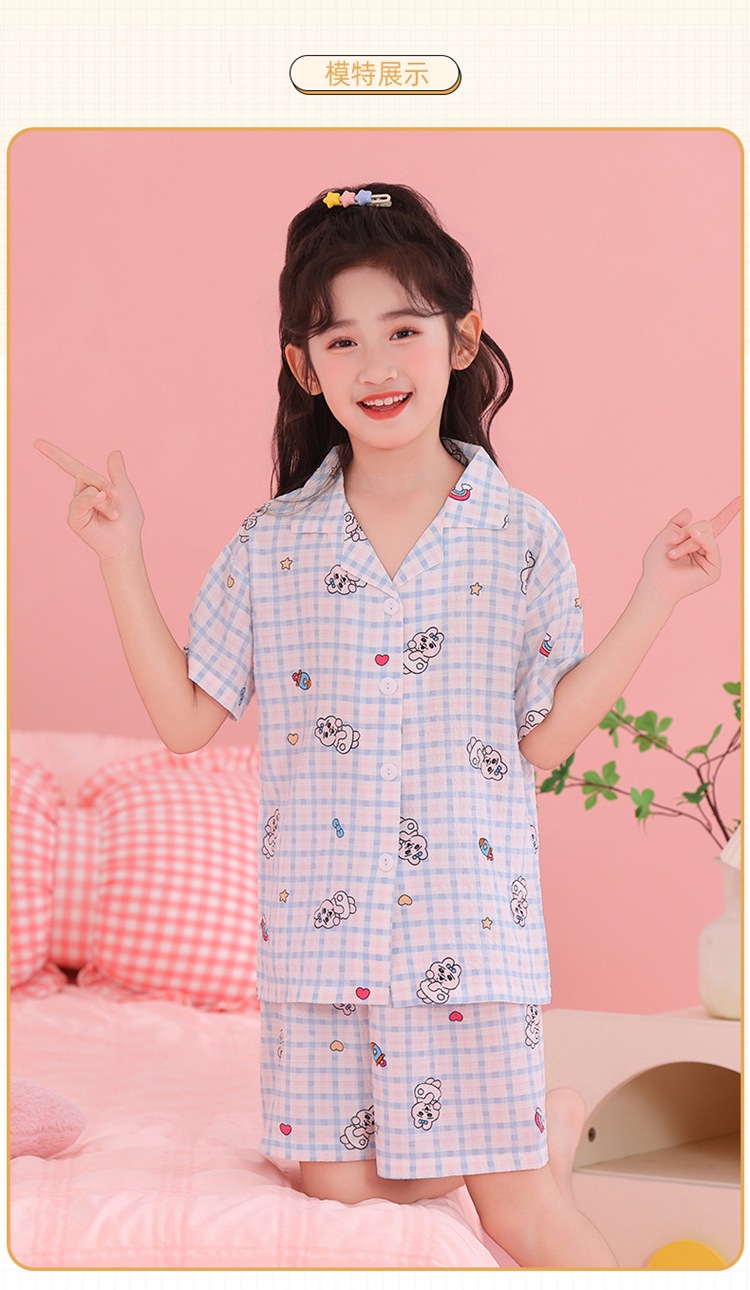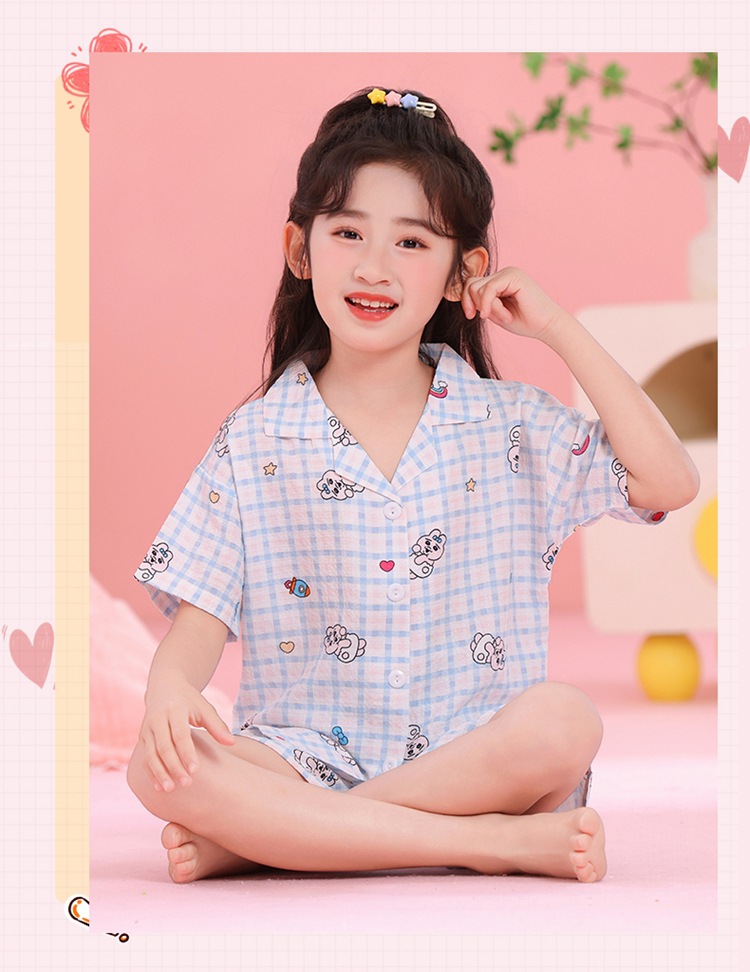어린이 잠옷 옷깃 카디건 버블 코튼 소녀 만화 여름 반팔 반바지 중소형 및 대형 어린이 홈 의류 세트스토어 가기