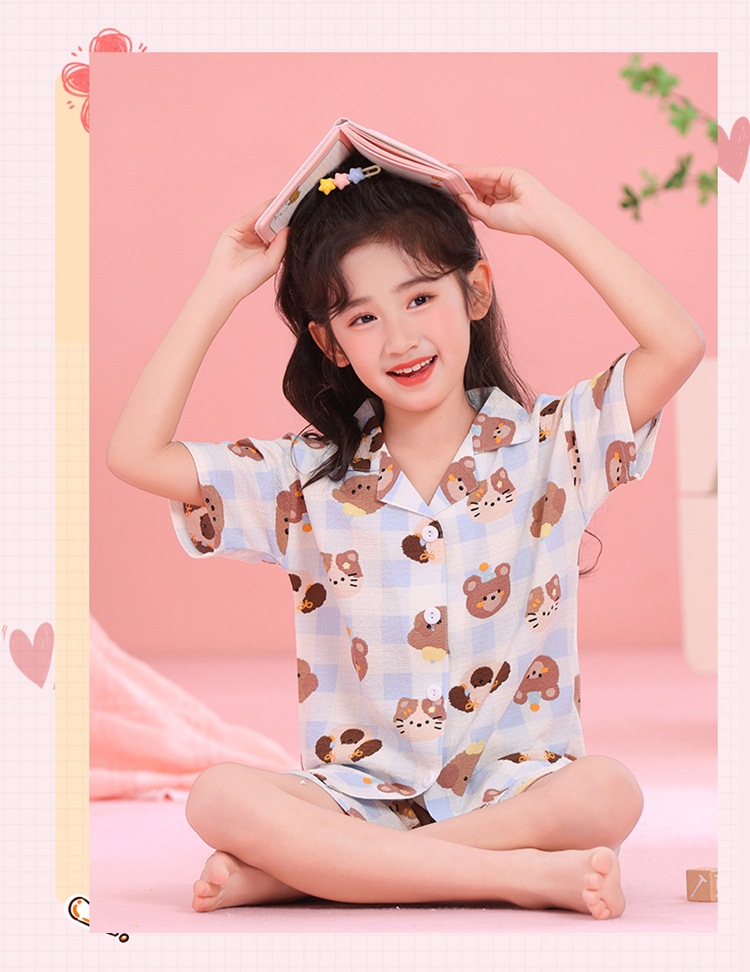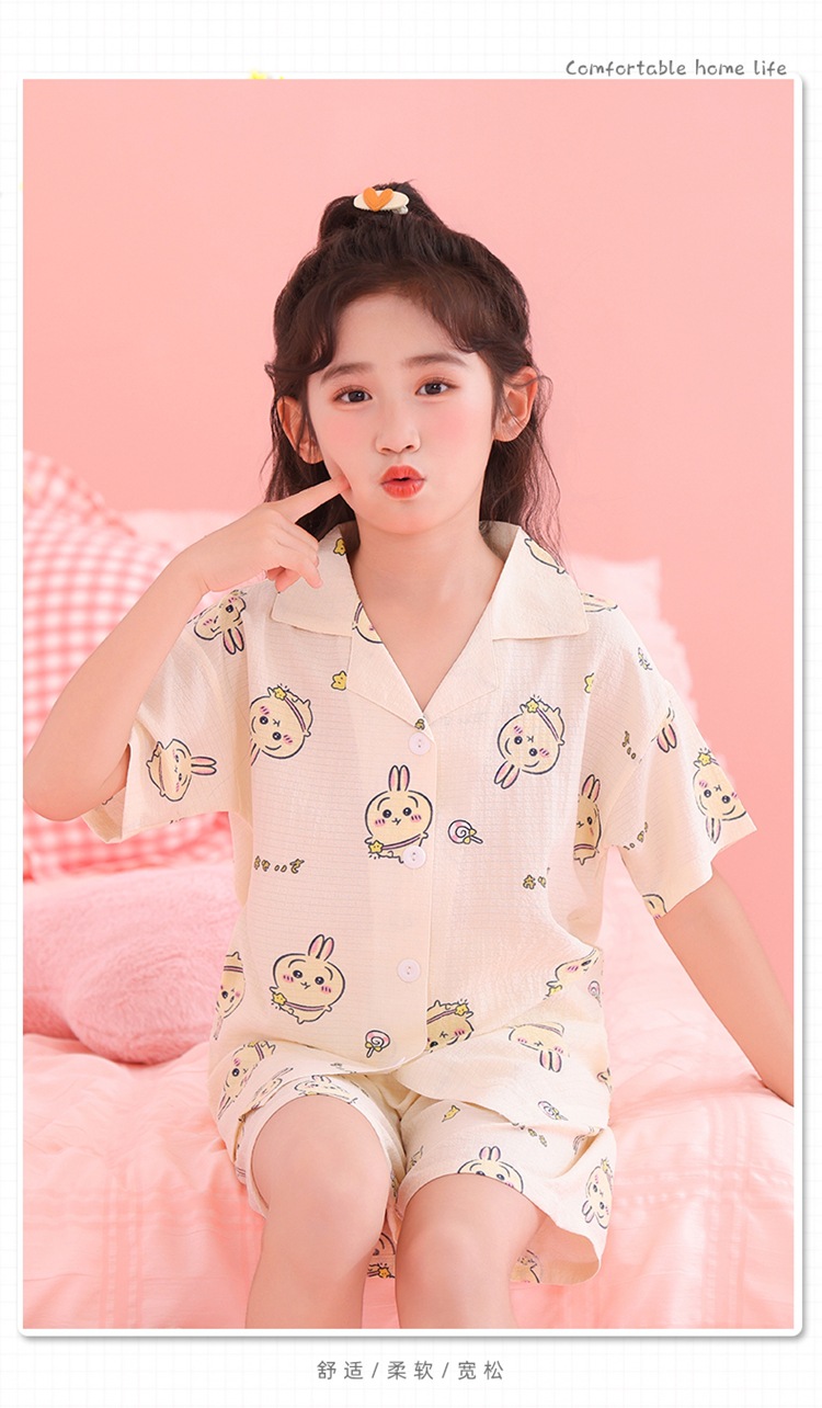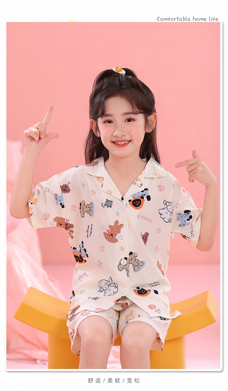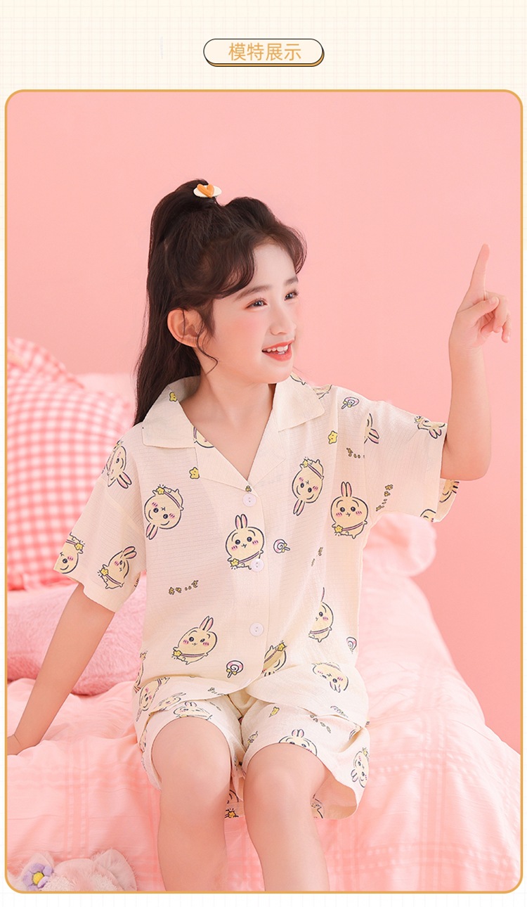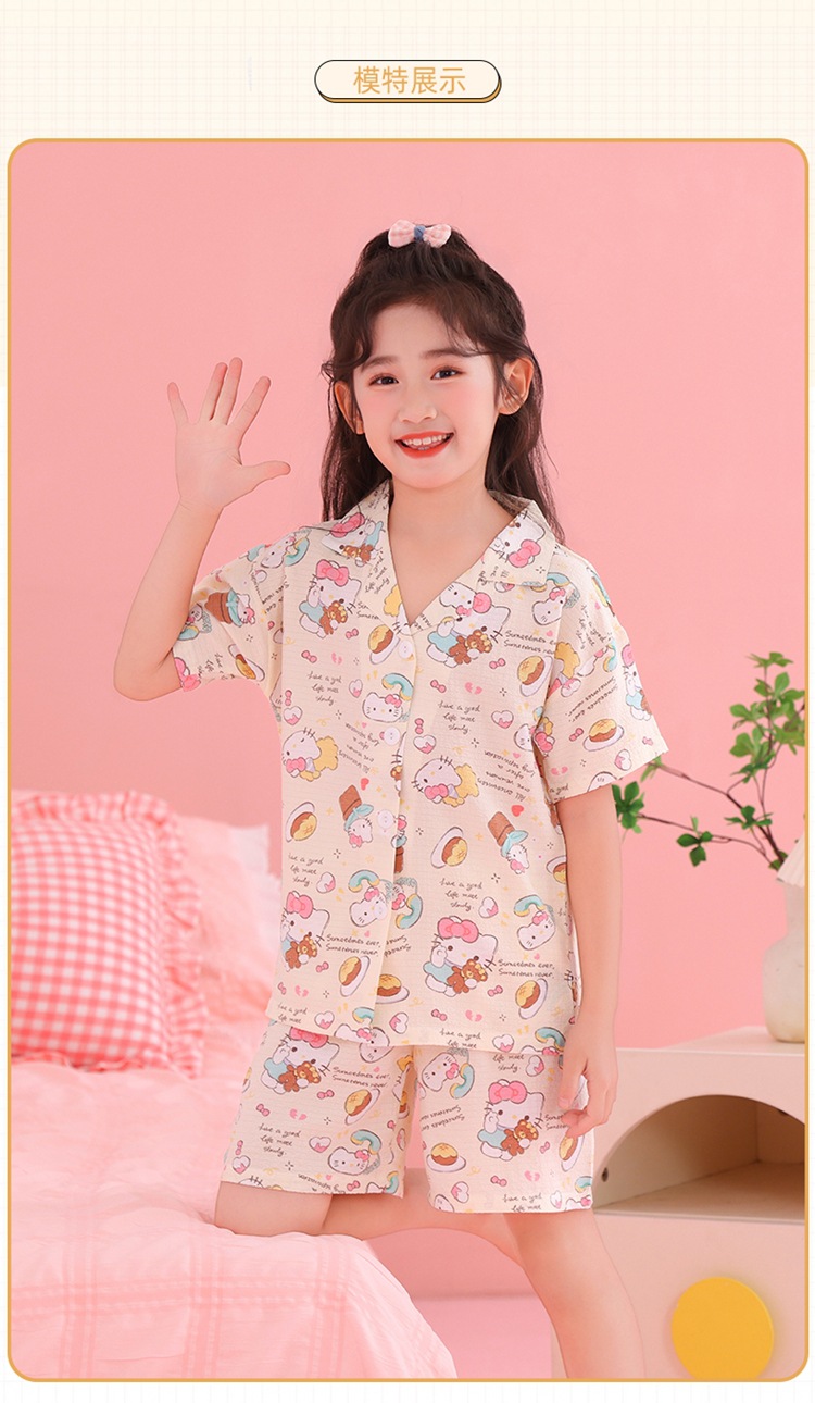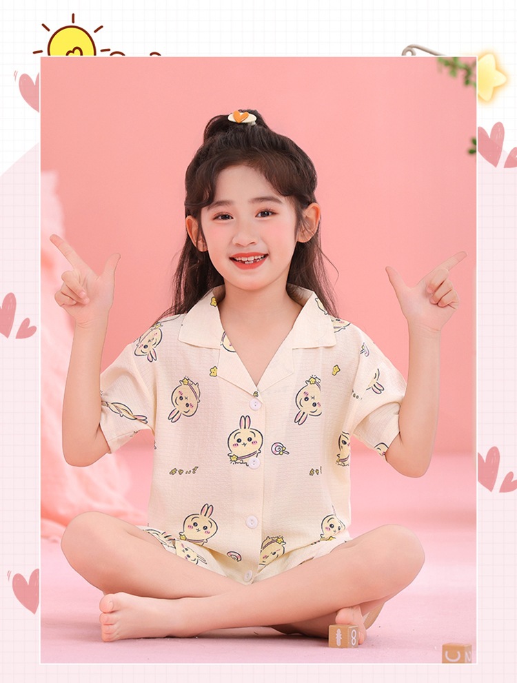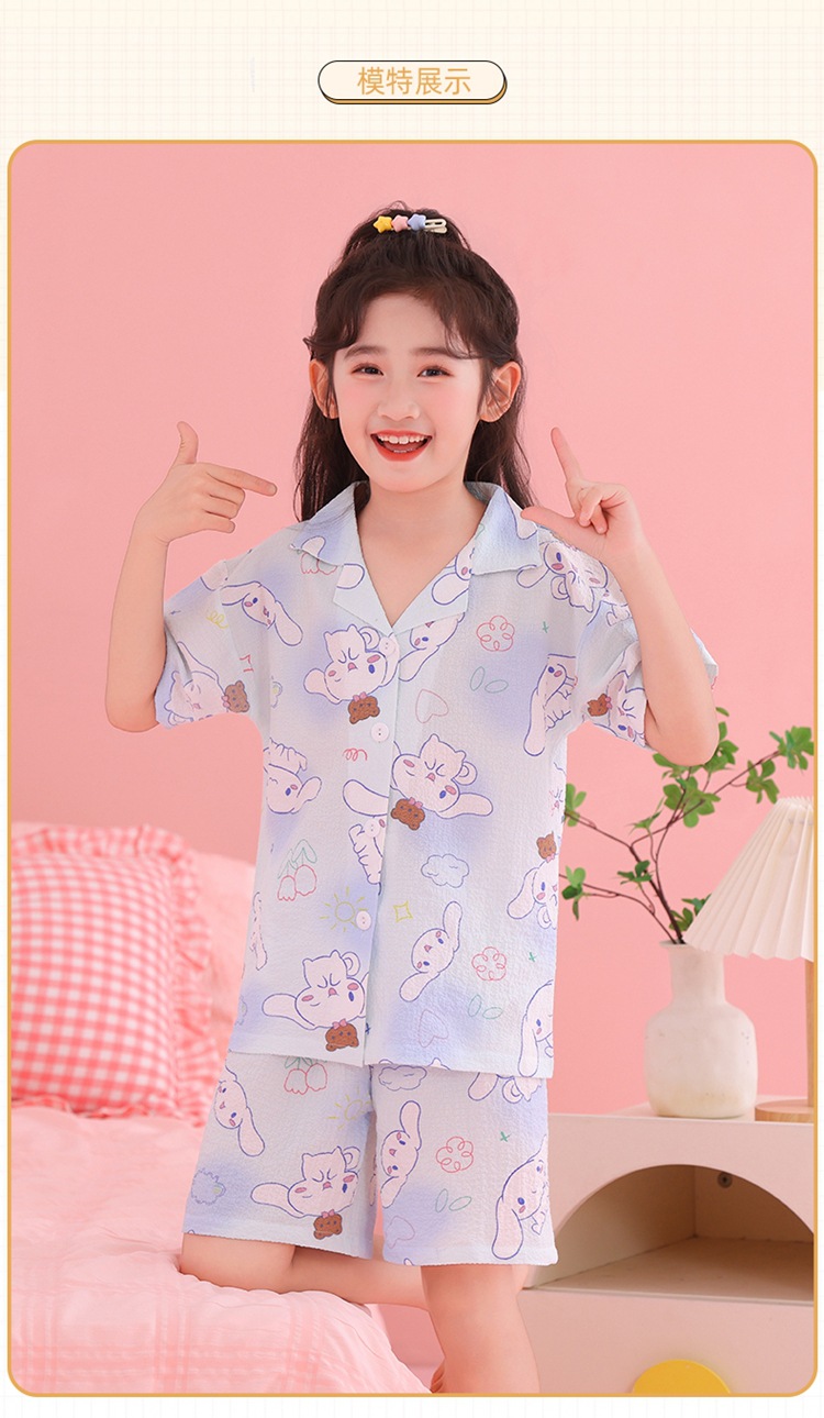 어린이 잠옷 옷깃 카디건 버블 코튼 소녀 만화 여름 반팔 반바지 중소형 및 대형 어린이 홈 의류 세트스토어 가기
