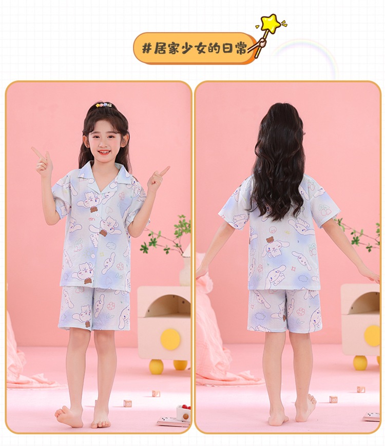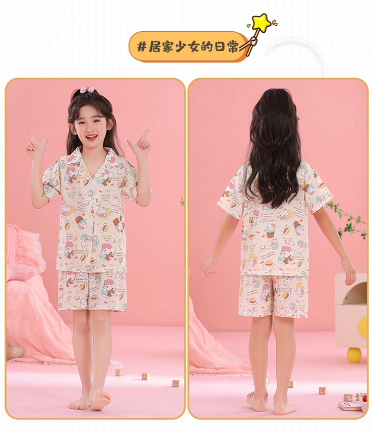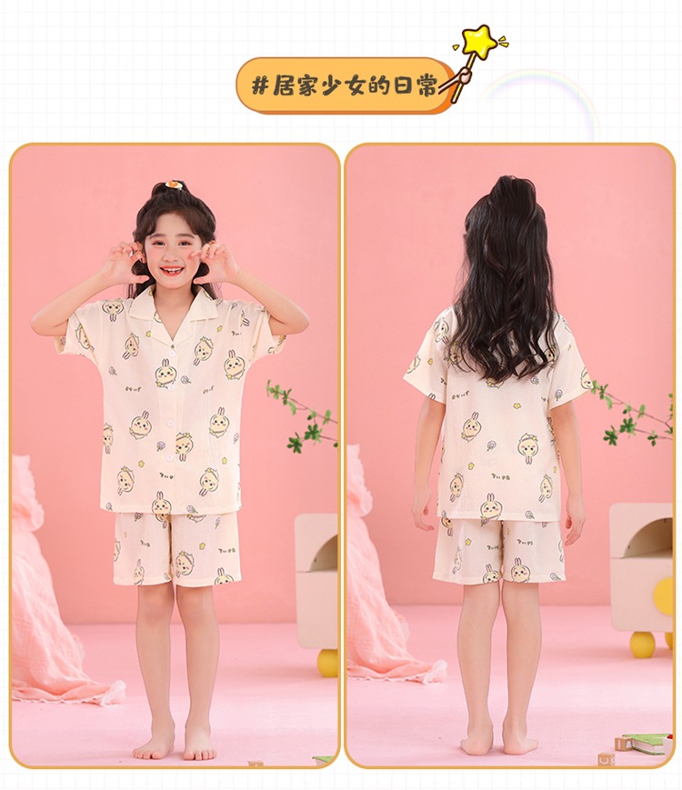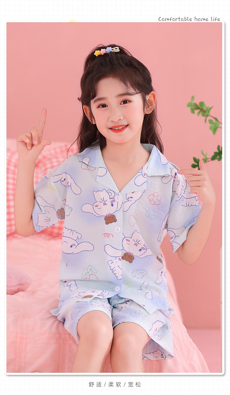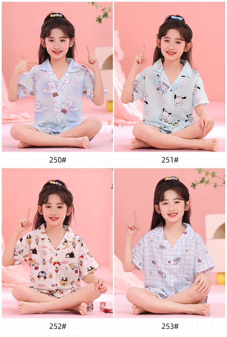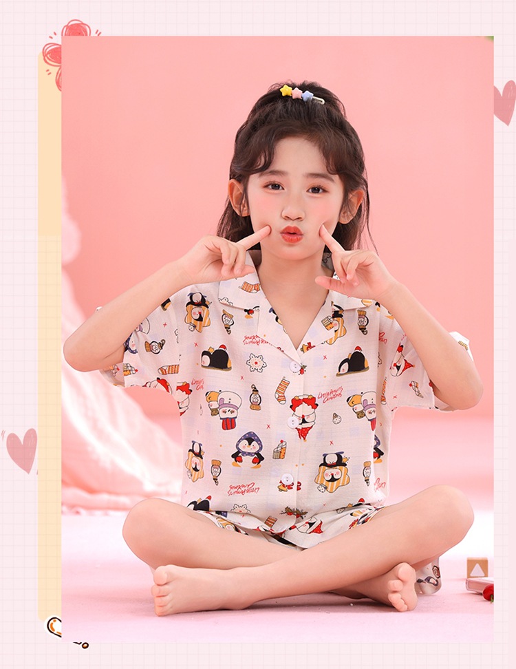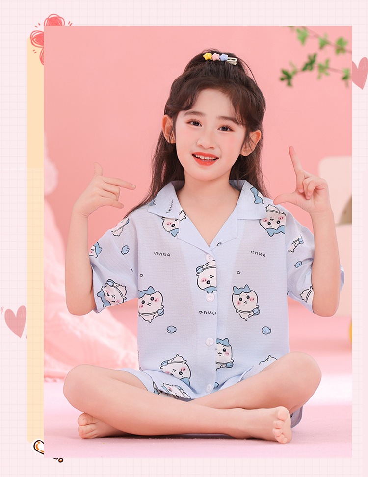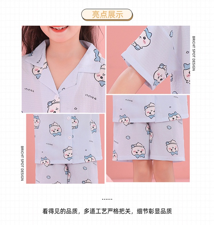 어린이 잠옷 옷깃 카디건 버블 코튼 소녀 만화 여름 반팔 반바지 중소형 및 대형 어린이 홈 의류 세트스토어 가기
