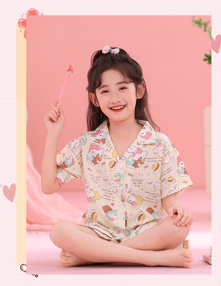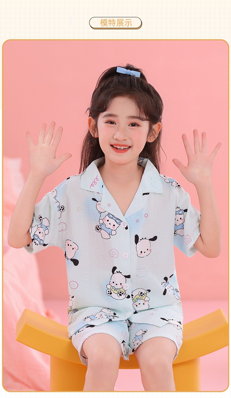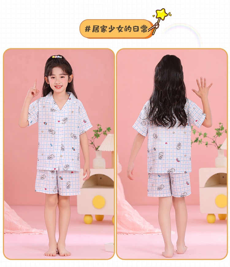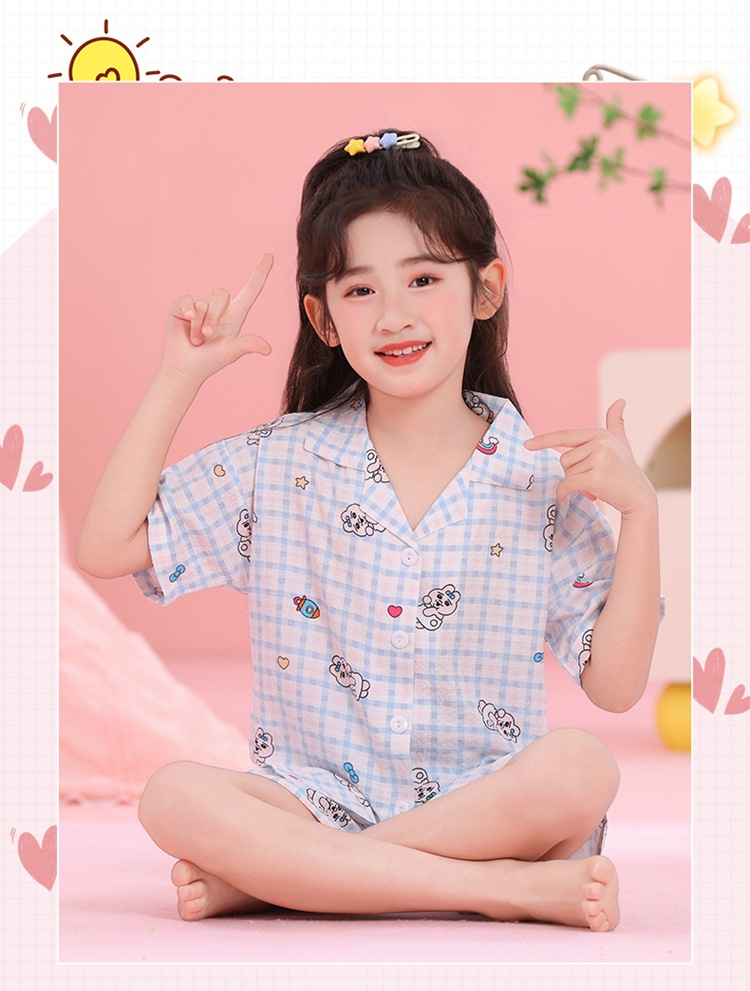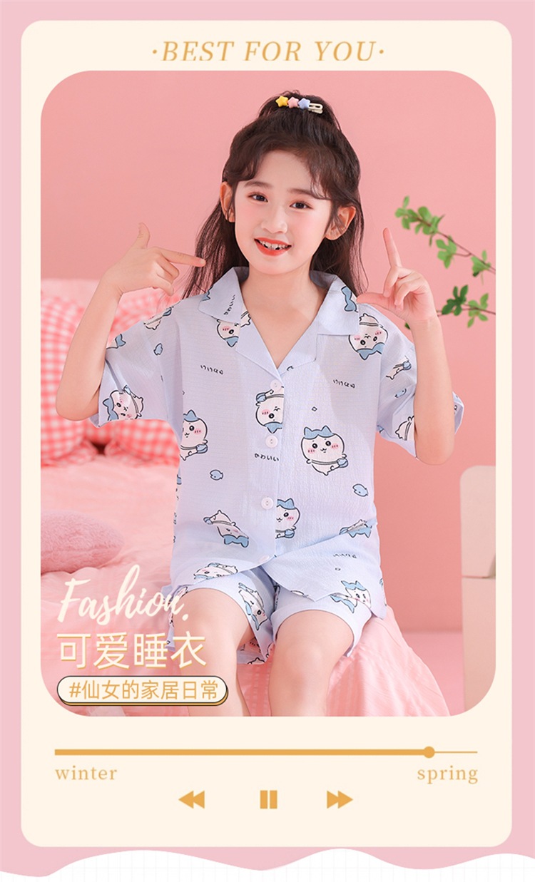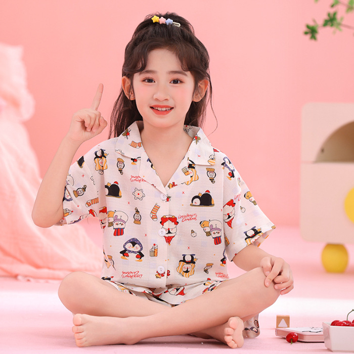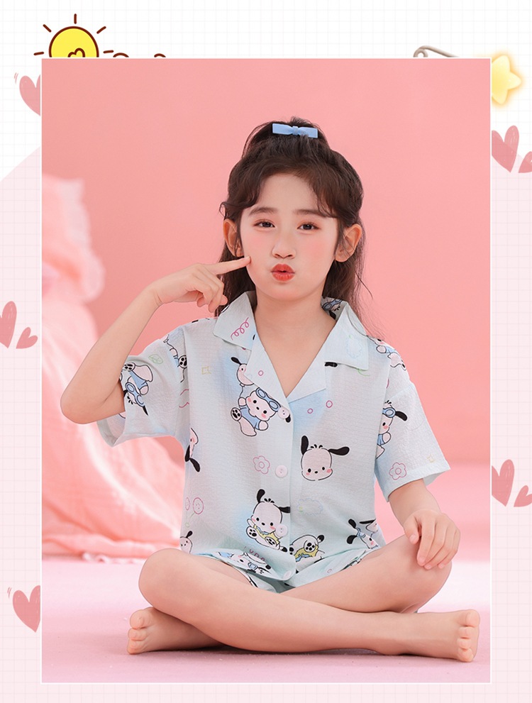 어린이 잠옷 옷깃 카디건 버블 코튼 소녀 만화 여름 반팔 반바지 중소형 및 대형 어린이 홈 의류 세트스토어 가기