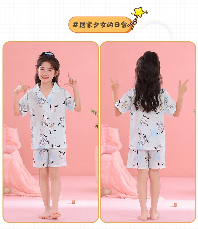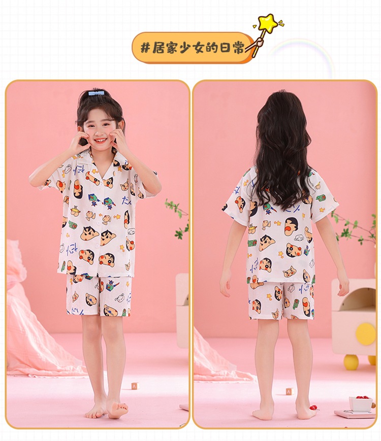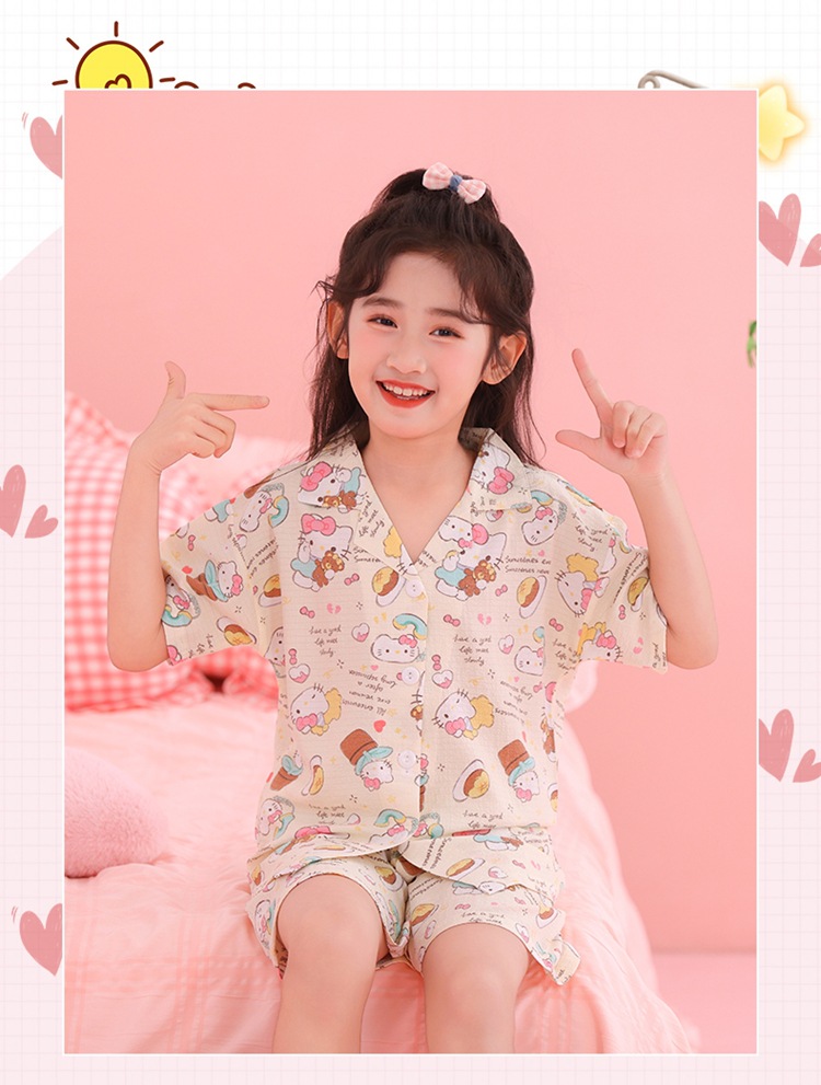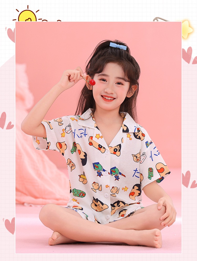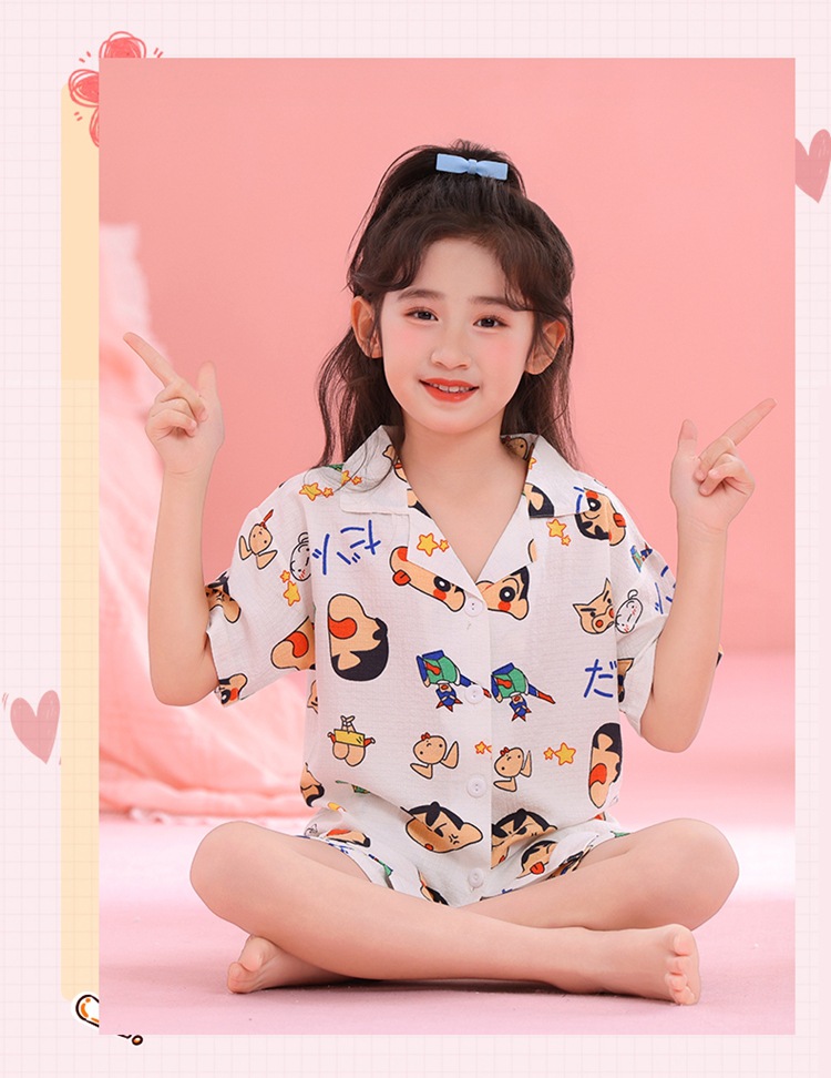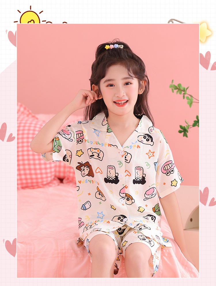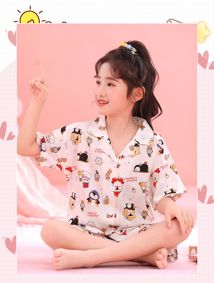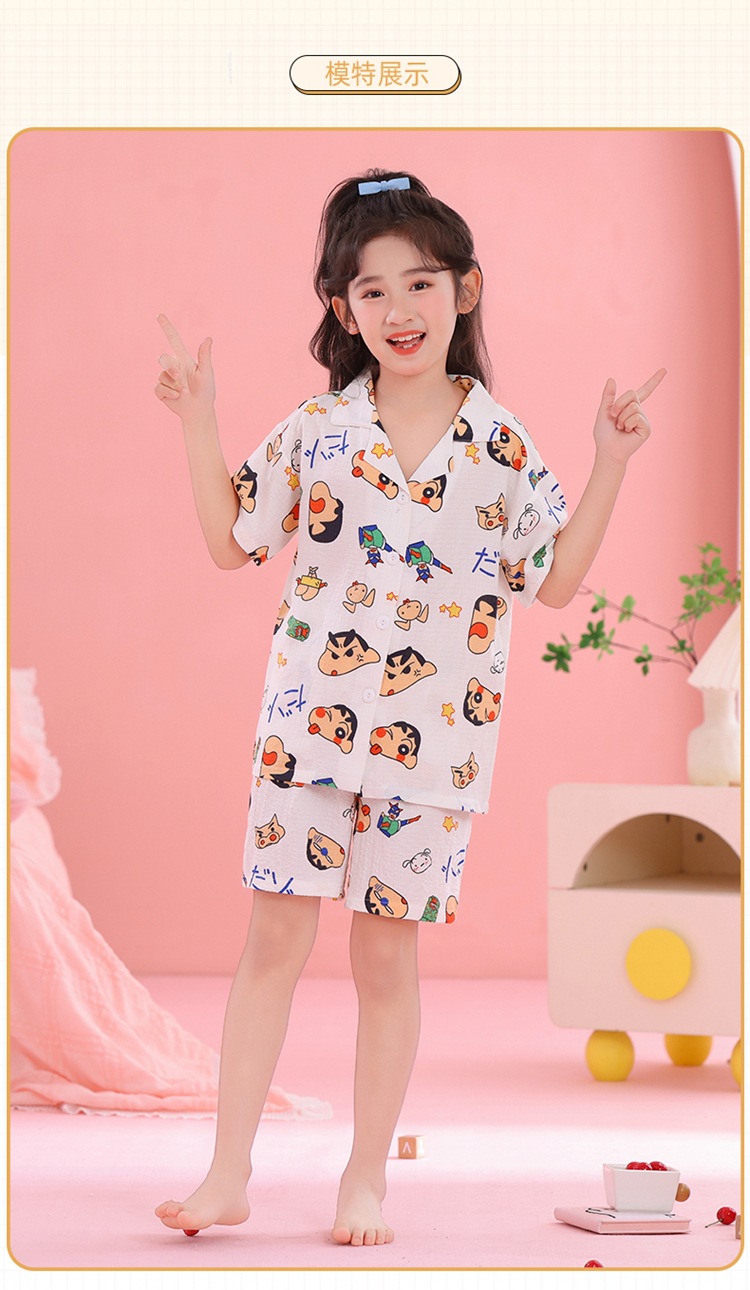 어린이 잠옷 옷깃 카디건 버블 코튼 소녀 만화 여름 반팔 반바지 중소형 및 대형 어린이 홈 의류 세트스토어 가기