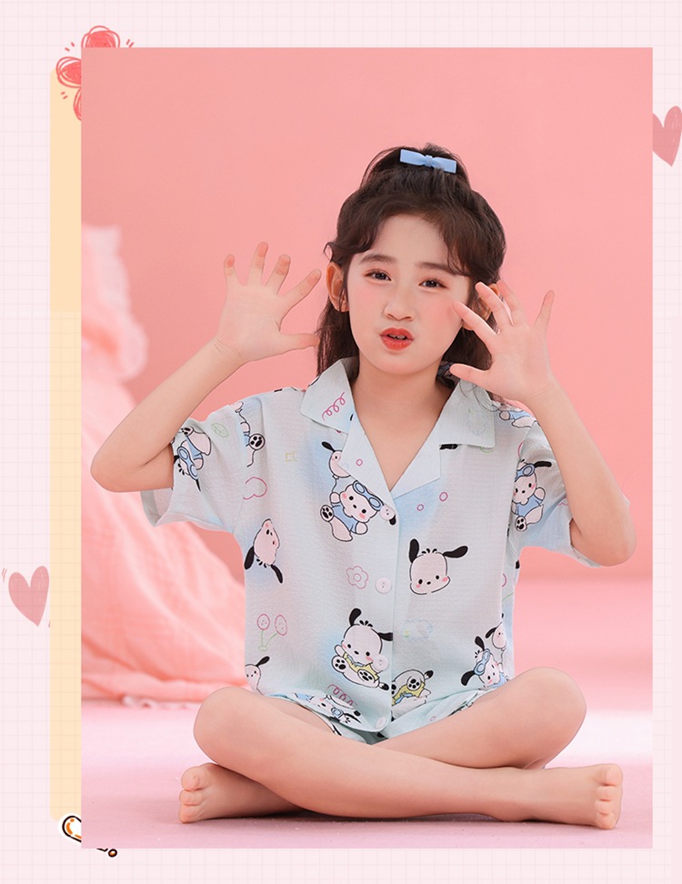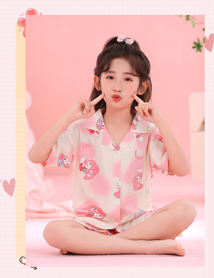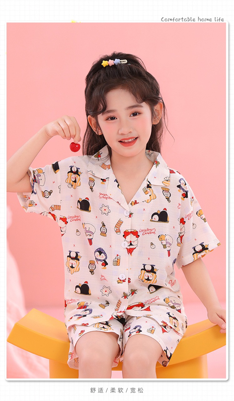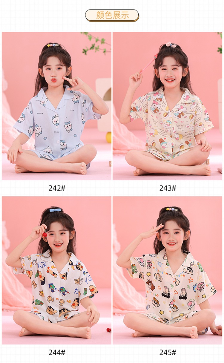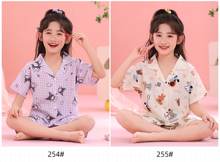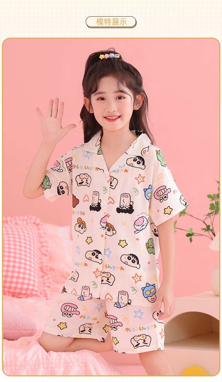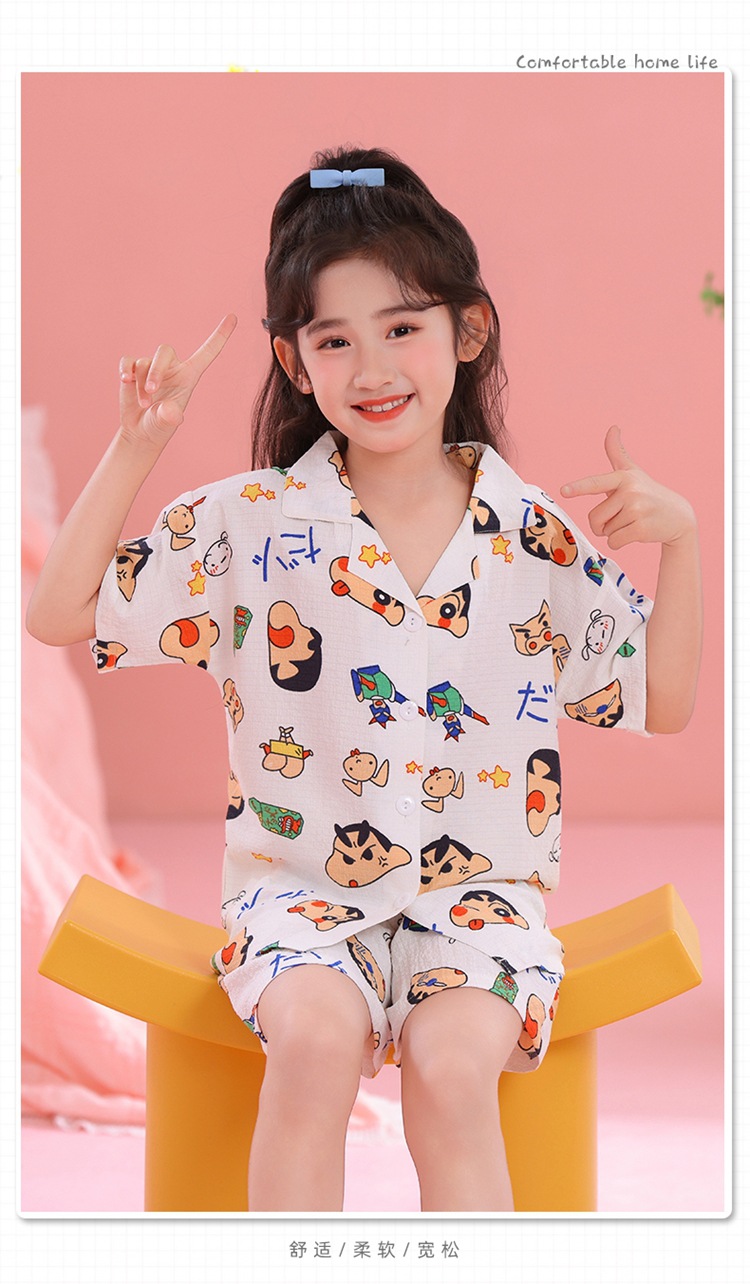 어린이 잠옷 옷깃 카디건 버블 코튼 소녀 만화 여름 반팔 반바지 중소형 및 대형 어린이 홈 의류 세트스토어 가기