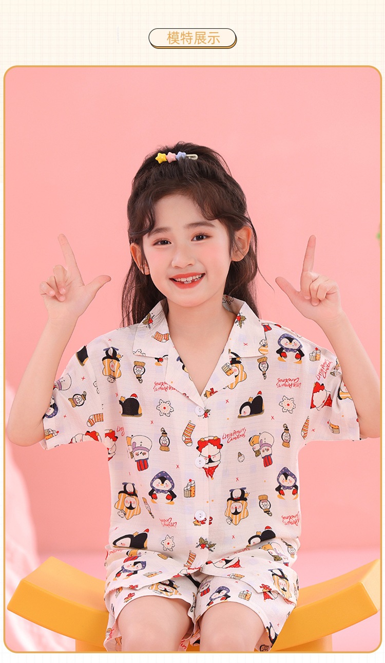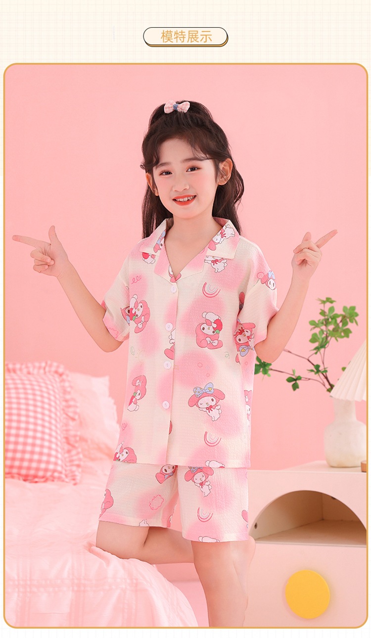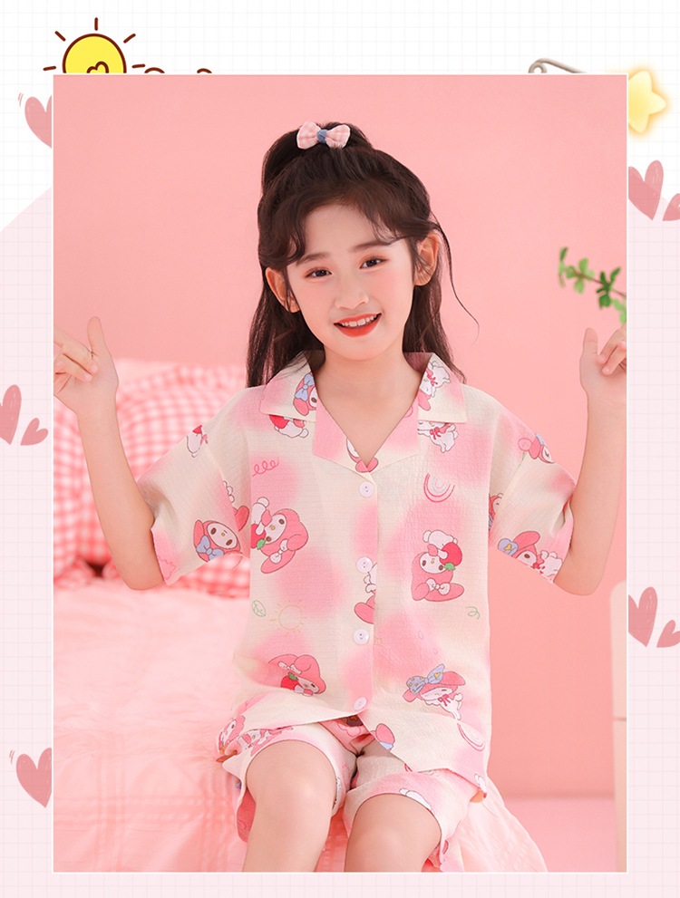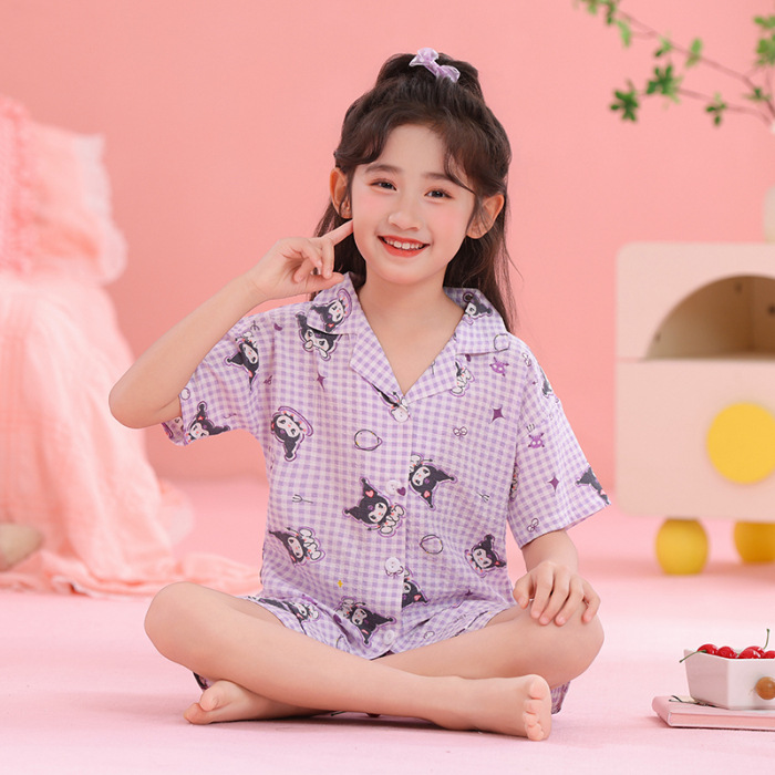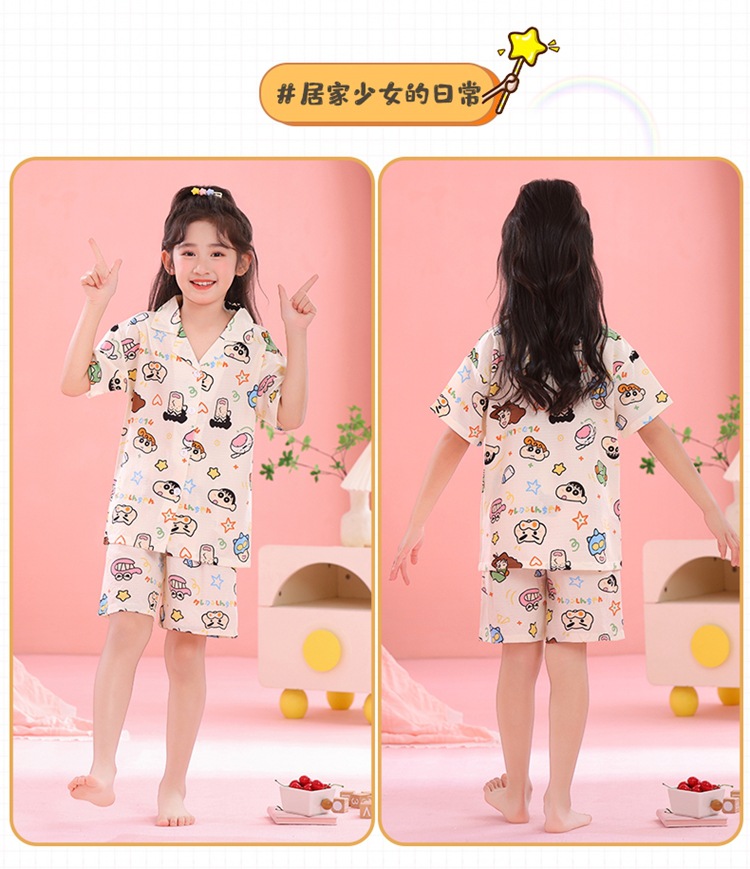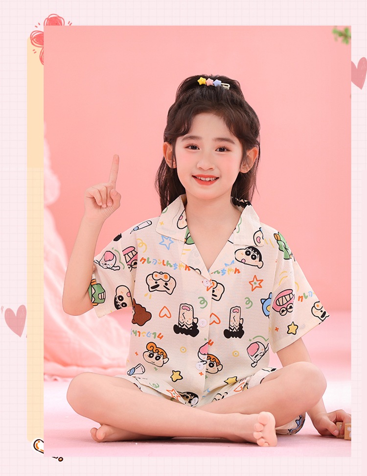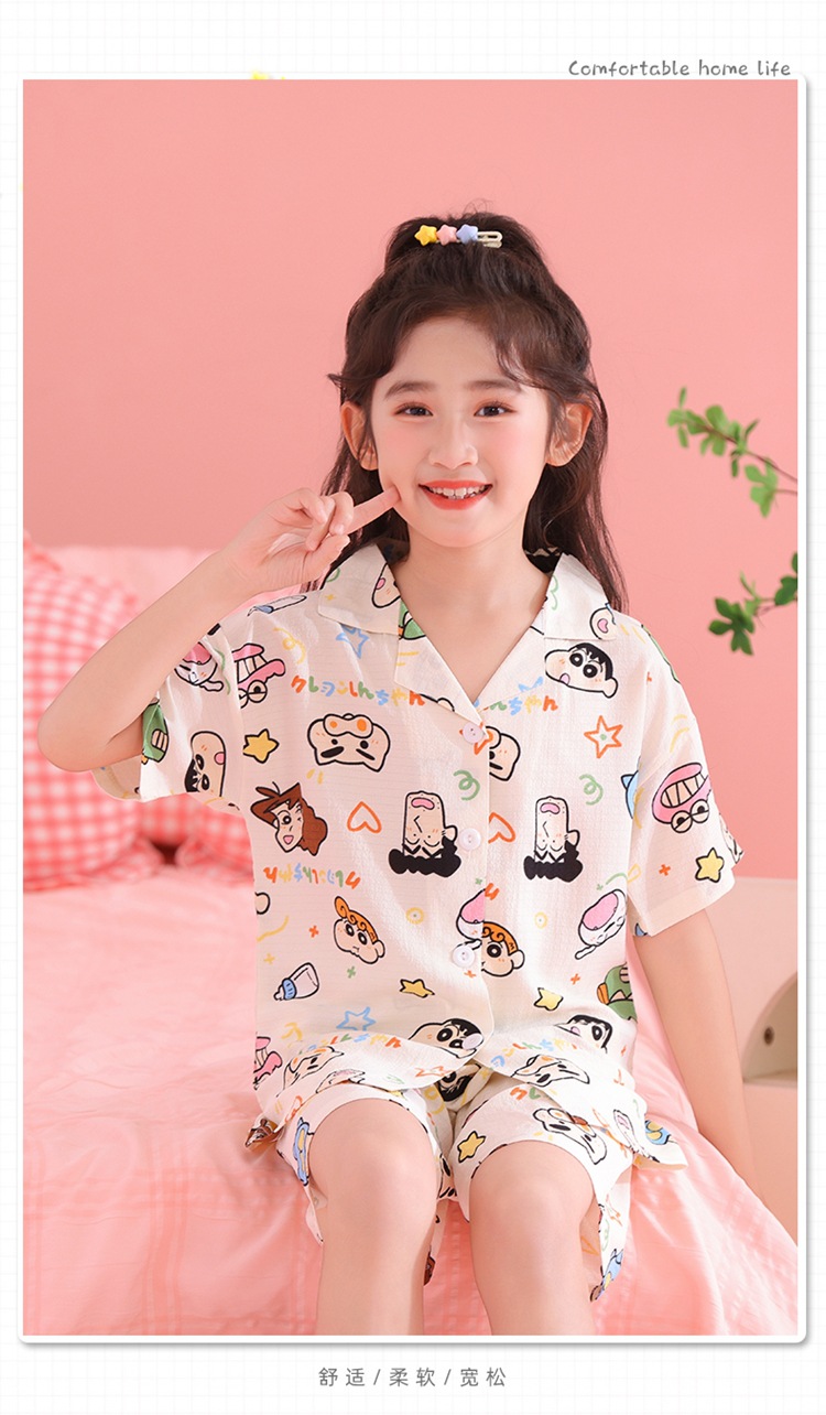 어린이 잠옷 옷깃 카디건 버블 코튼 소녀 만화 여름 반팔 반바지 중소형 및 대형 어린이 홈 의류 세트스토어 가기
