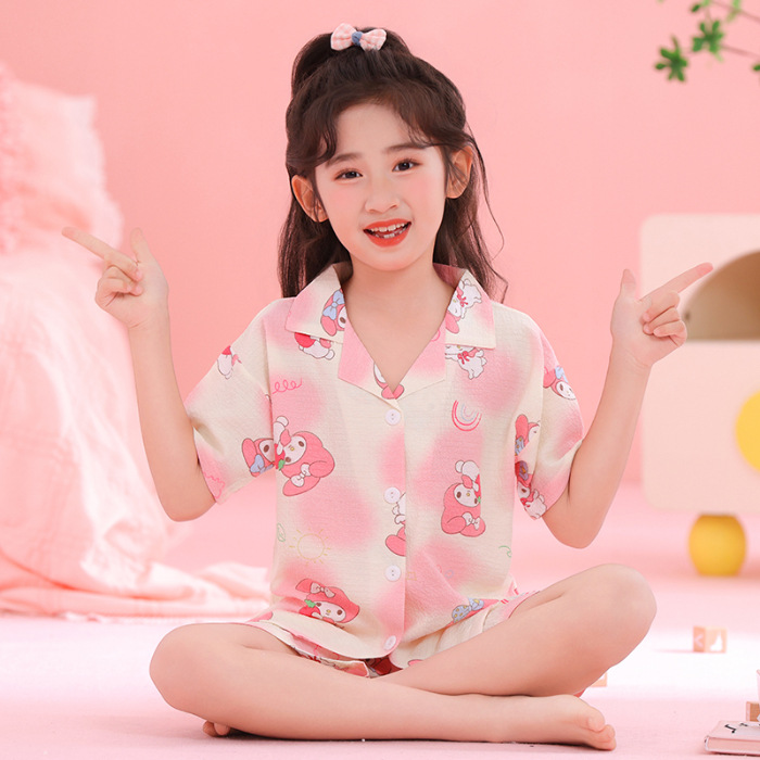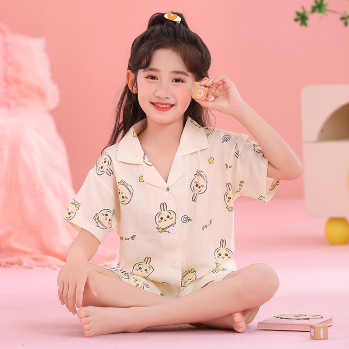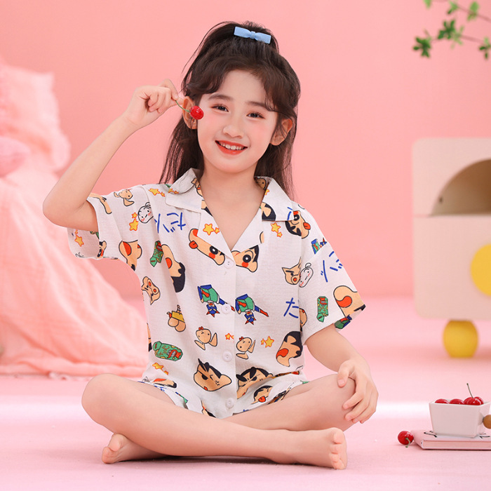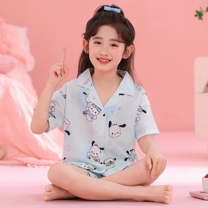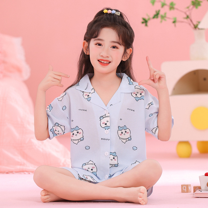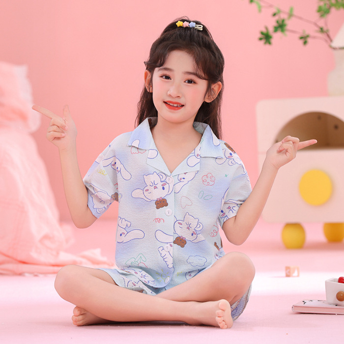 어린이 잠옷 옷깃 카디건 버블 코튼 소녀 만화 여름 반팔 반바지 중소형 및 대형 어린이 홈 의류 세트