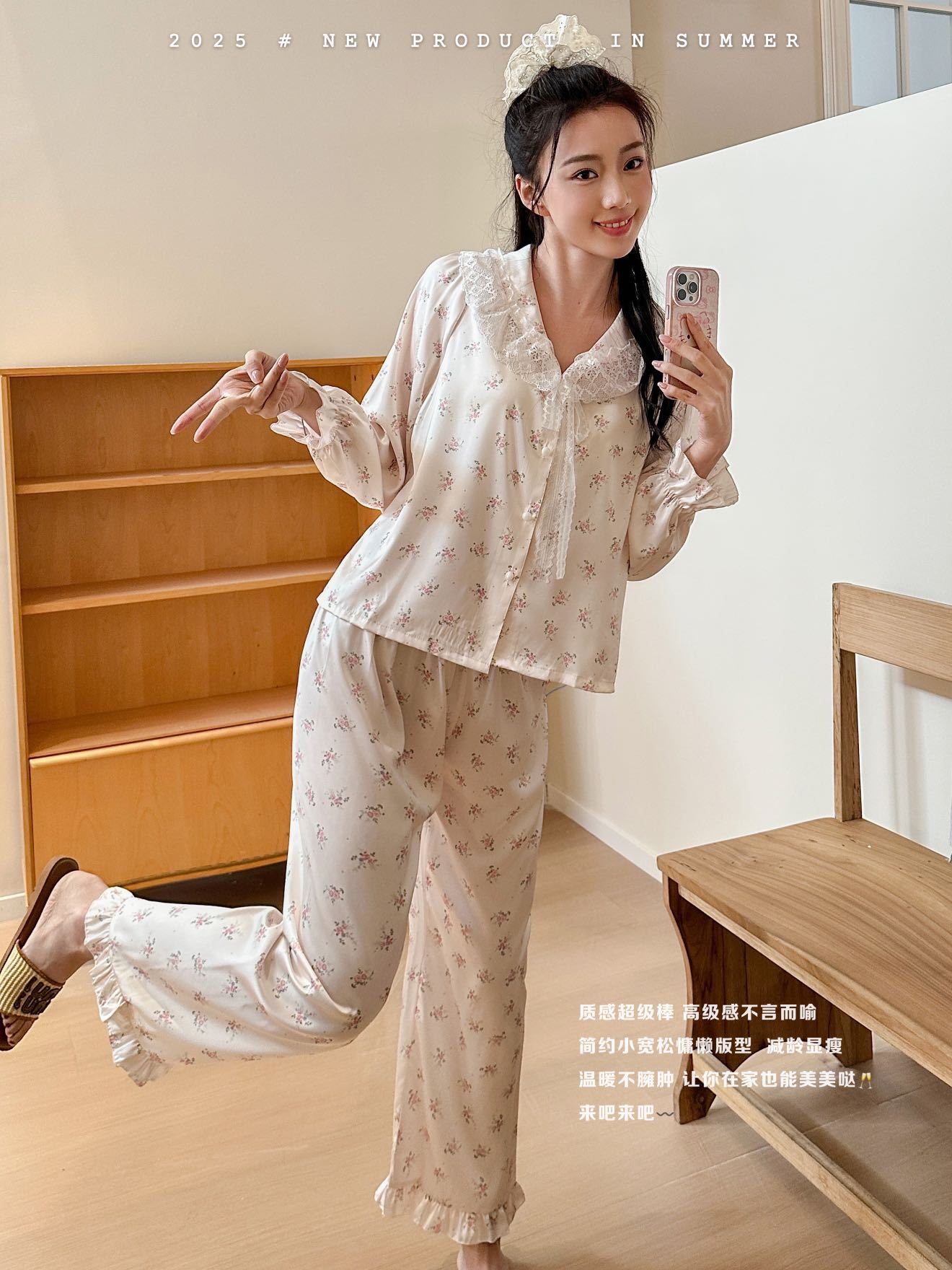 MADNONO 스위트 드림 아이스 실크 새틴 잠옷 여성용 가을 긴팔 홈웨어 여성용 외출복 아이스 느낌 새틴 꽃무늬스토어 가기