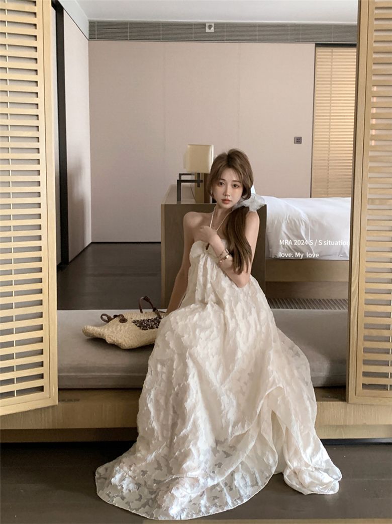 해변 홀리데이 스타일 백리스 넥 교수형 원피스 비치 원피스 가슴 패드 퓨어 할로우 롱 원피스 여성 이른 봄 A 라인 원피스스토어 가기