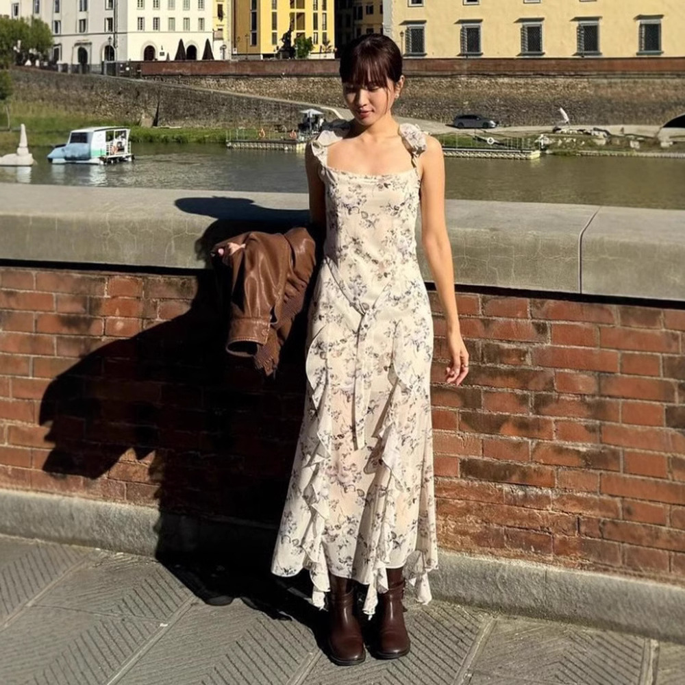 재고 있음 Zhao Meiyang의 같은 스타일 작은 꽃무늬 롱 드레스 2025 여름 여성 한국 스타일 레이스 업 민소매 롱 드레스스토어 가기
