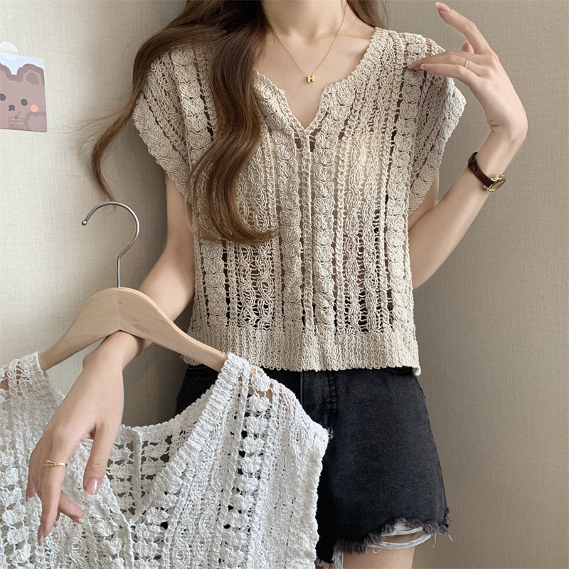 여성용 여름 신상 레트로 스타일 풀오버 후크플라워 레이스 아웃웨어 조끼 민소매 니트 탑