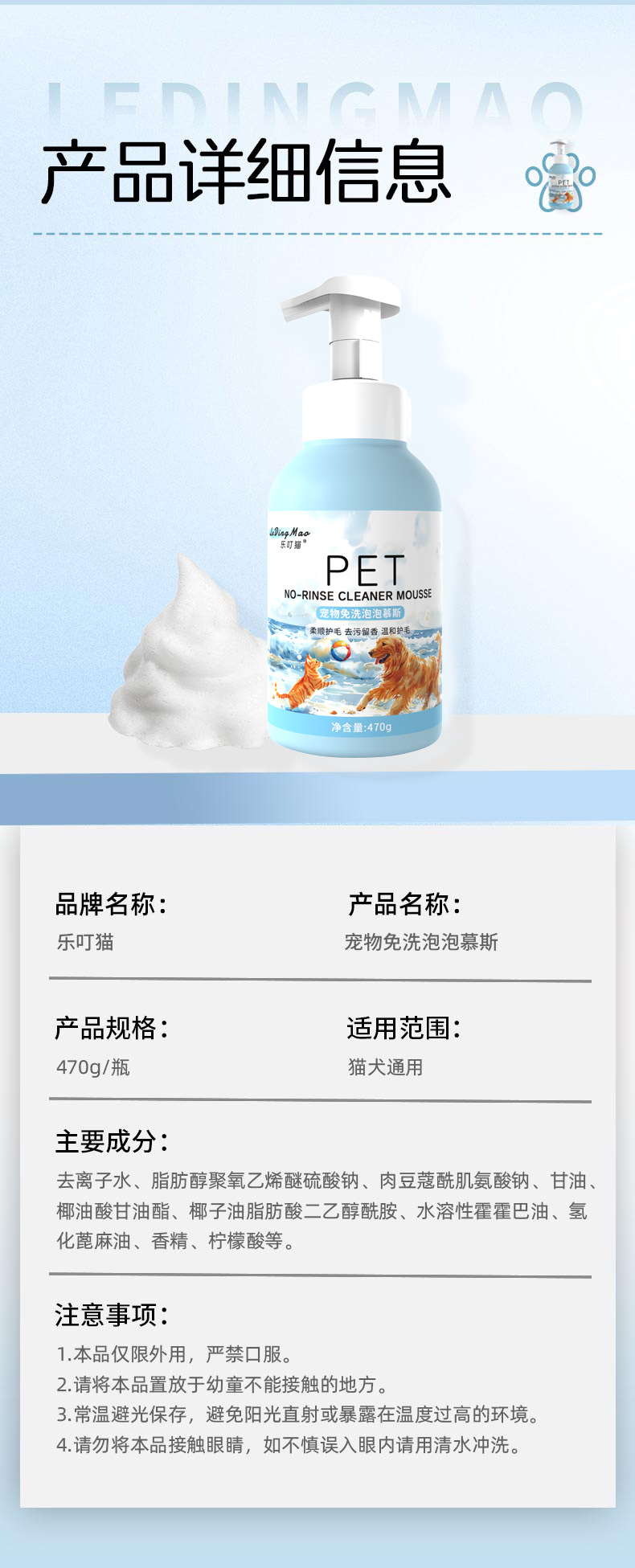애완동물 노워시 폼 강아지 고양이 세정 노워시 샤워 샴푸 헤어케어 탈취 고양이 강아지 드라이클리닝 폼 무스