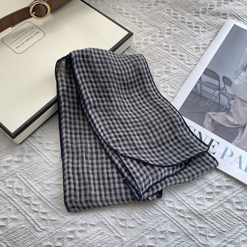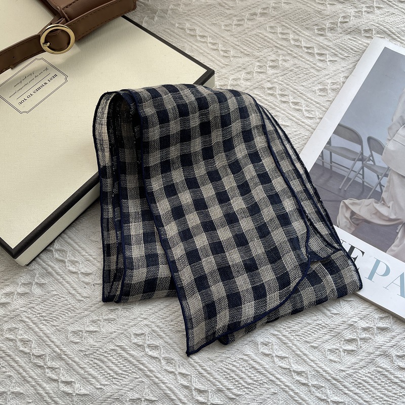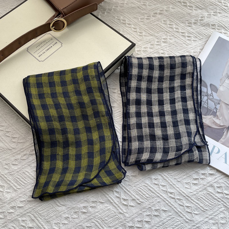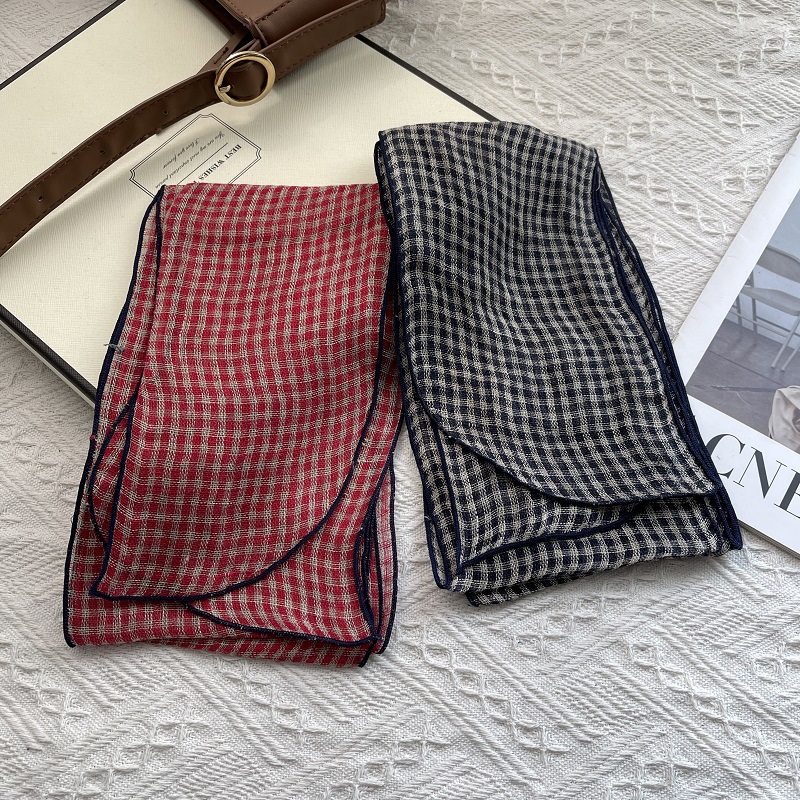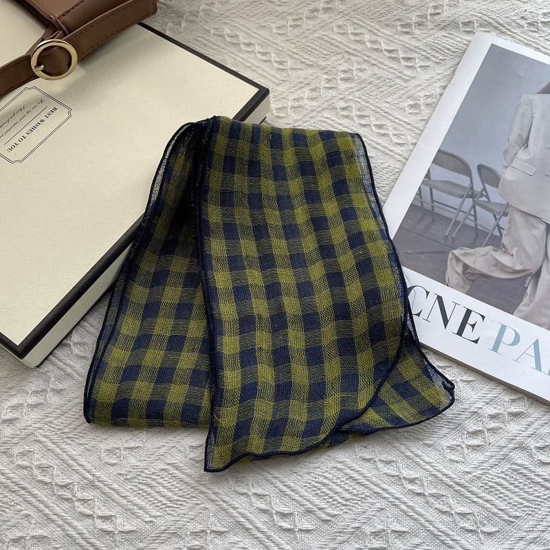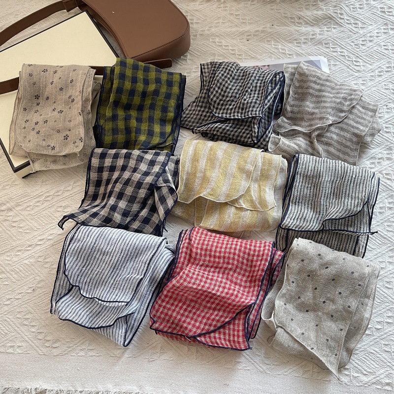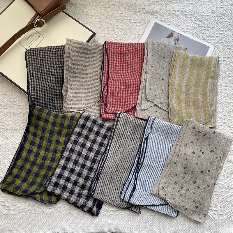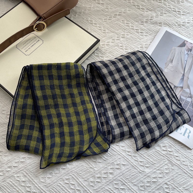 100% 순수 리넨 작은 긴 스카프 예술적 격자 무늬 게으른 캐주얼 작은 스카프 여성 여름 질감 통기성 스카프스토어 가기