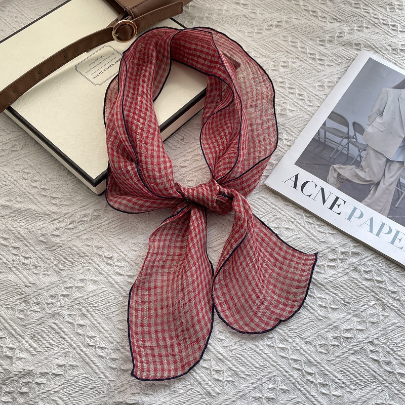 100% 순수 리넨 작은 긴 스카프 예술적 격자 무늬 게으른 캐주얼 작은 스카프 여성 여름 질감 통기성 스카프