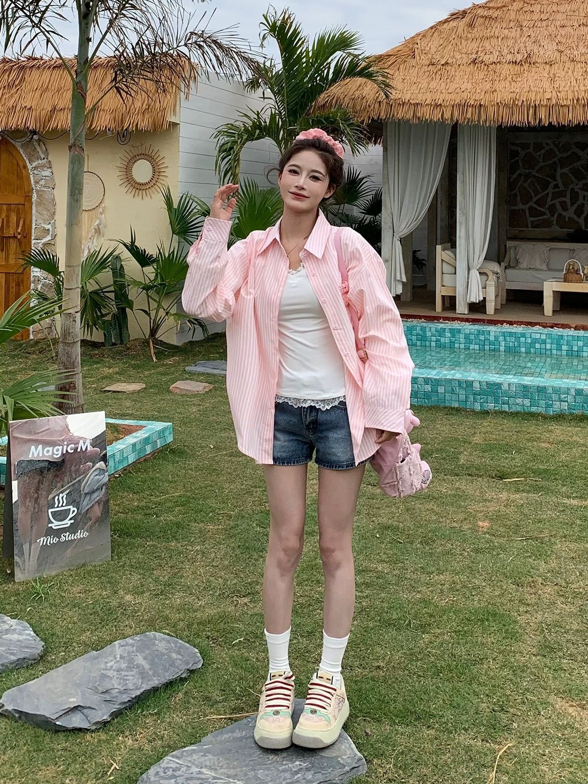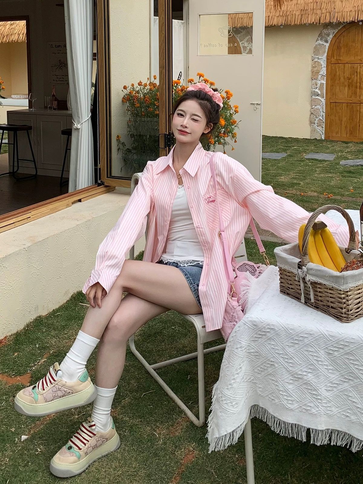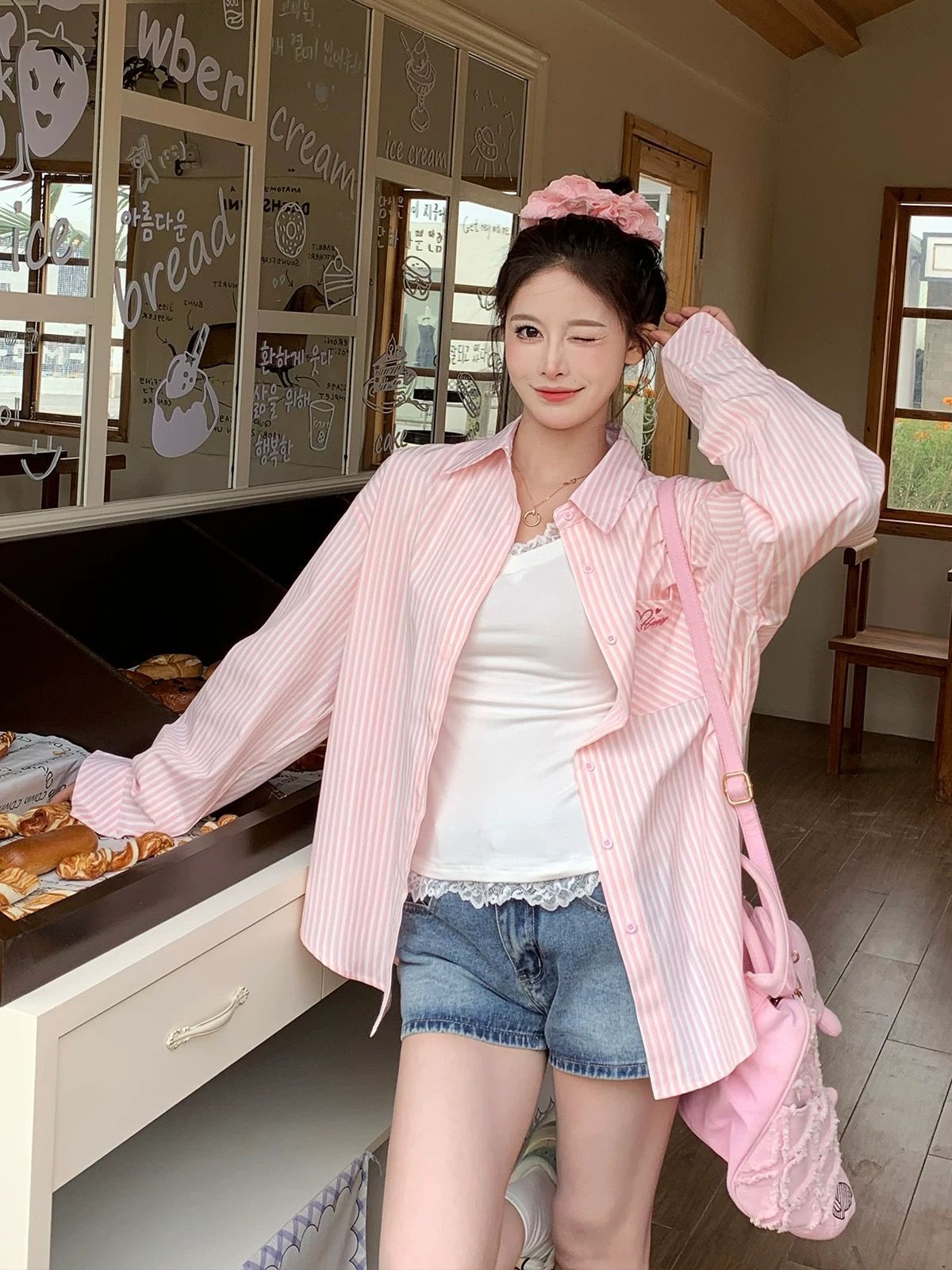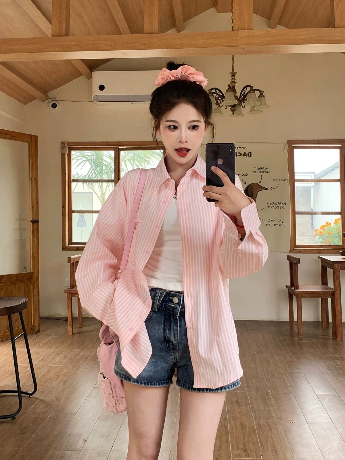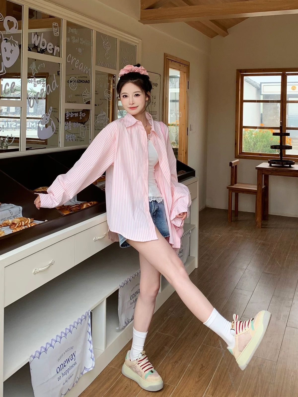 국경 간 핑크 줄무늬 셔츠 카디건 코트 봄 복장 여성 봄 봄 소매 썬 스크린 셔츠 디자인 센스 탑스토어 가기