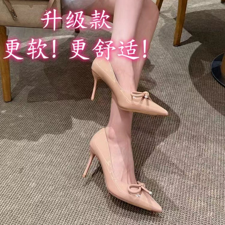 2025 년 이른 봄 새로운 지적 특허 가죽 빨간 활 하이힐 여성 스틸레토 힐 섹시한 전문 통근 신발 여름스토어 가기