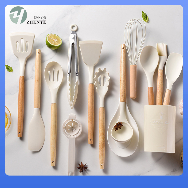 ✅가벼운 버전 750g 실리콘 주방 용품 세트 나무 손잡이 14 개 세트 주방 도구 요리 삽 숟가락 세트 14 개 세트