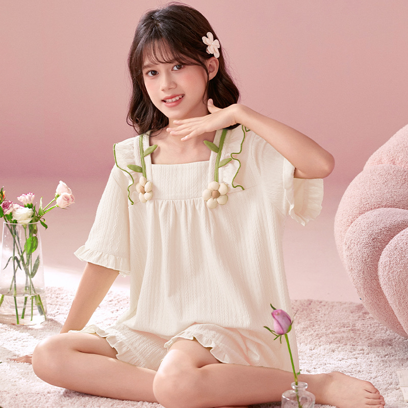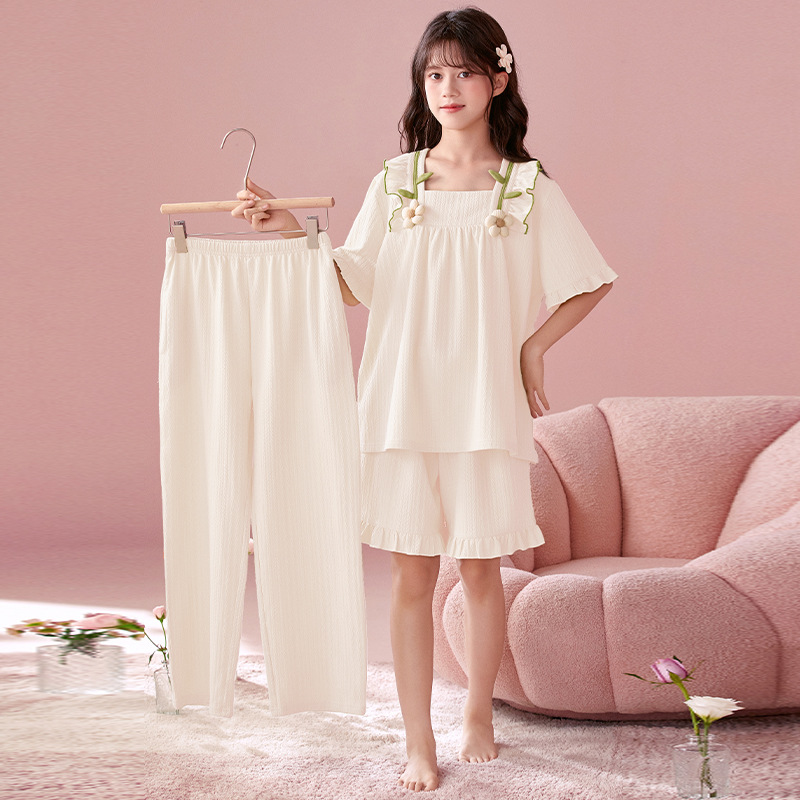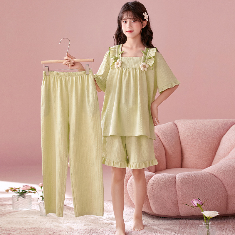 소녀 잠옷 반팔 바지 귀여운 공주 스타일 얇은 봄과 여름 옷 학생과 어머니와 딸을위한 3 피스 홈 옷스토어 가기