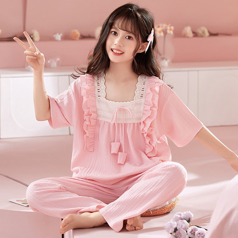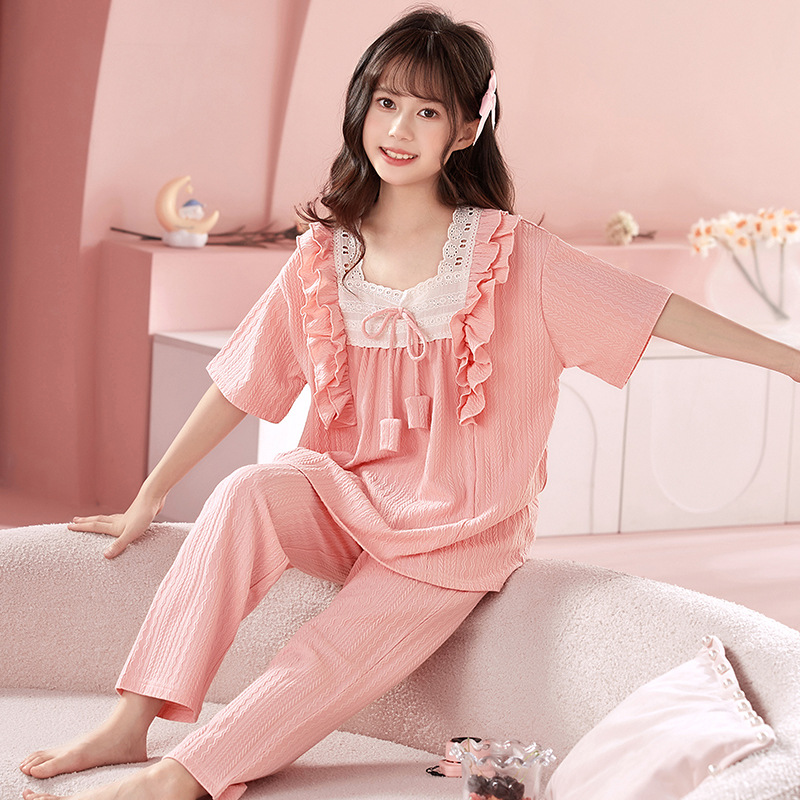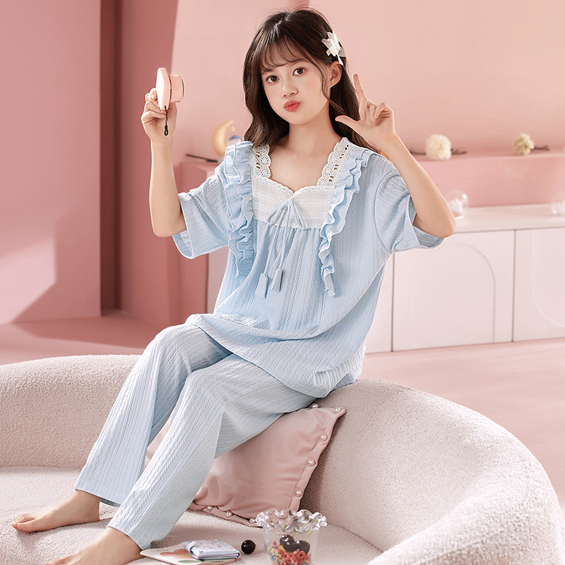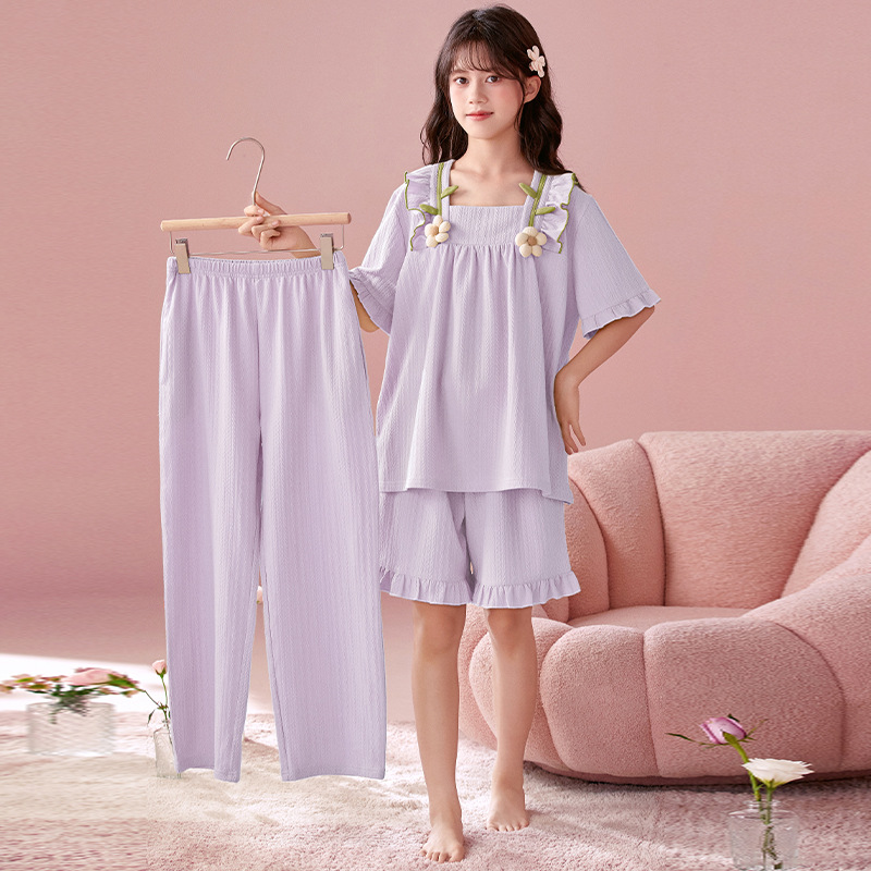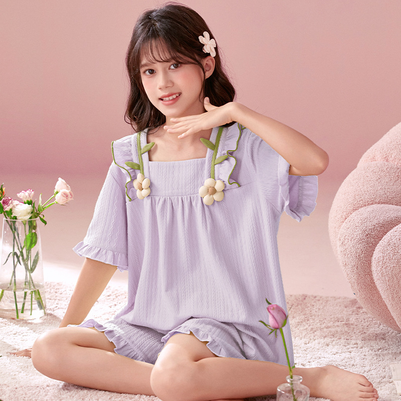 소녀 잠옷 반팔 바지 귀여운 공주 스타일 얇은 봄과 여름 옷 학생과 어머니와 딸을위한 3 피스 홈 옷