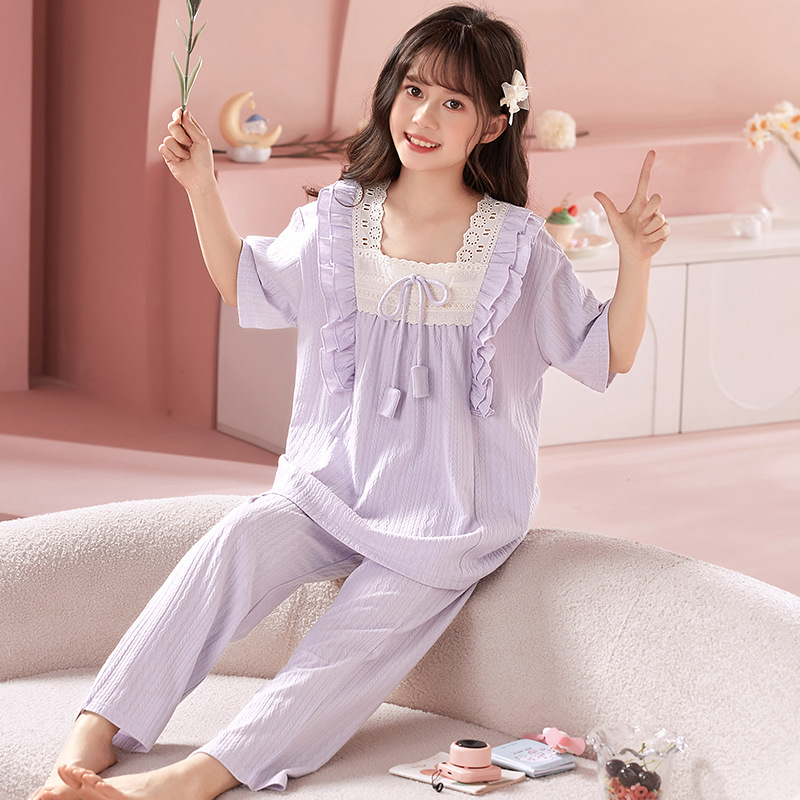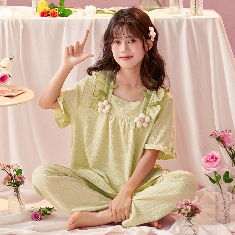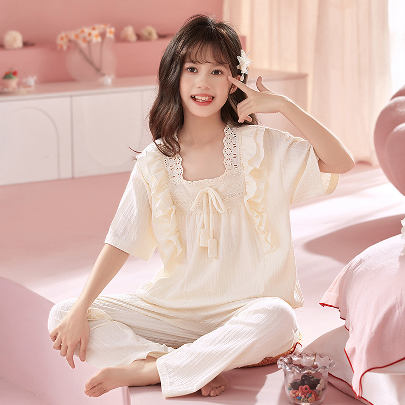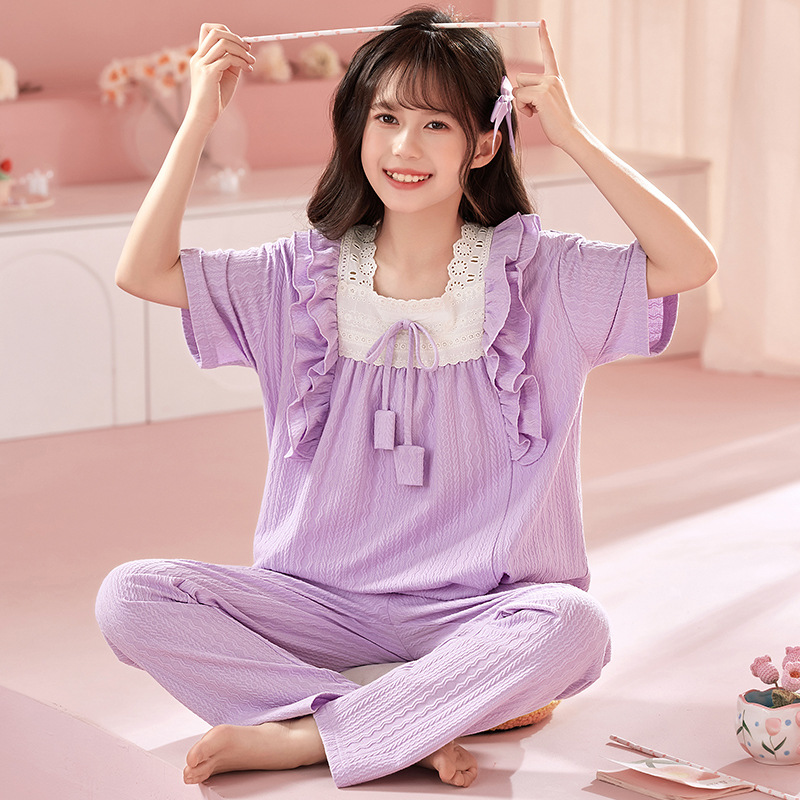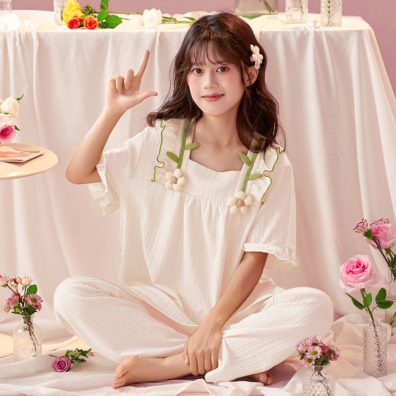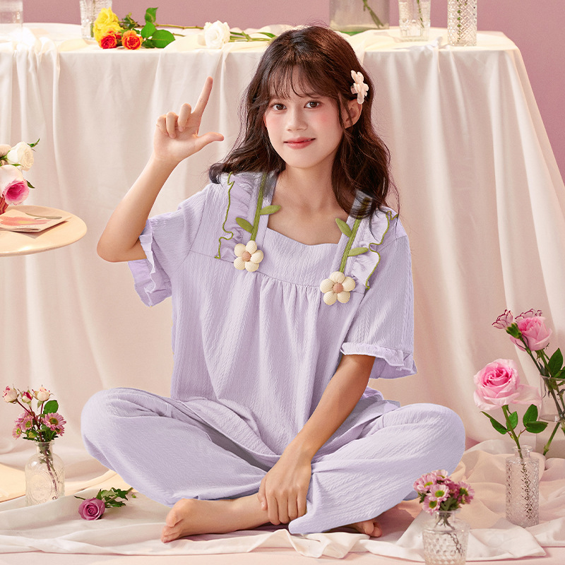 소녀 잠옷 반팔 바지 귀여운 공주 스타일 얇은 봄과 여름 옷 학생과 어머니와 딸을위한 3 피스 홈 옷