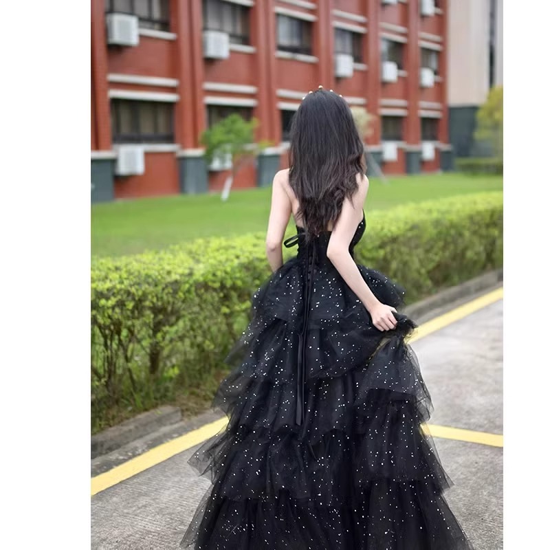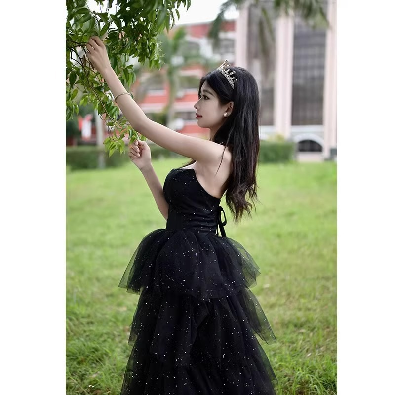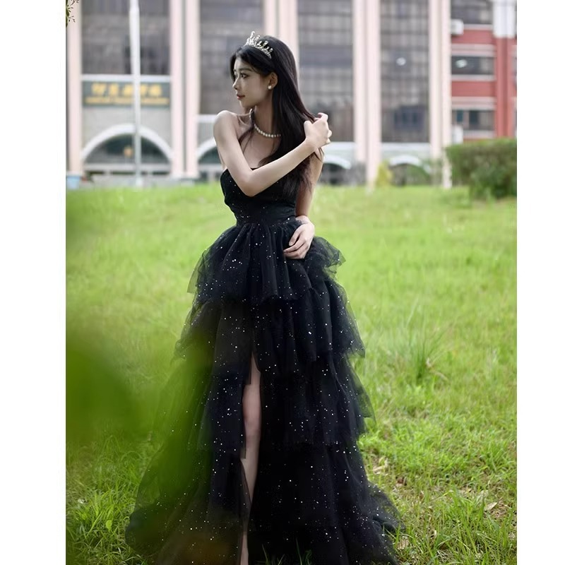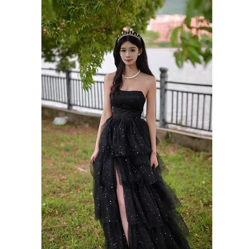 여성을위한 검은 이브닝 드레스 2025 새로운 하이 엔드 예술 시험 학생의 날 성인식 요정 기질 연회 튜브 탑 드레스 여름스토어 가기