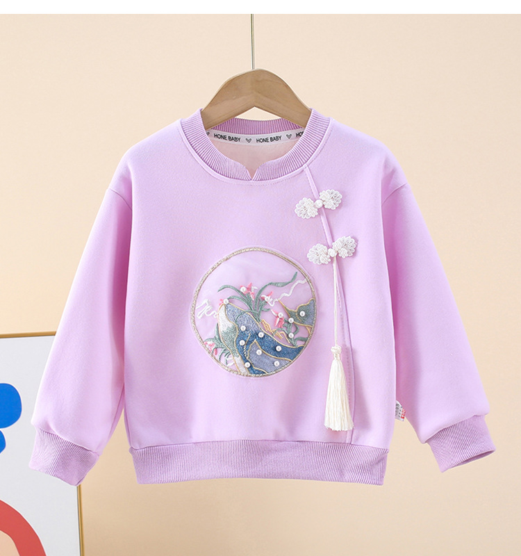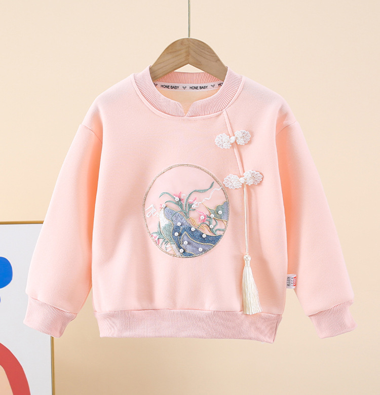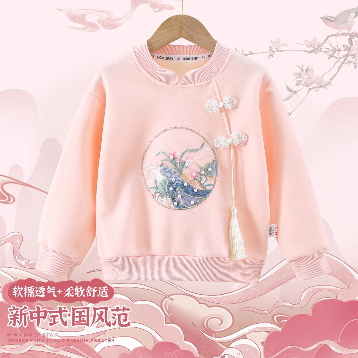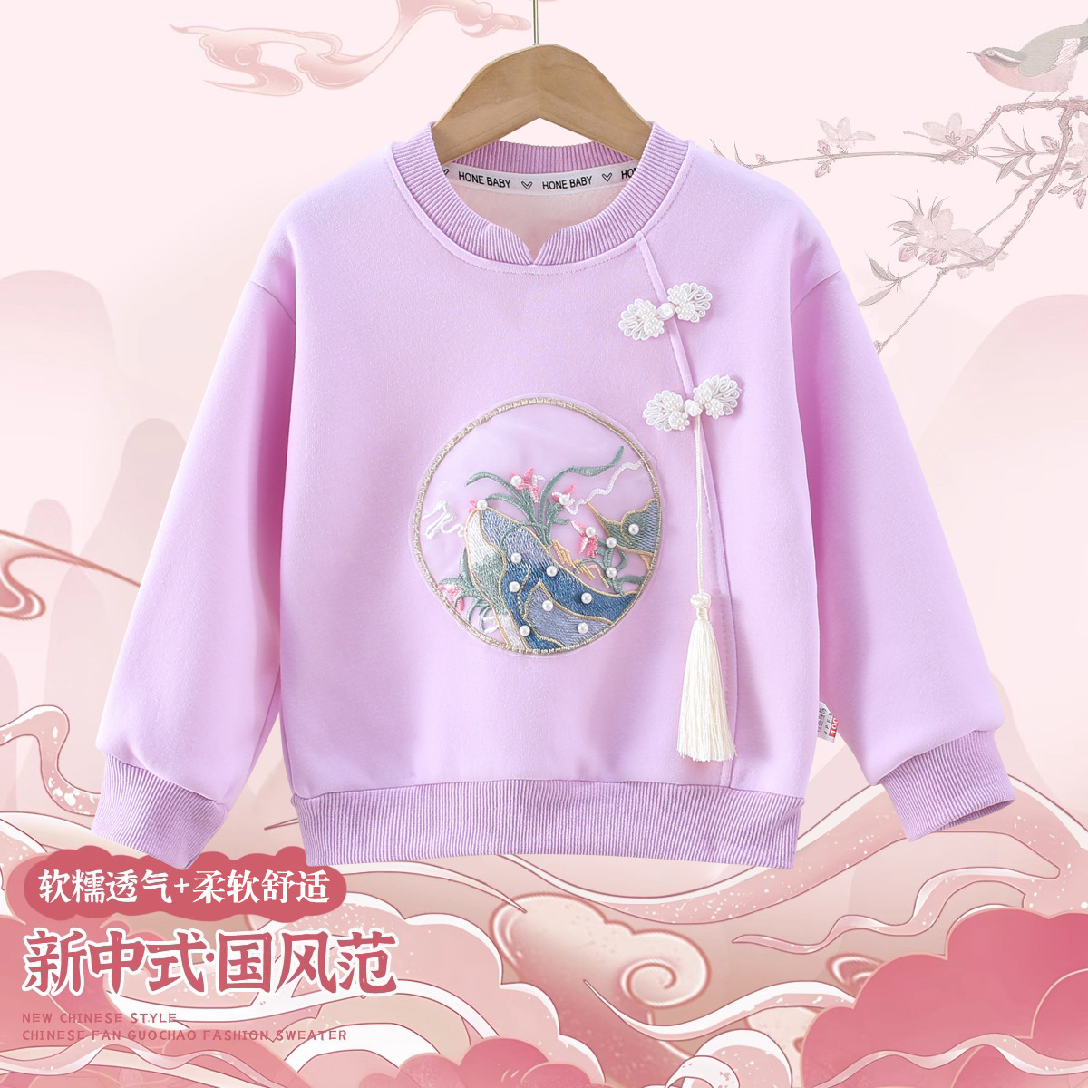 소녀 국가 스타일 새로운 중국 스타일 스웨트 셔츠 2025 봄과 가을 새로운 소녀 큰 소년의 버클 자수 어린이 서양식 봄 탑스토어 가기