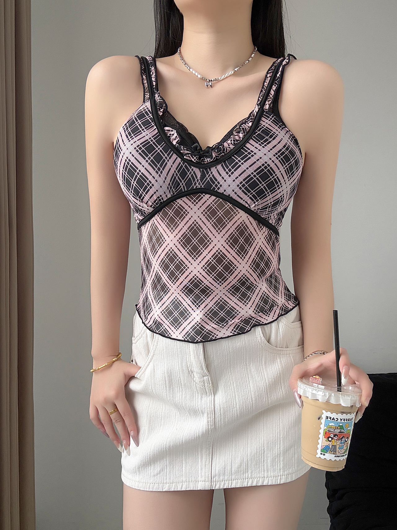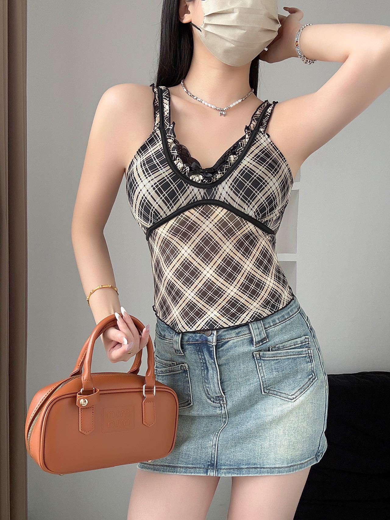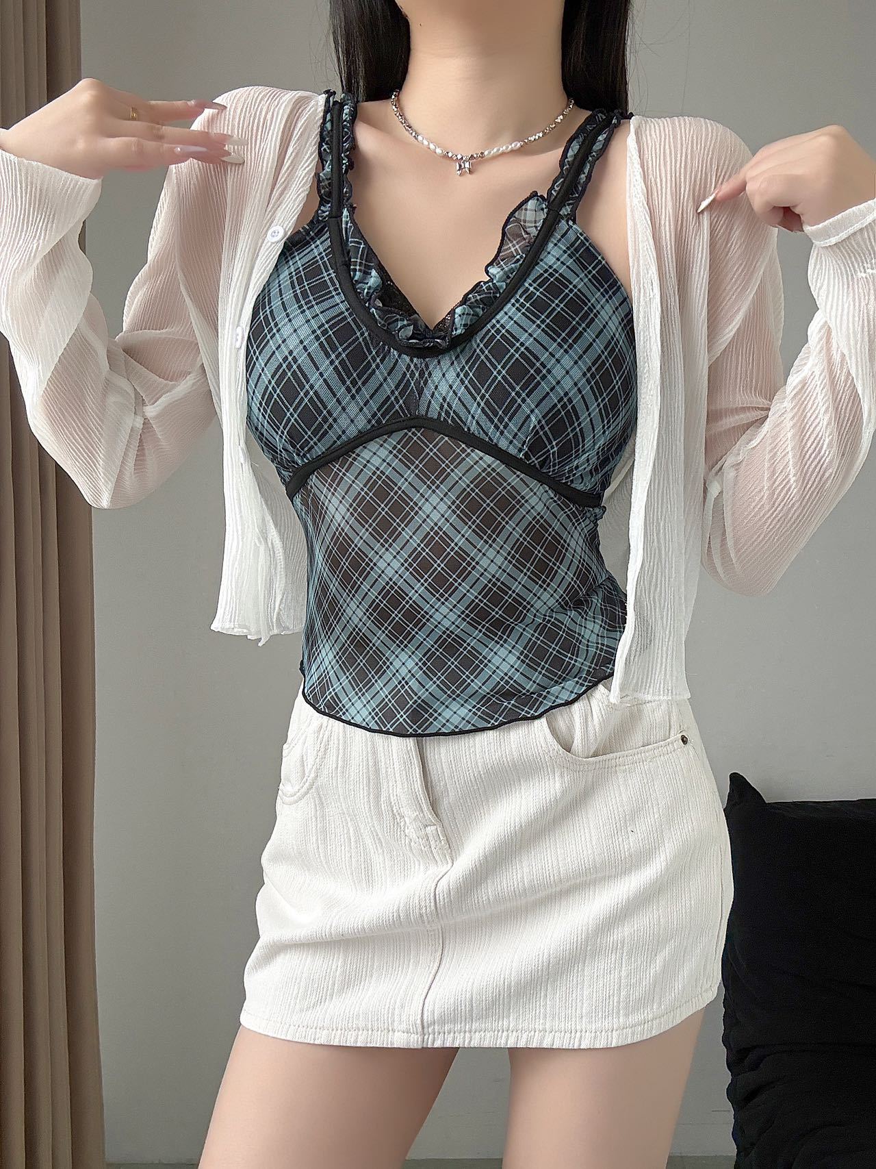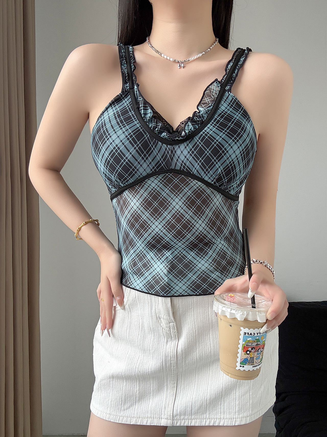 1825 # 새로운 스타일 체크 무늬 섹시 작은 카미 솔 조끼 여성의 간단한 외투 보팅 튜브 탑 아름다운 백 패션 고정 컵스토어 가기