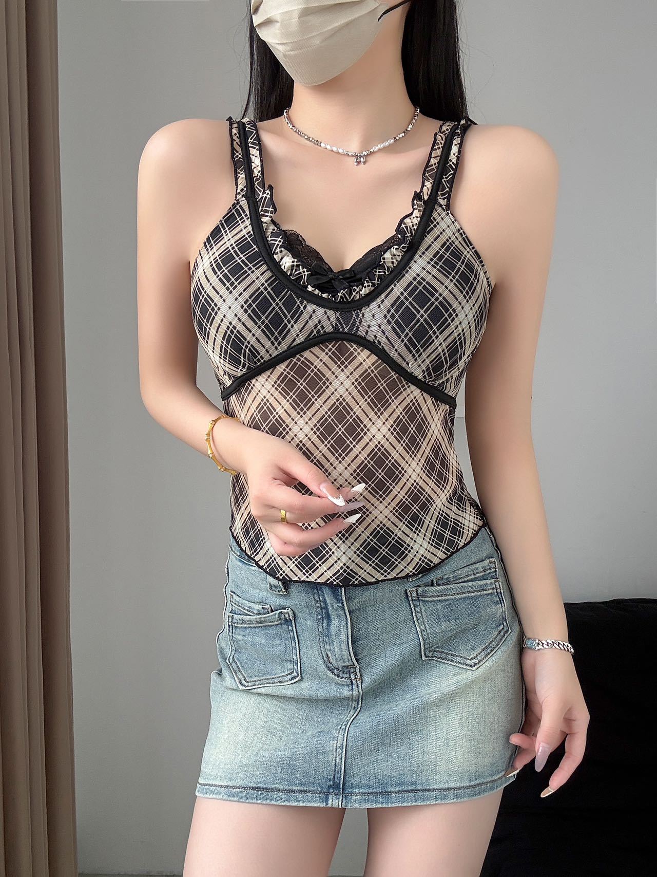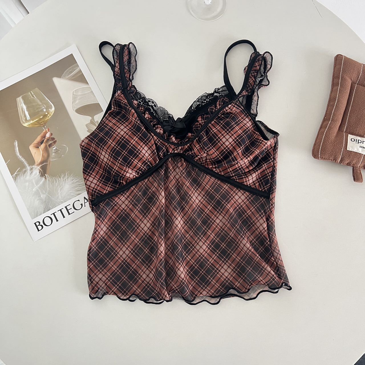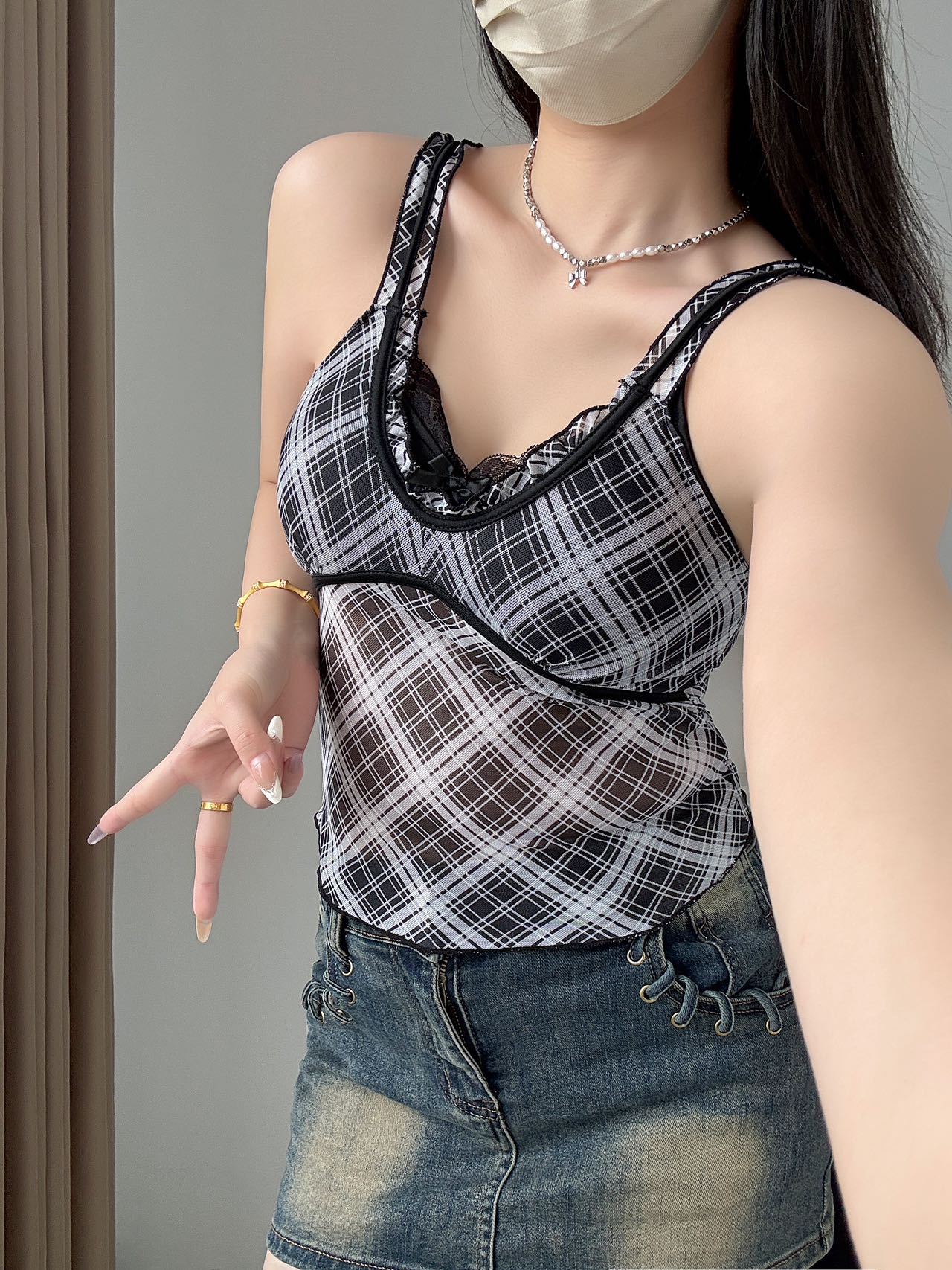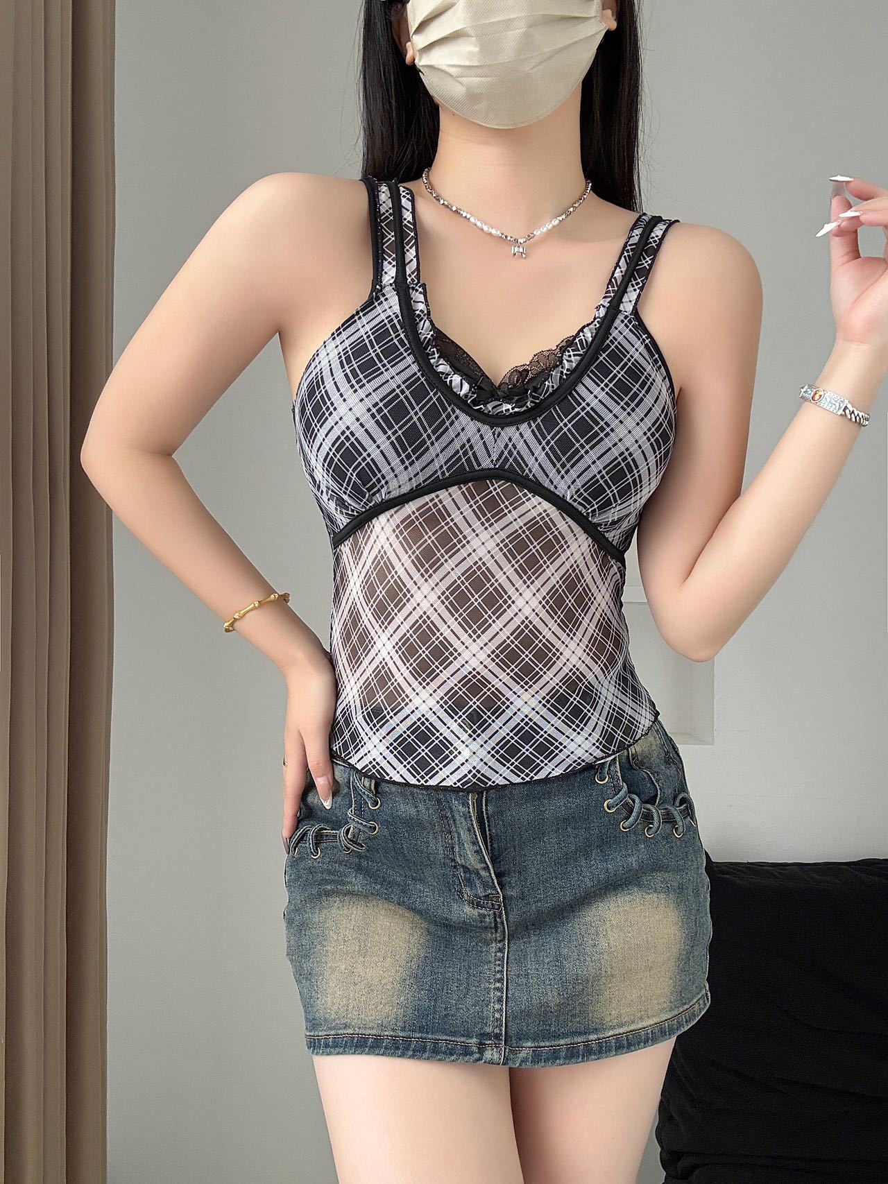 1825 # 새로운 스타일 체크 무늬 섹시 작은 카미 솔 조끼 여성의 간단한 외투 보팅 튜브 탑 아름다운 백 패션 고정 컵스토어 가기