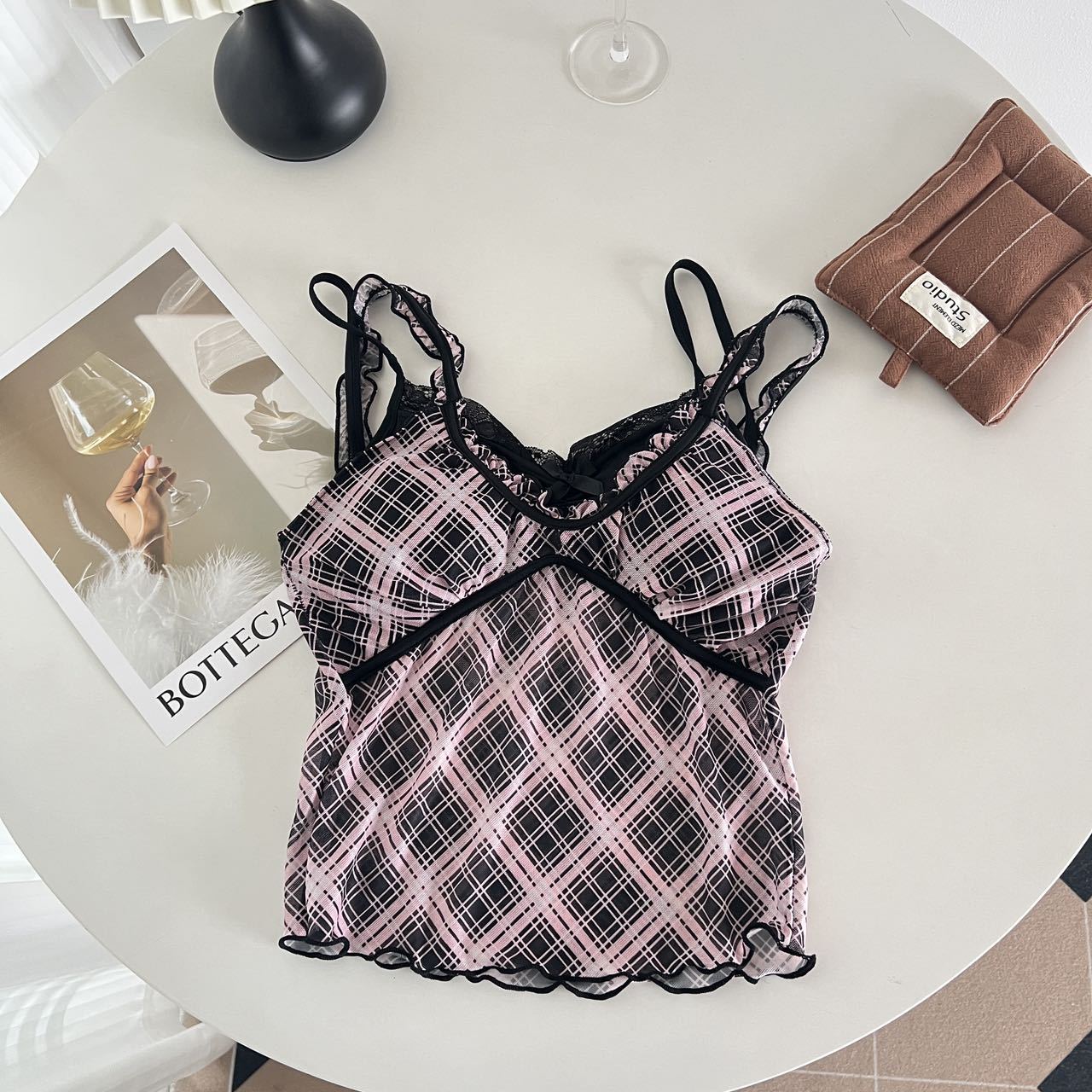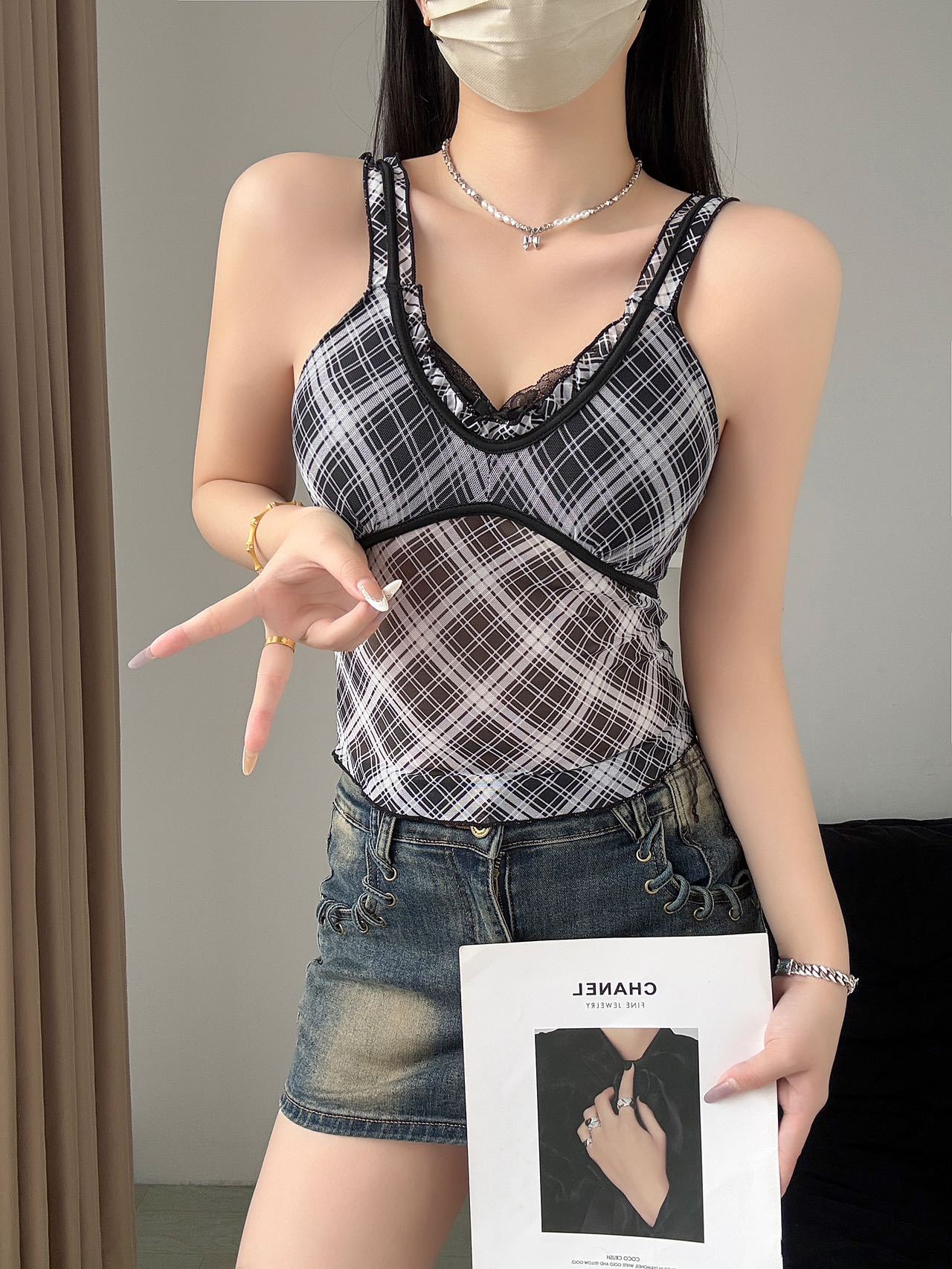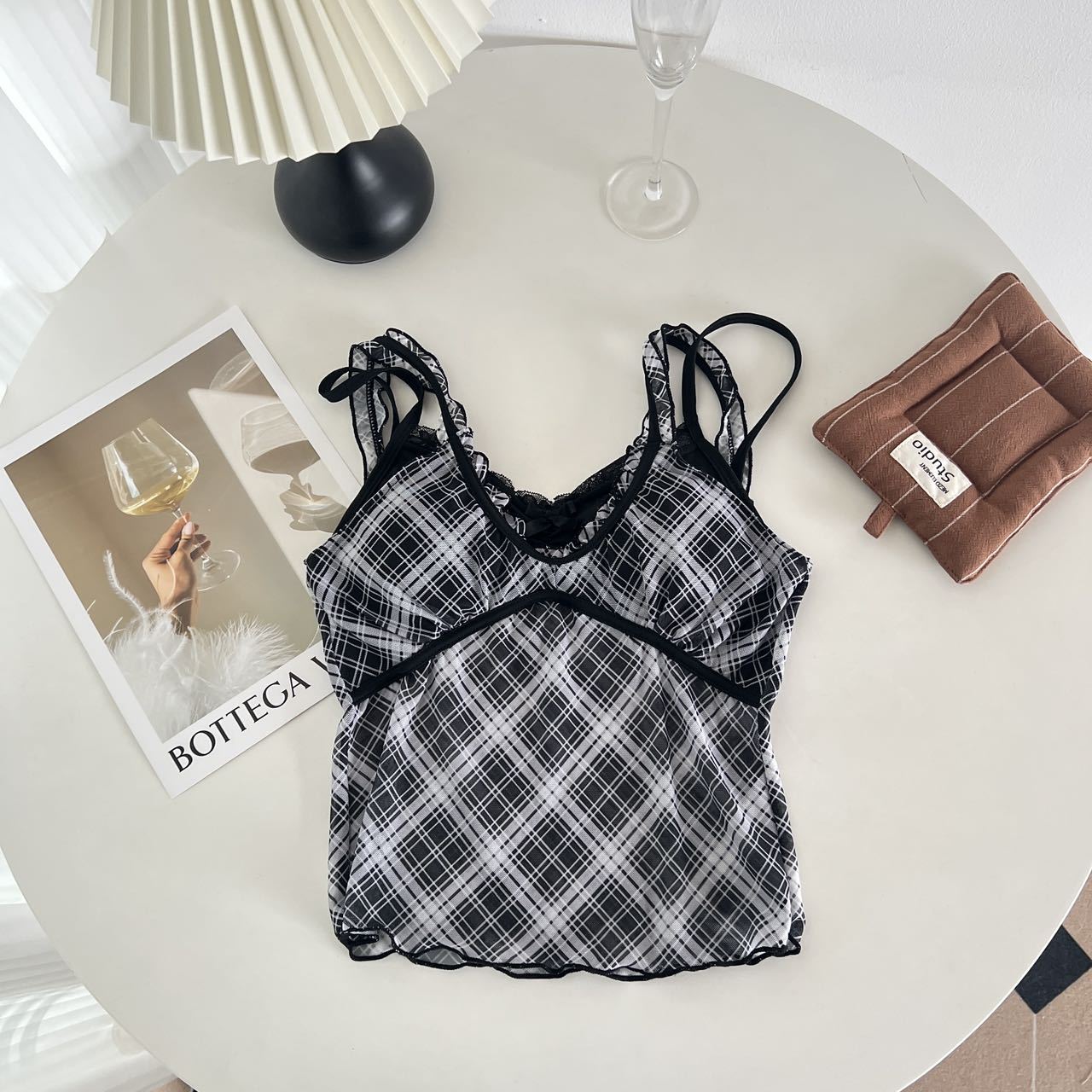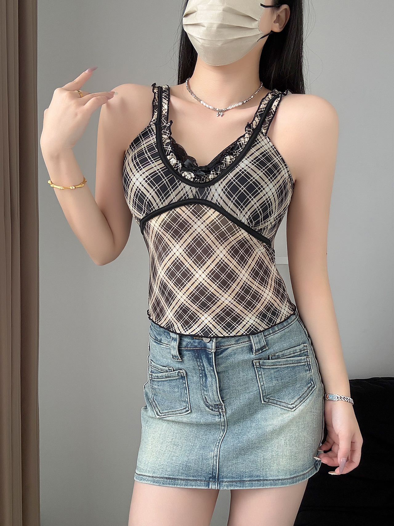 1825 # 새로운 스타일 체크 무늬 섹시 작은 카미 솔 조끼 여성의 간단한 외투 보팅 튜브 탑 아름다운 백 패션 고정 컵스토어 가기