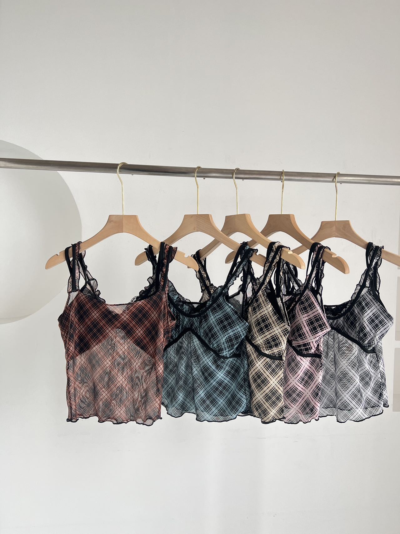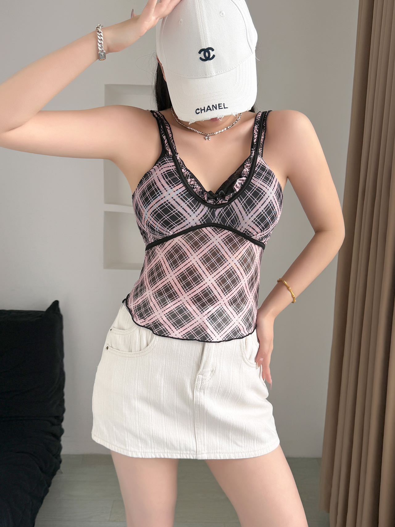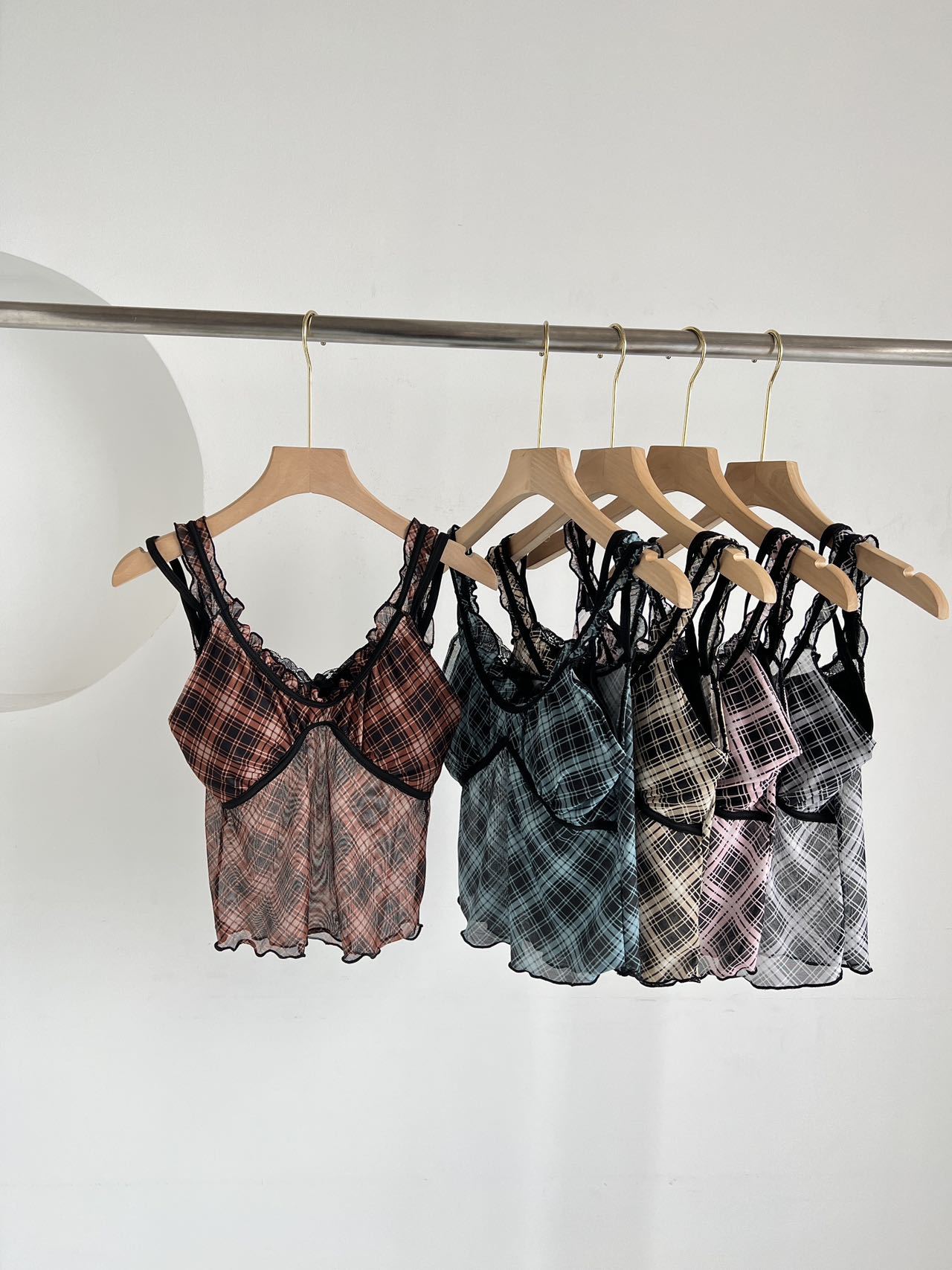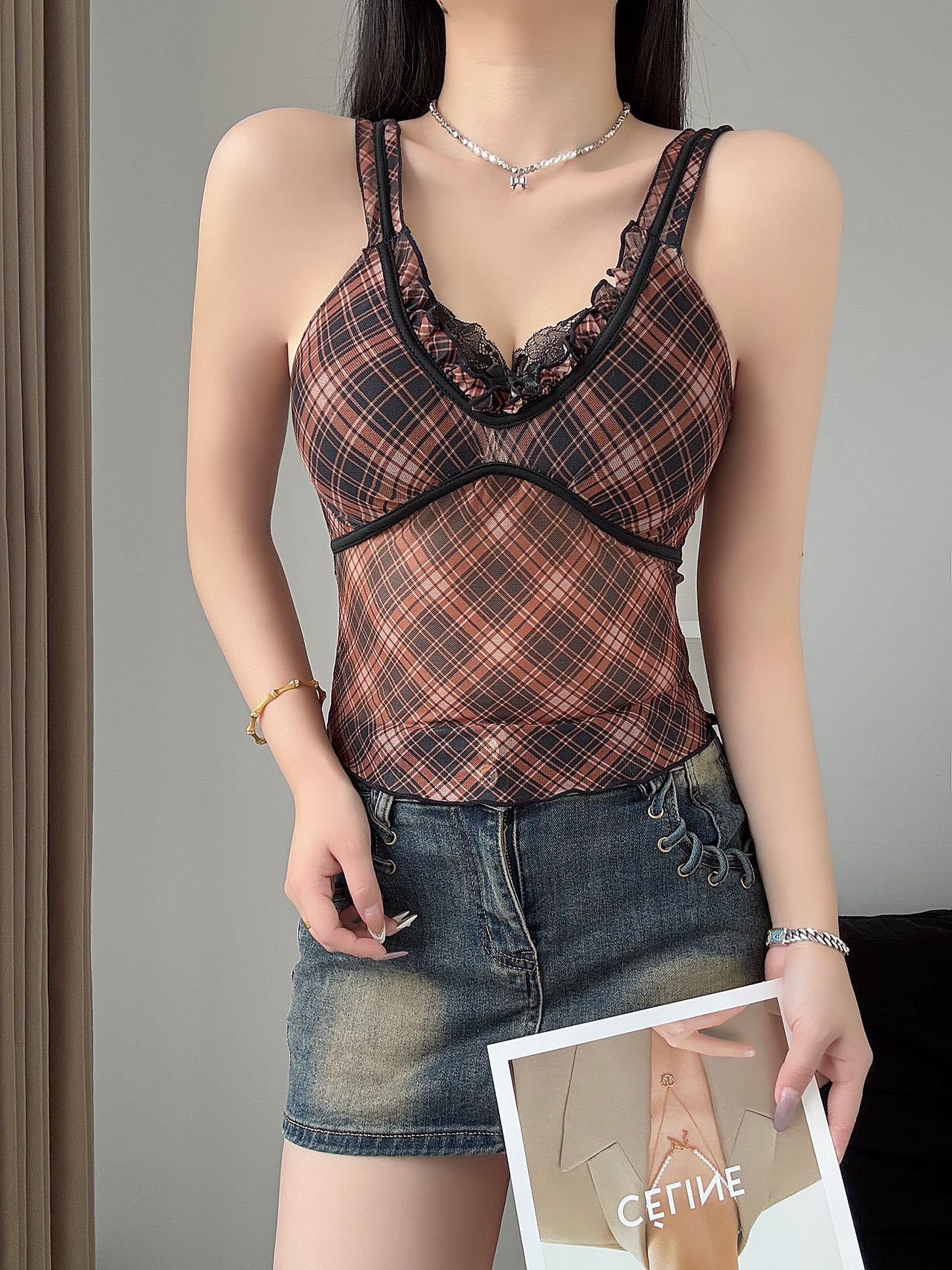 1825 # 새로운 스타일 체크 무늬 섹시 작은 카미 솔 조끼 여성의 간단한 외투 보팅 튜브 탑 아름다운 백 패션 고정 컵스토어 가기