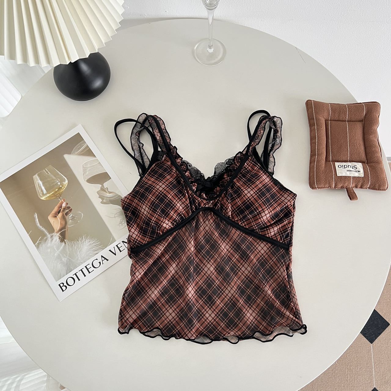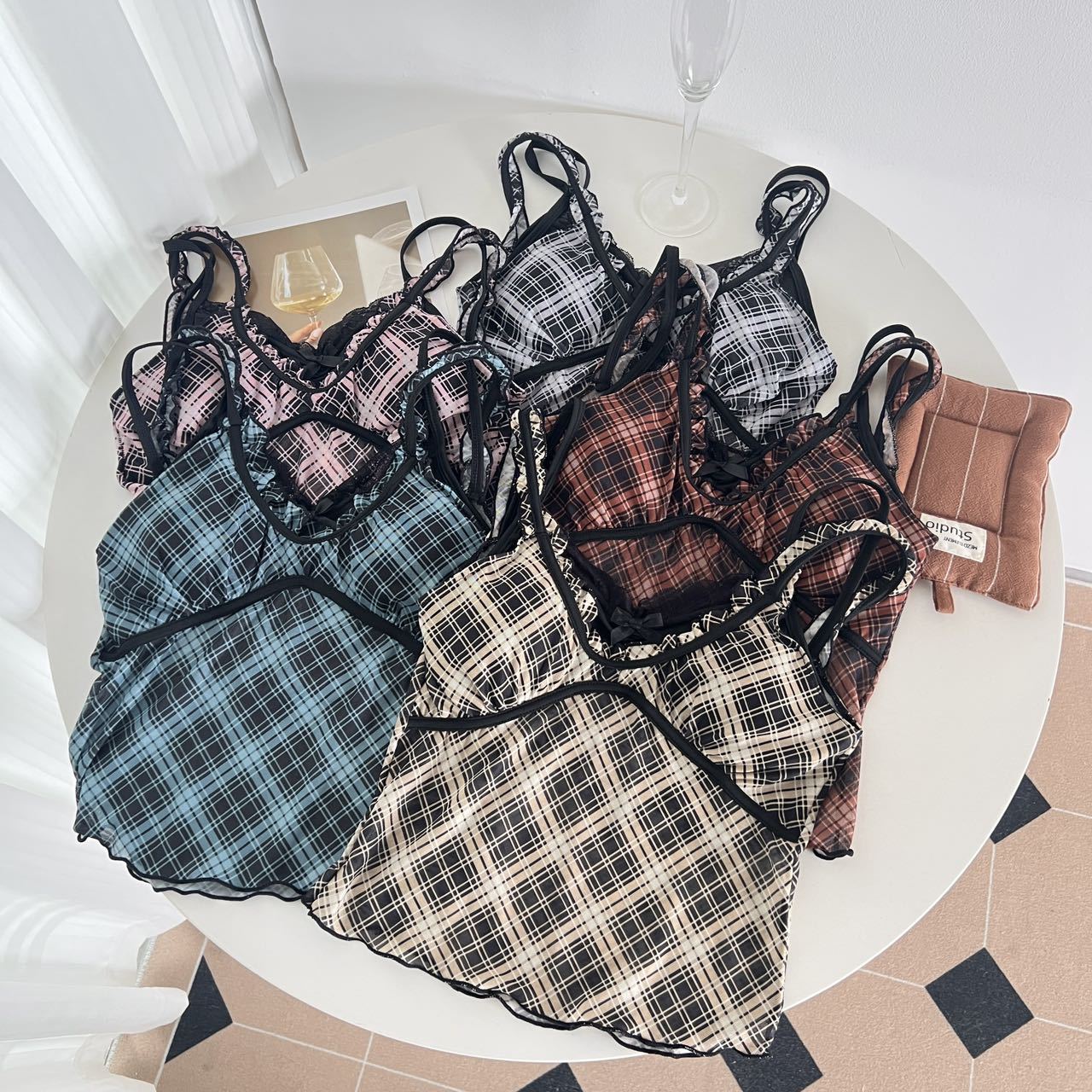 1825 # 새로운 스타일 체크 무늬 섹시 작은 카미 솔 조끼 여성의 간단한 외투 보팅 튜브 탑 아름다운 백 패션 고정 컵