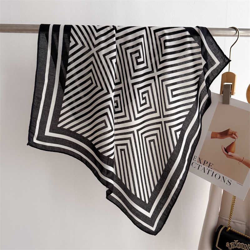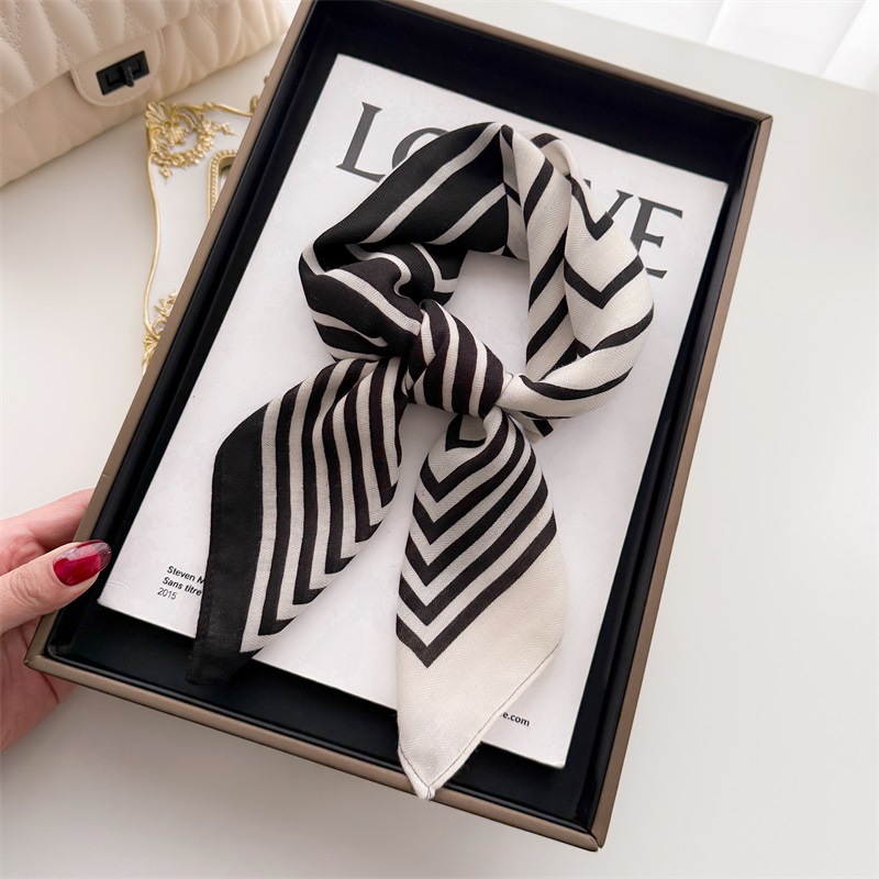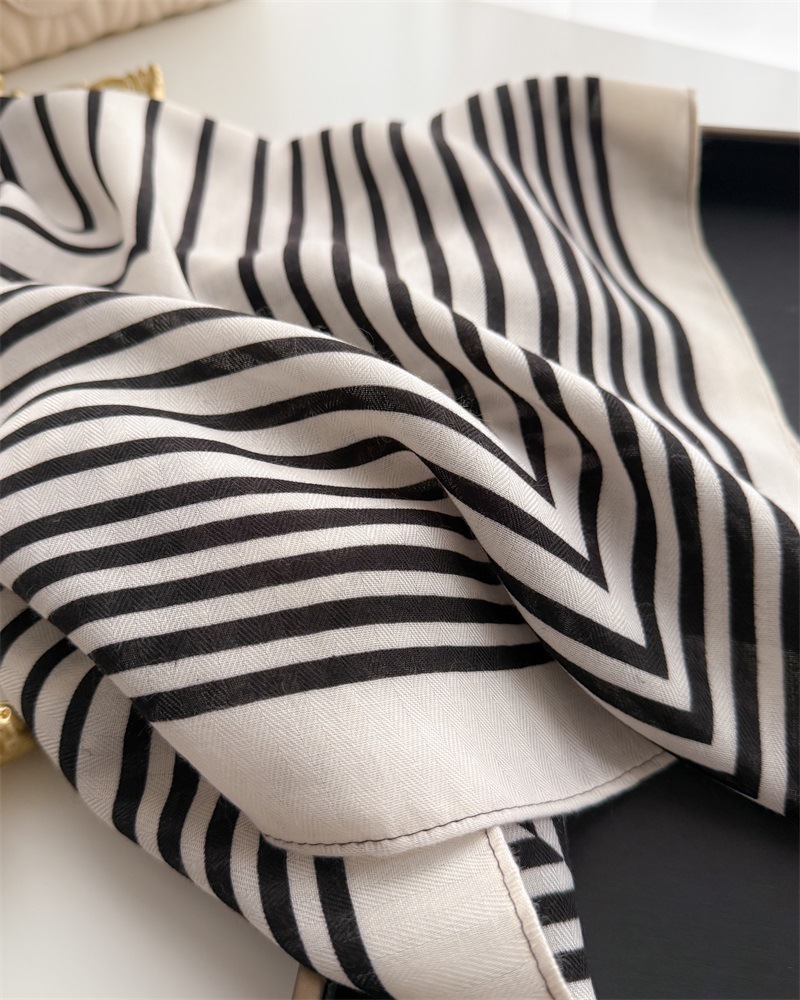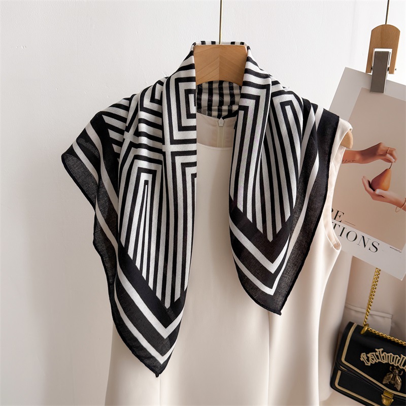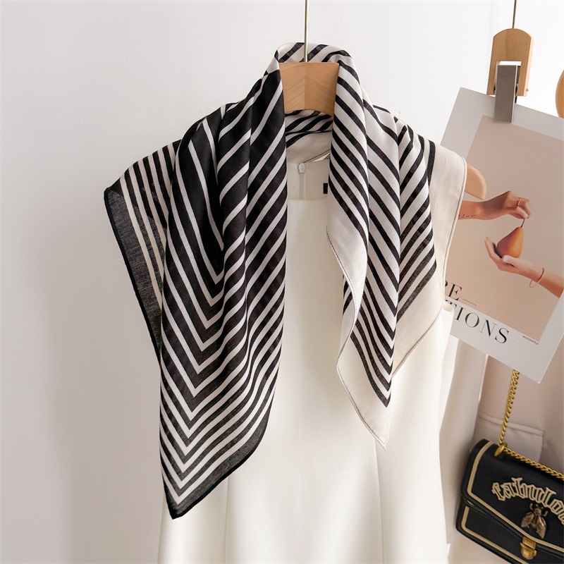 봄과 가을에 인기 있는 스트라이프 프린트 70% 면과 린넨 소재의 작은 스카프, 패셔너블하고 다용도로 활용 가능한 방풍 및 자외선 차단 기능의 전문직 OL용 스카프