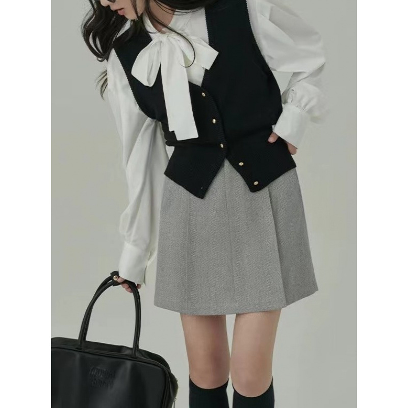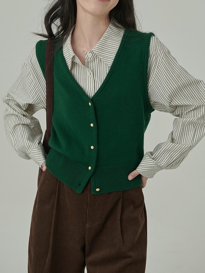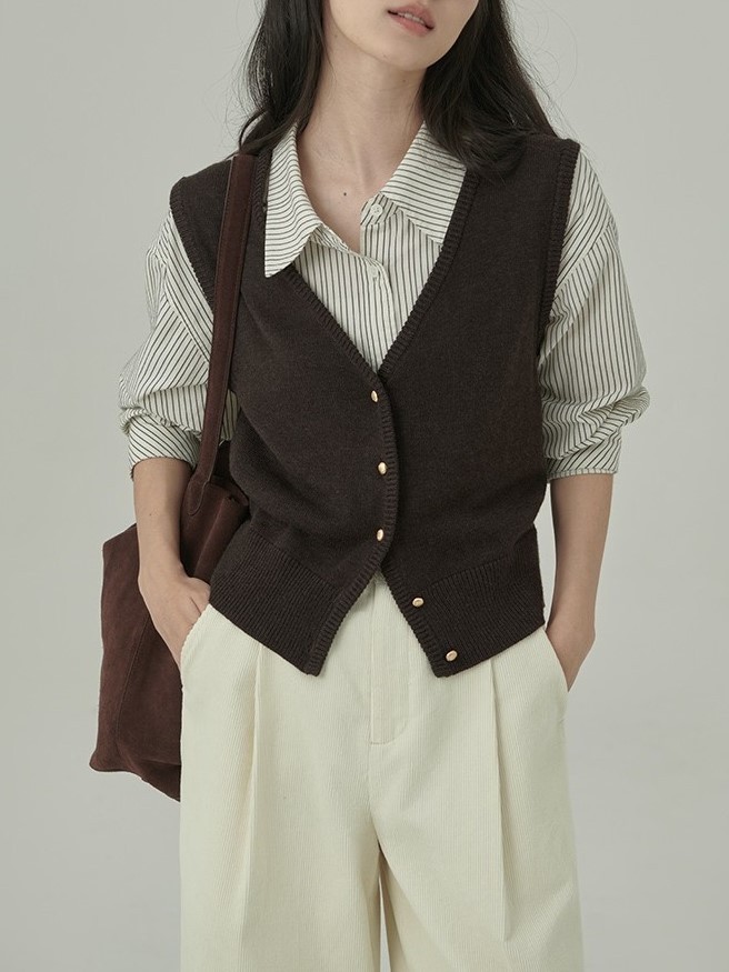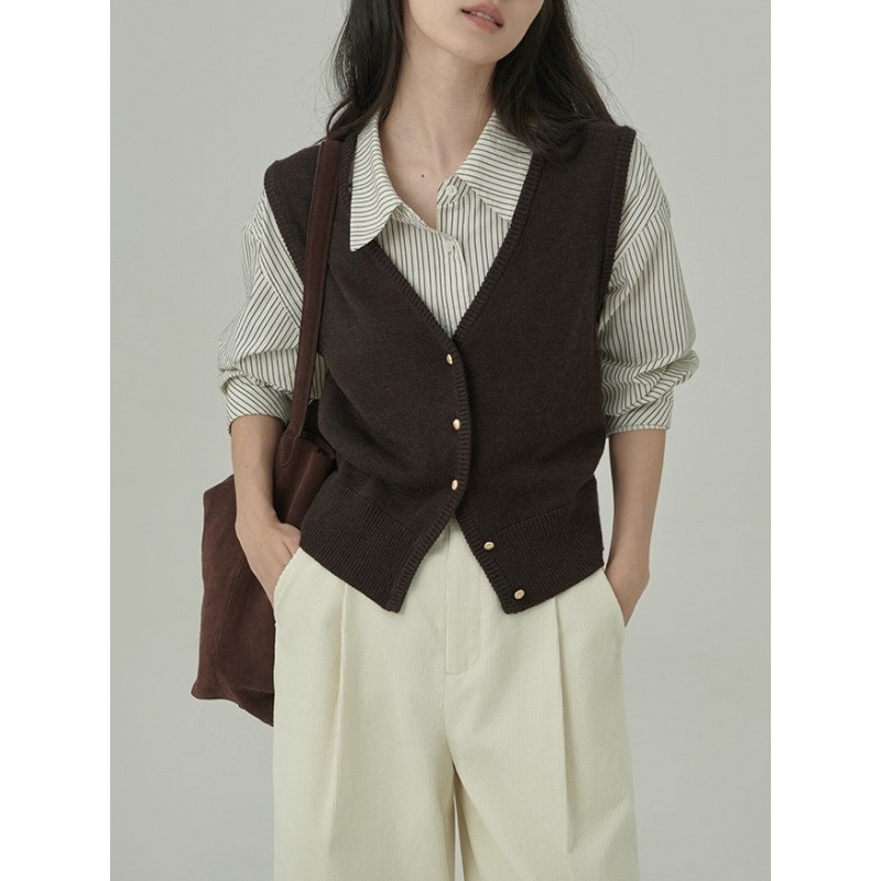 빈티지 다크 브라운 조끼 여성 봄과 가을 2025 새로운 쌓인 니트 카디건 슬리밍 V-Neck (Vest Waistcoat)