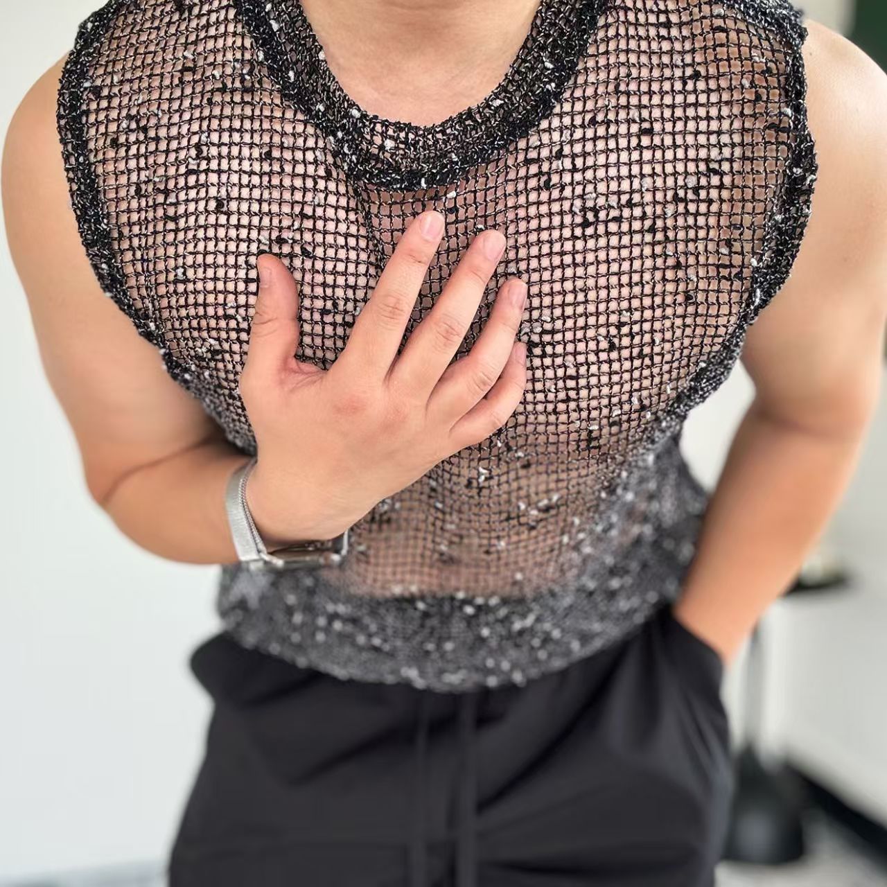 크로스보더 나이트클럽 남성 섹시 니트 민소매 탑, 레이스업 메쉬 조끼 티셔츠, 섹시 파티복스토어 가기