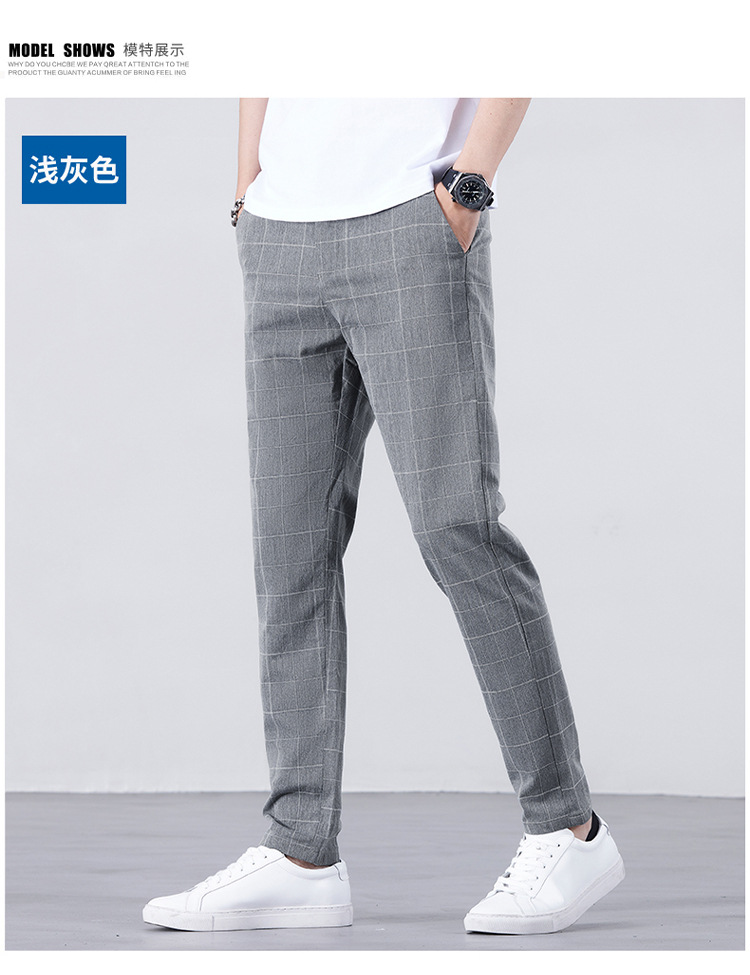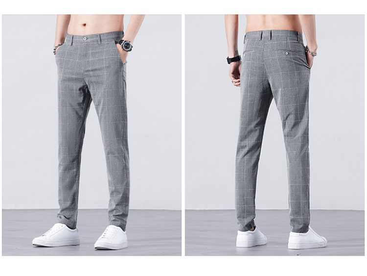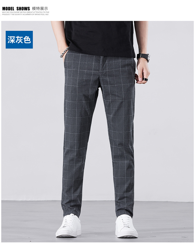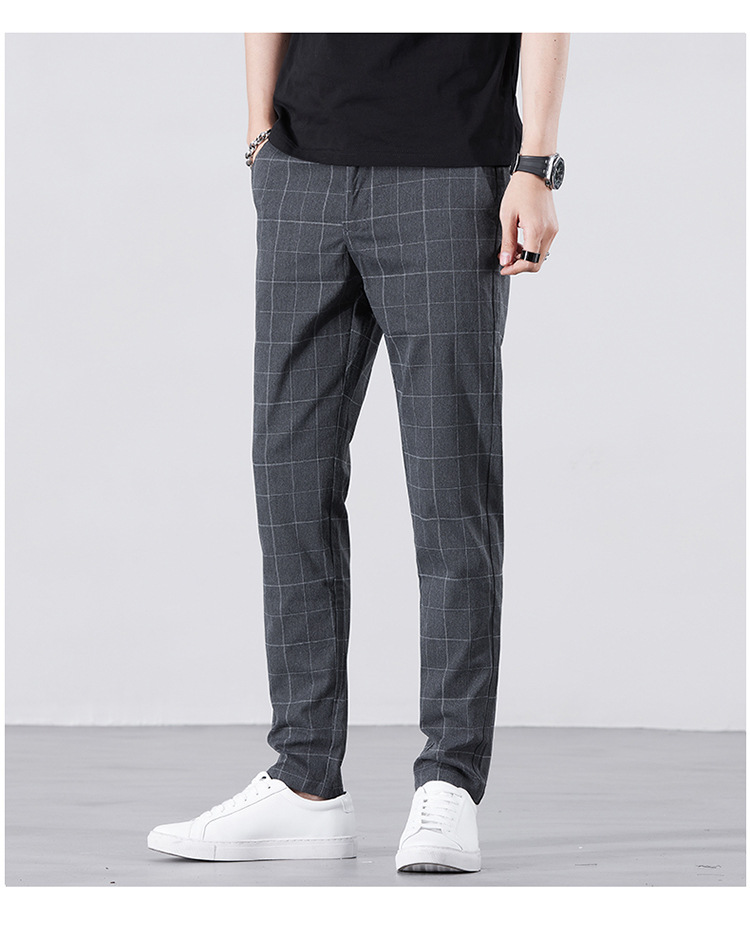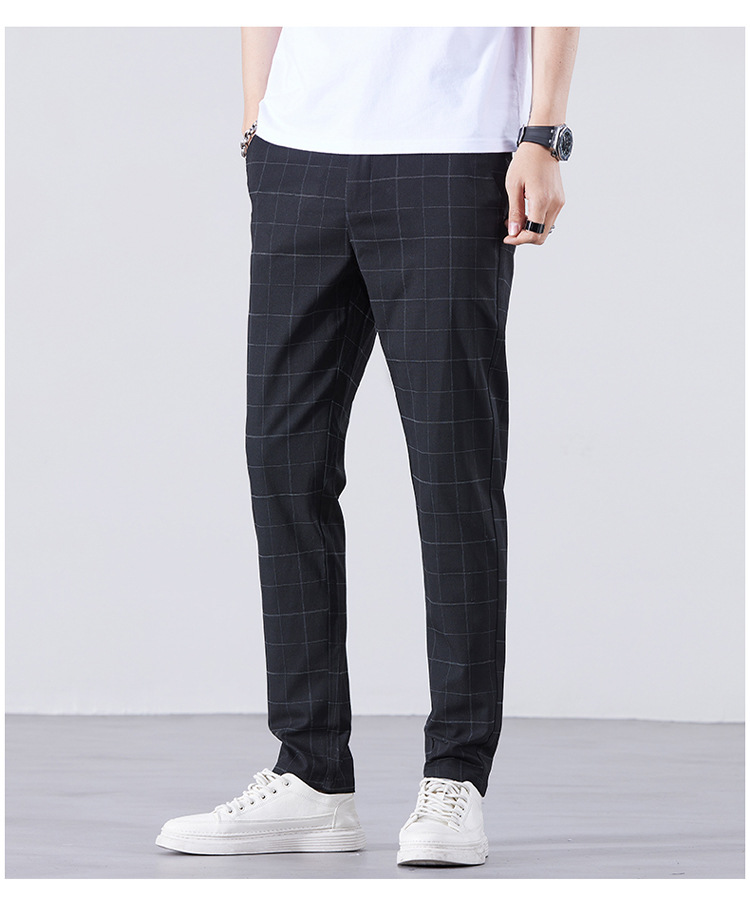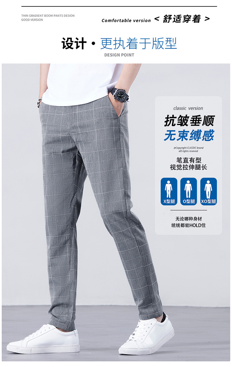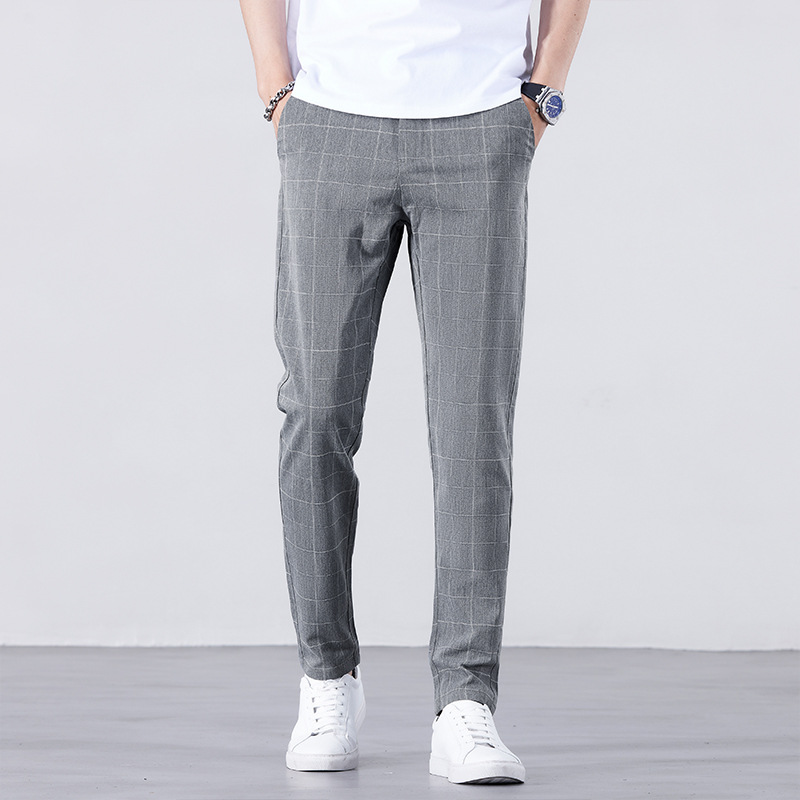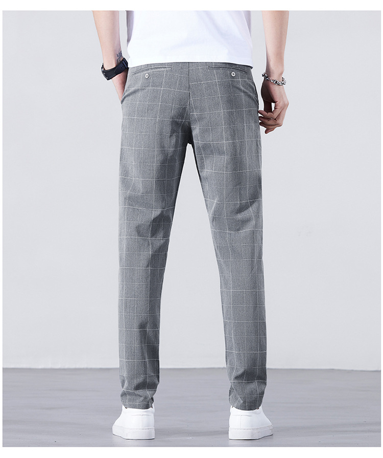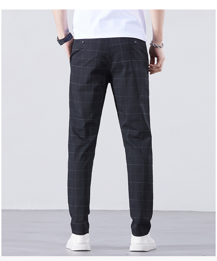 남성용 아이스 실크 캐주얼 팬츠 슬림핏 슬랙스 여름 얇은 체크 무늬 시원한 다용도 긴바지