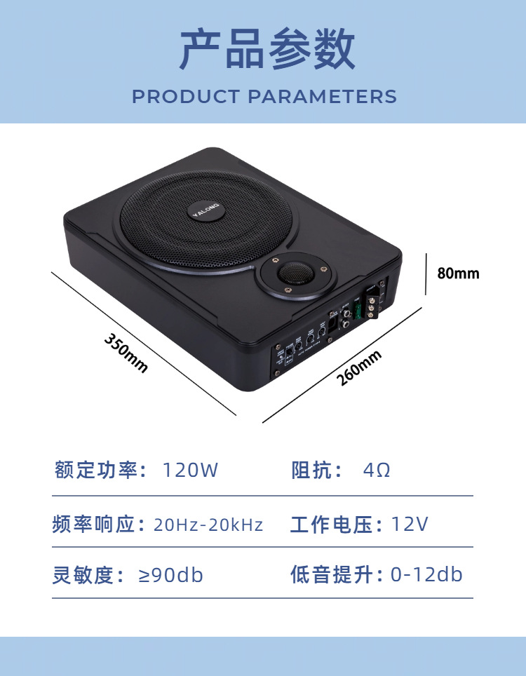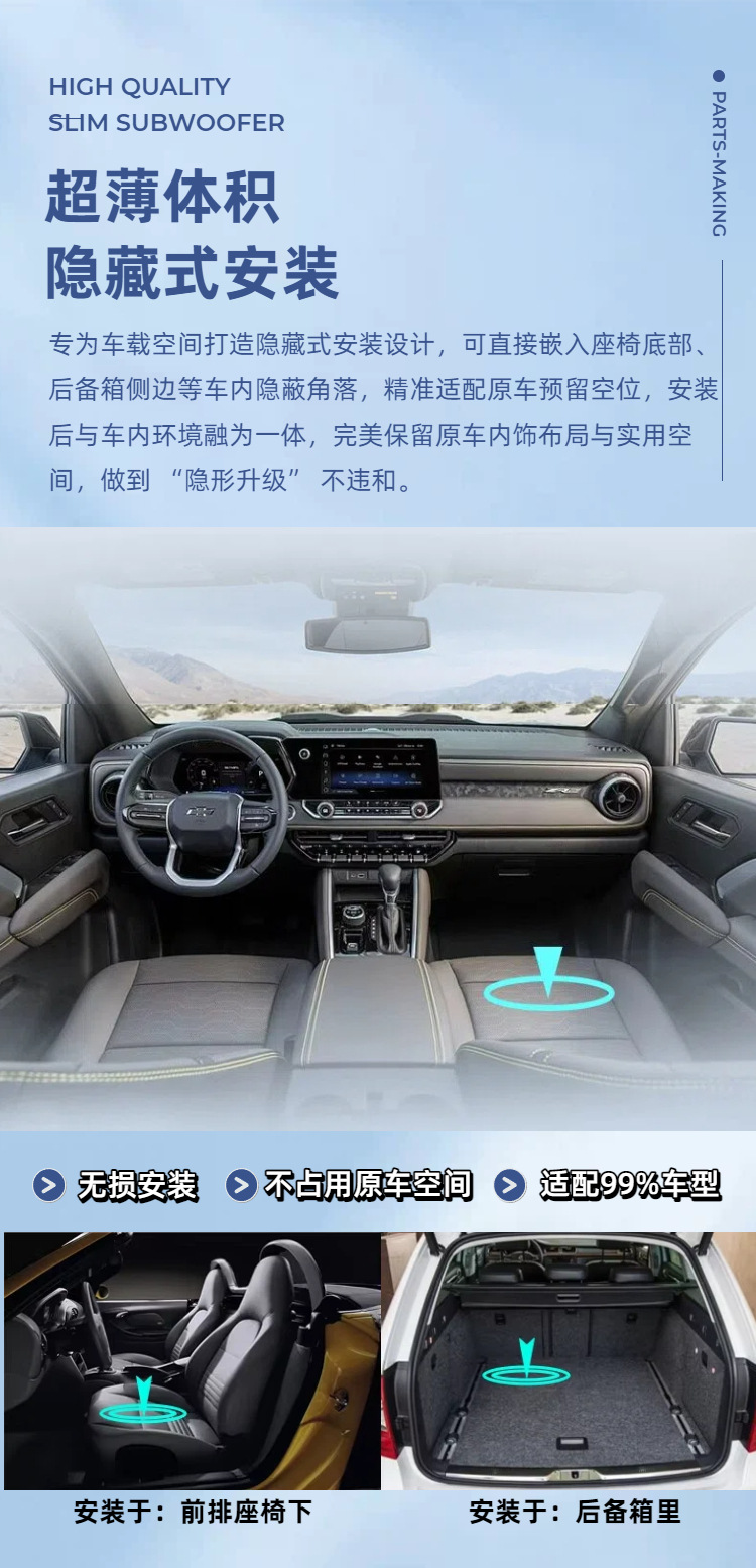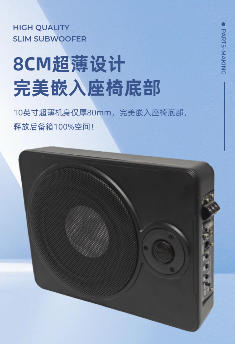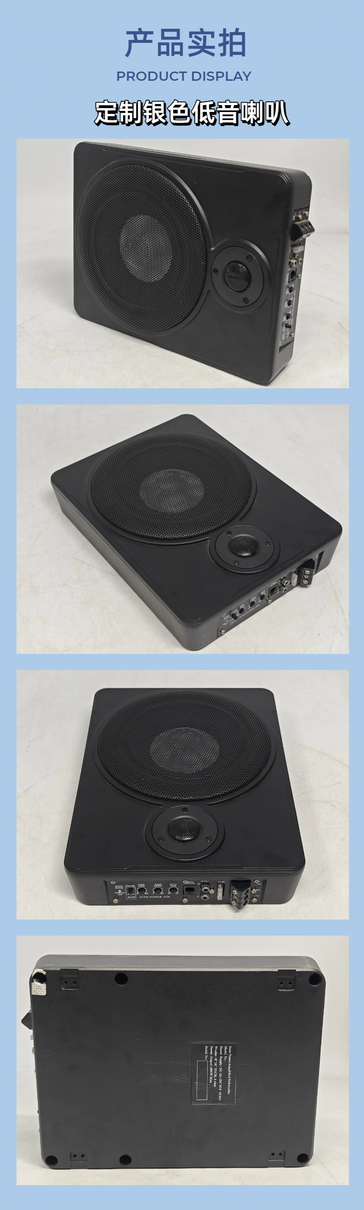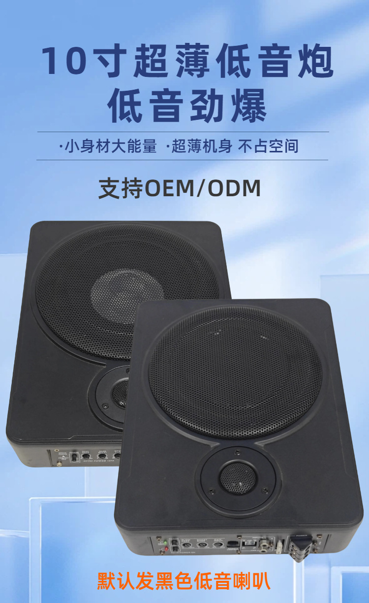 A1:本品为12V车载超薄低音炮,适配轿车、SUV、MPV等全品类12V车型,覆盖汽车改装店、4S店加装、汽配批发商、车载影音品牌商、贸易商等B端客户的供货需求;支持8寸/10寸/定制尺寸及多款型号选择,可根据终端车主空间、低频需求精准匹配,满足不同改装方案与市场定位。