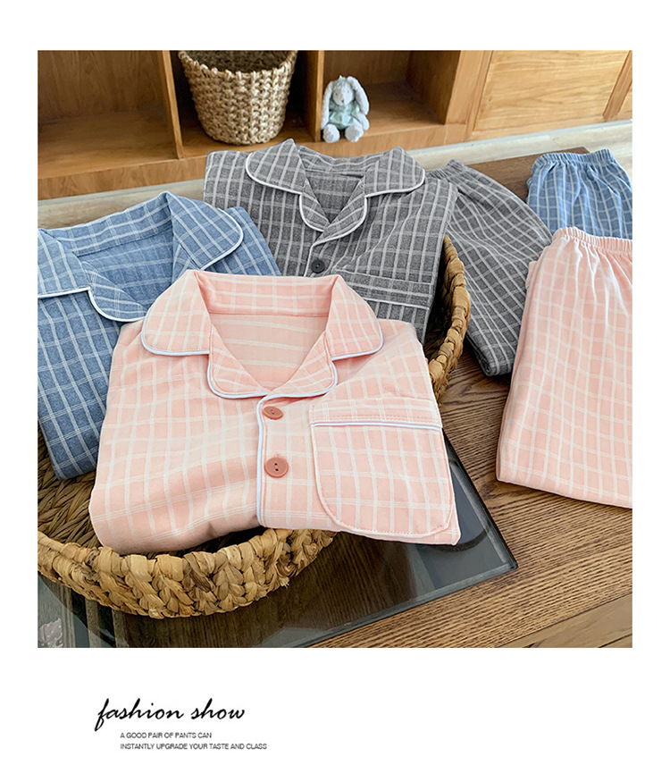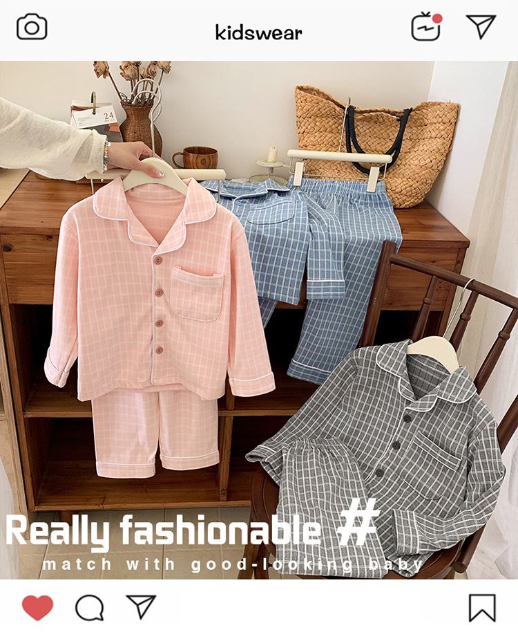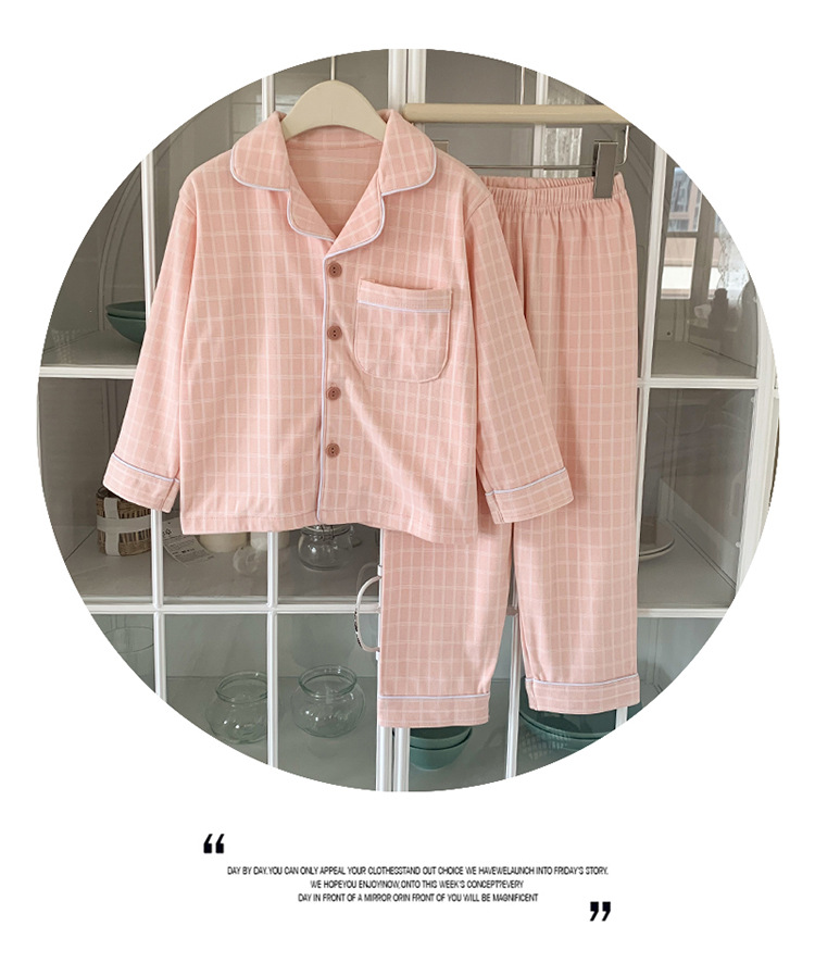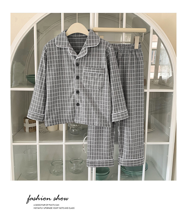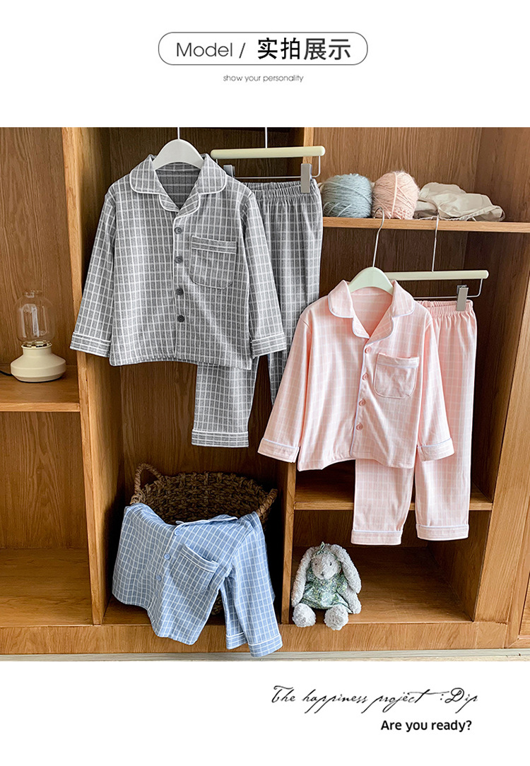 [무료 배송]] 가을 어린이 가정 의류 세트 소년과 소녀 긴팔 바지 간단한 옷깃 격자 무늬 잠옷