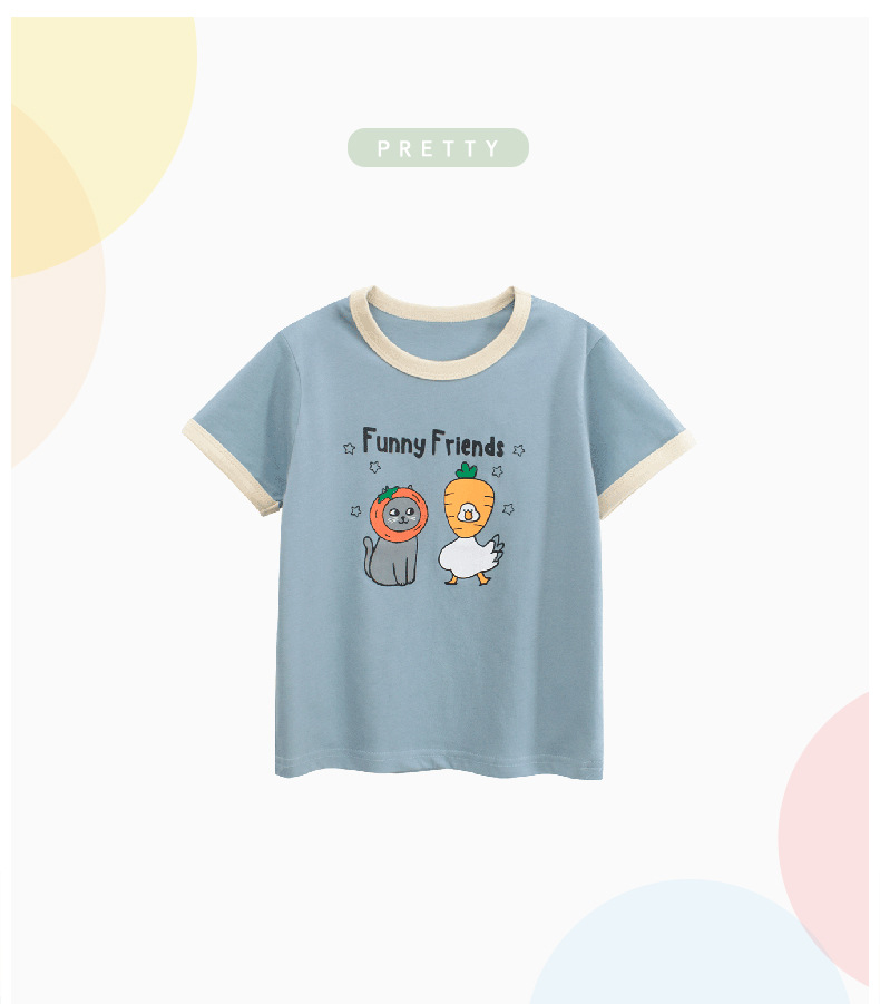 27 홈 여름 어린이 반팔 티셔츠 소녀 한국 아동복 만화 인쇄 아기 옷 국경 공급