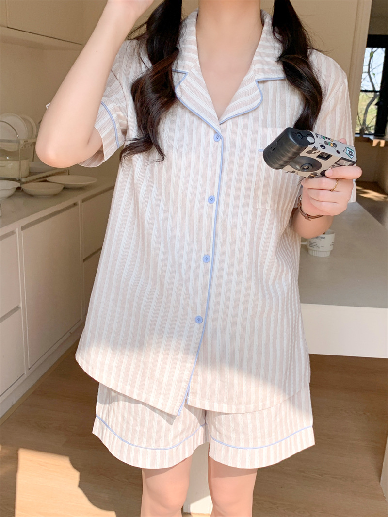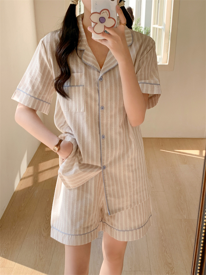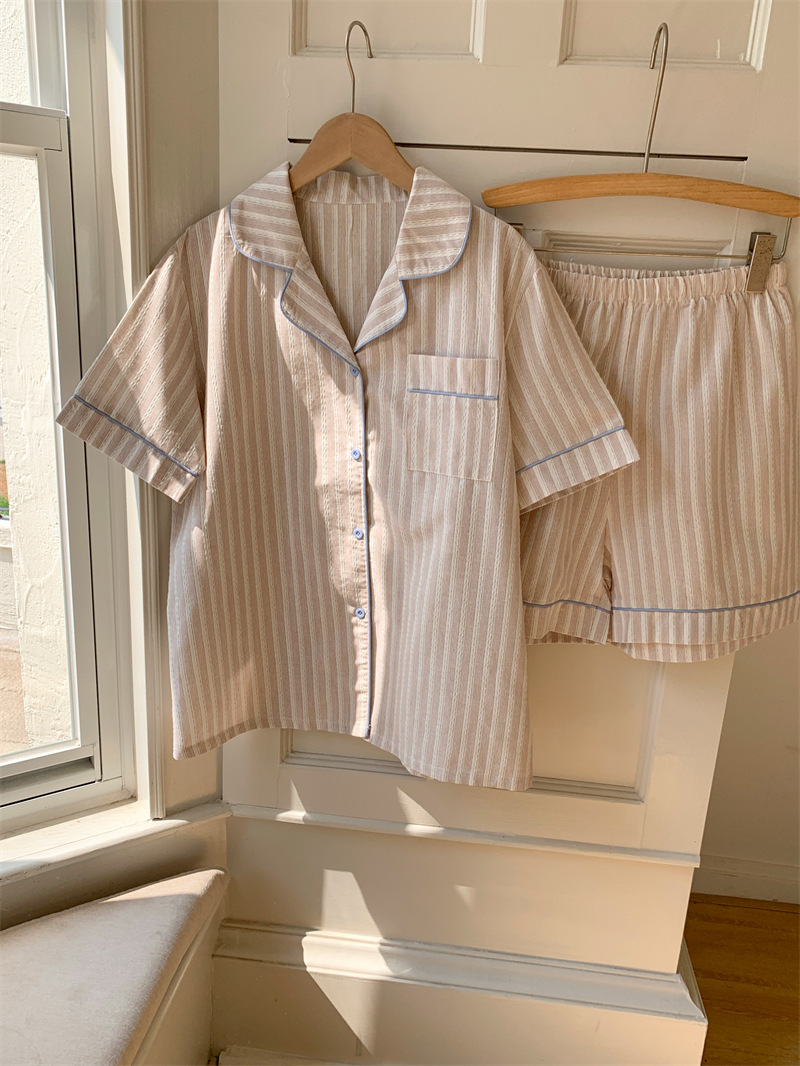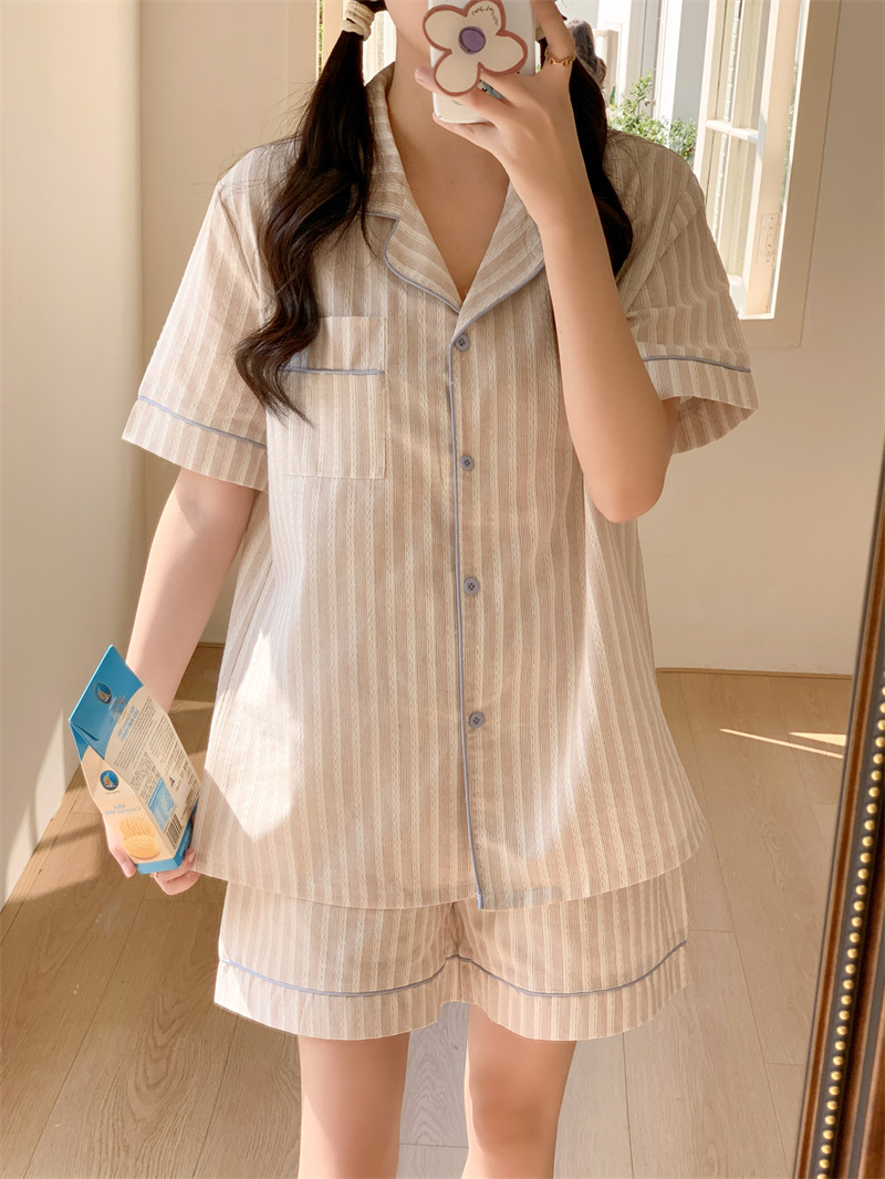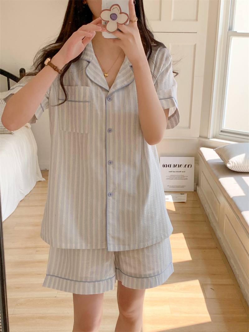 여성을위한 국경 독점 여름 새로운 캐주얼 느슨한 커플 외주 여성의 간단한 줄무늬 한국 남성 홈 의류
