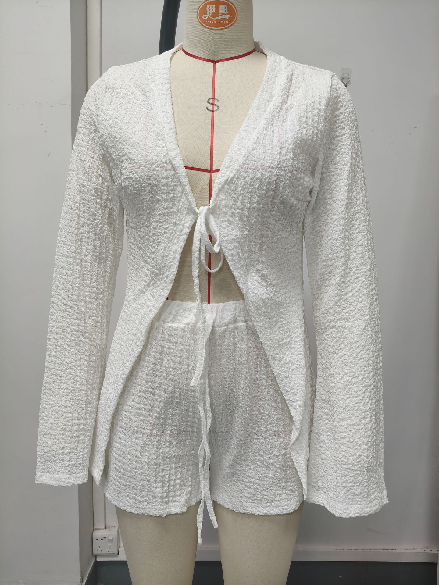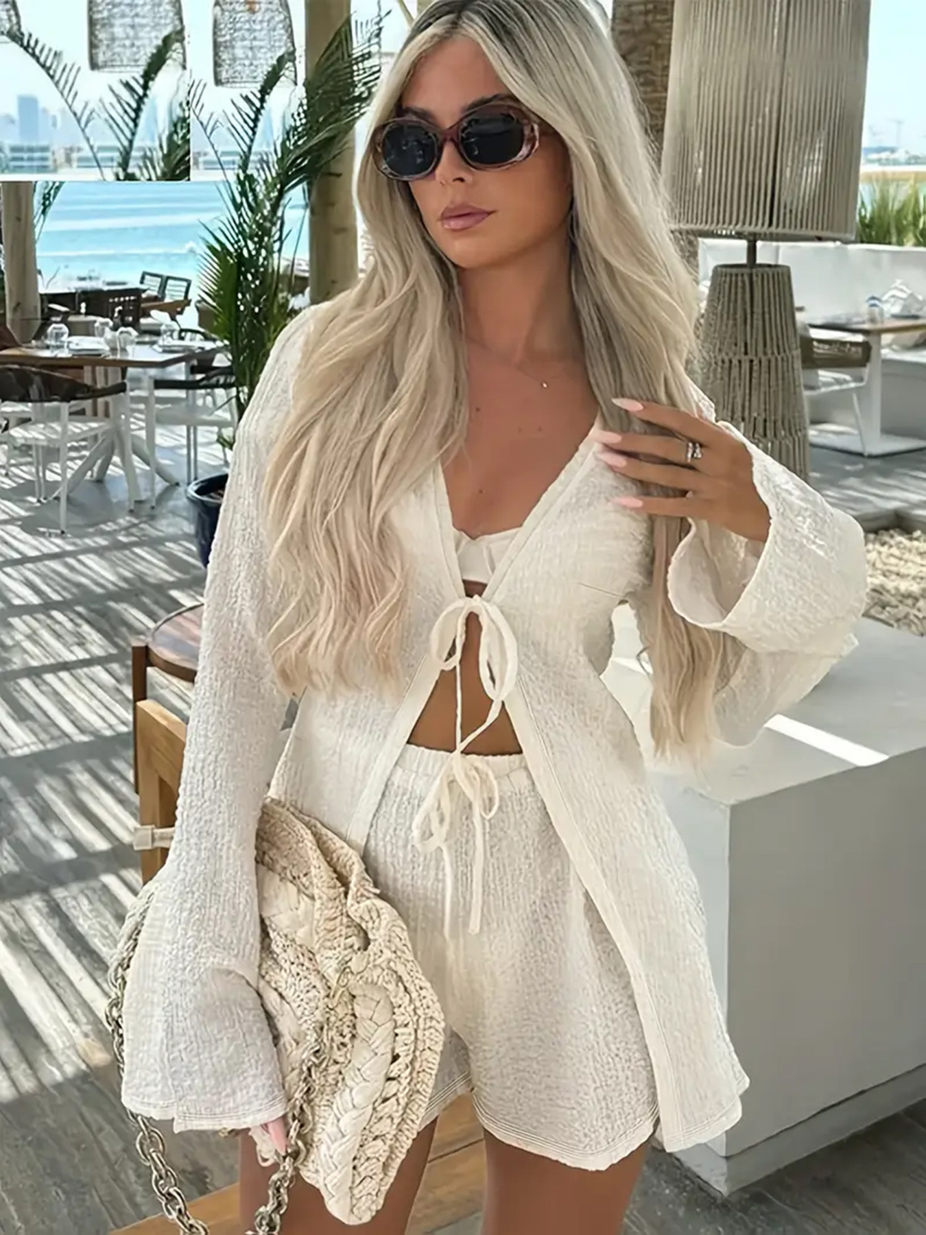 2025 봄과 여름 유럽과 미국 여성의 국경 휴가 스타일 느슨한 세트 레이스 업 최고 탄성 허리 반바지 투피스 세트