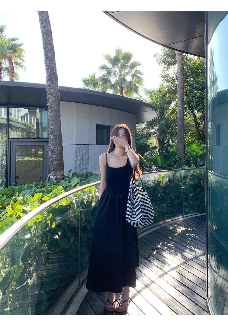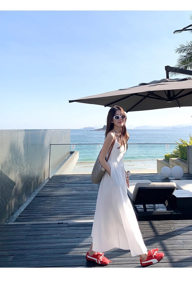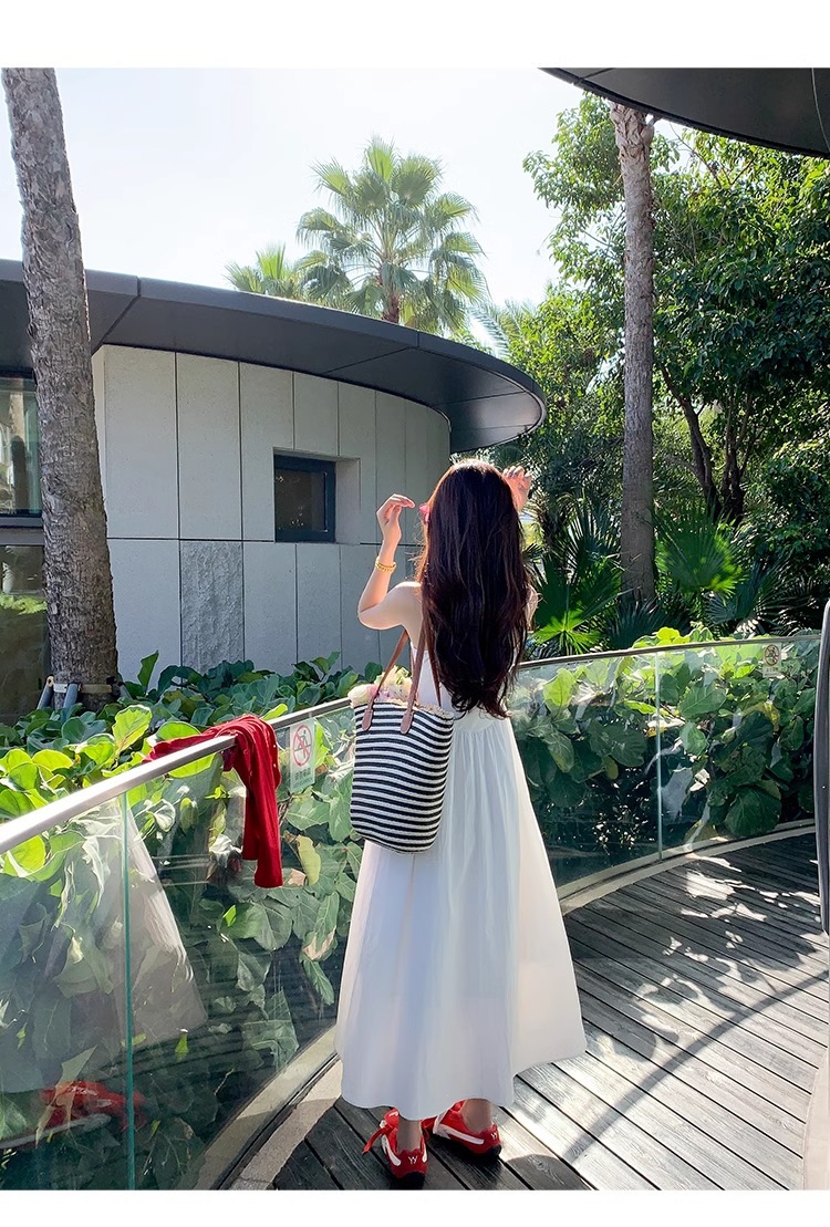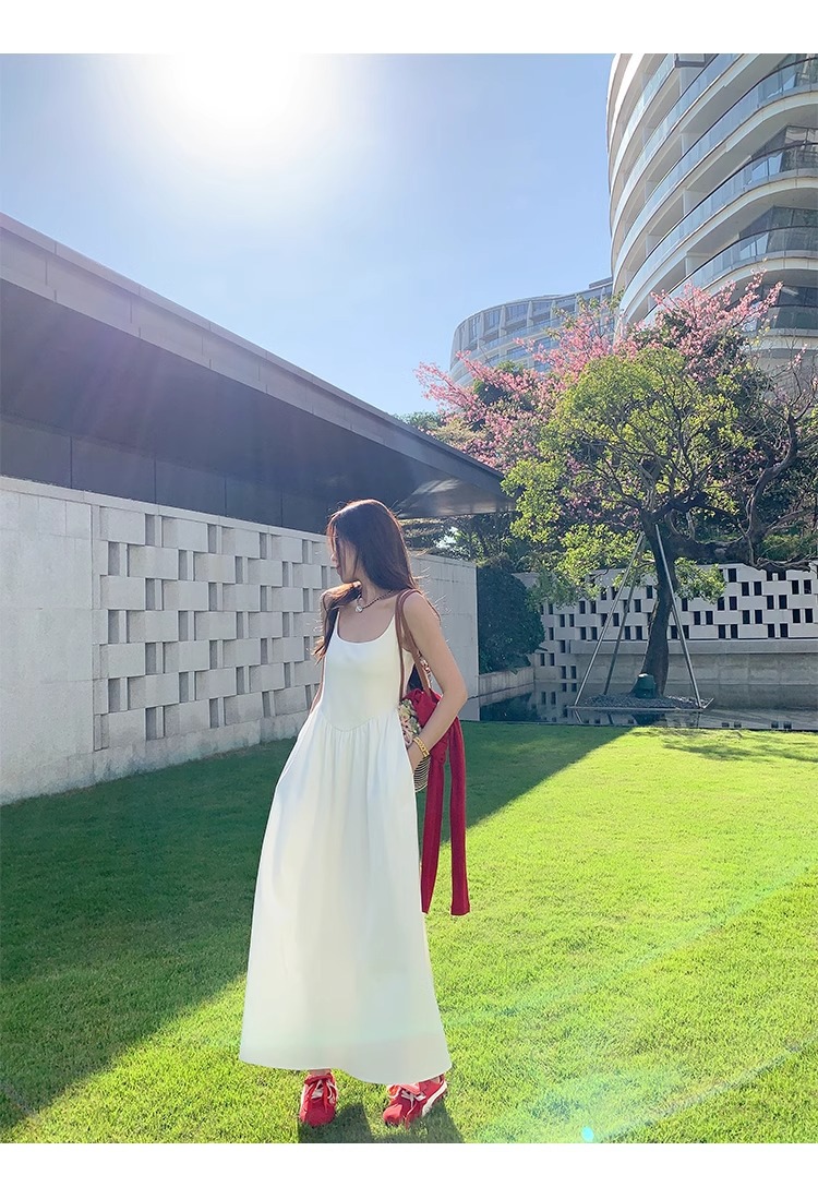 한국 스타일 부드러운 흰색 타이트 허리 슬링 원피스 휴일 스타일 달콤한 착용 슬리밍 우아한 긴 스커트