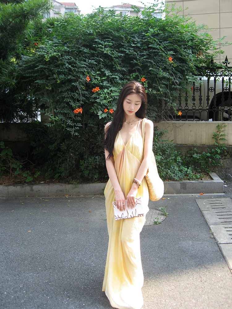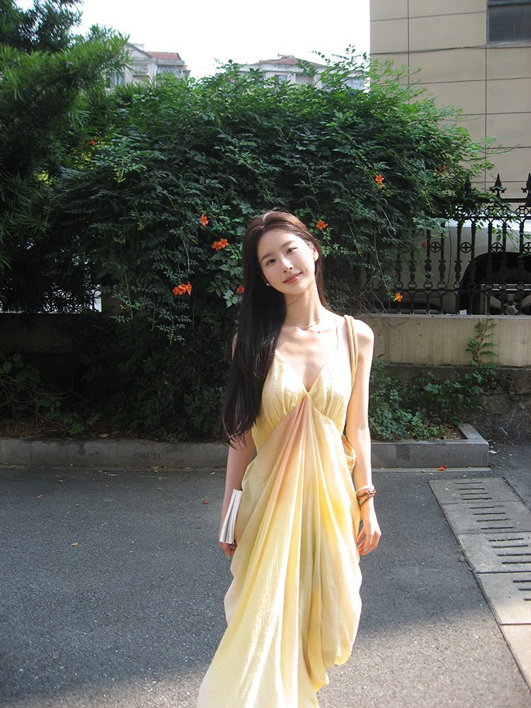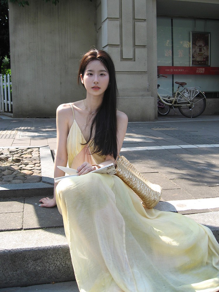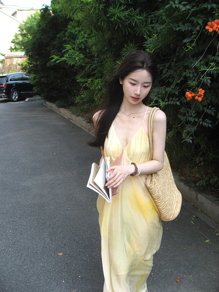 프랑스 요정 슈퍼 요정 해변 휴가 긴 원피스 마취 모양 슬링 치마 질감 인쇄 스눕 원피스