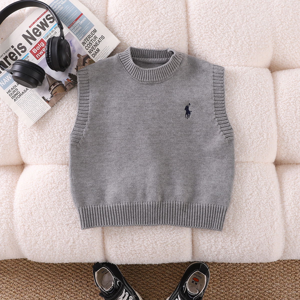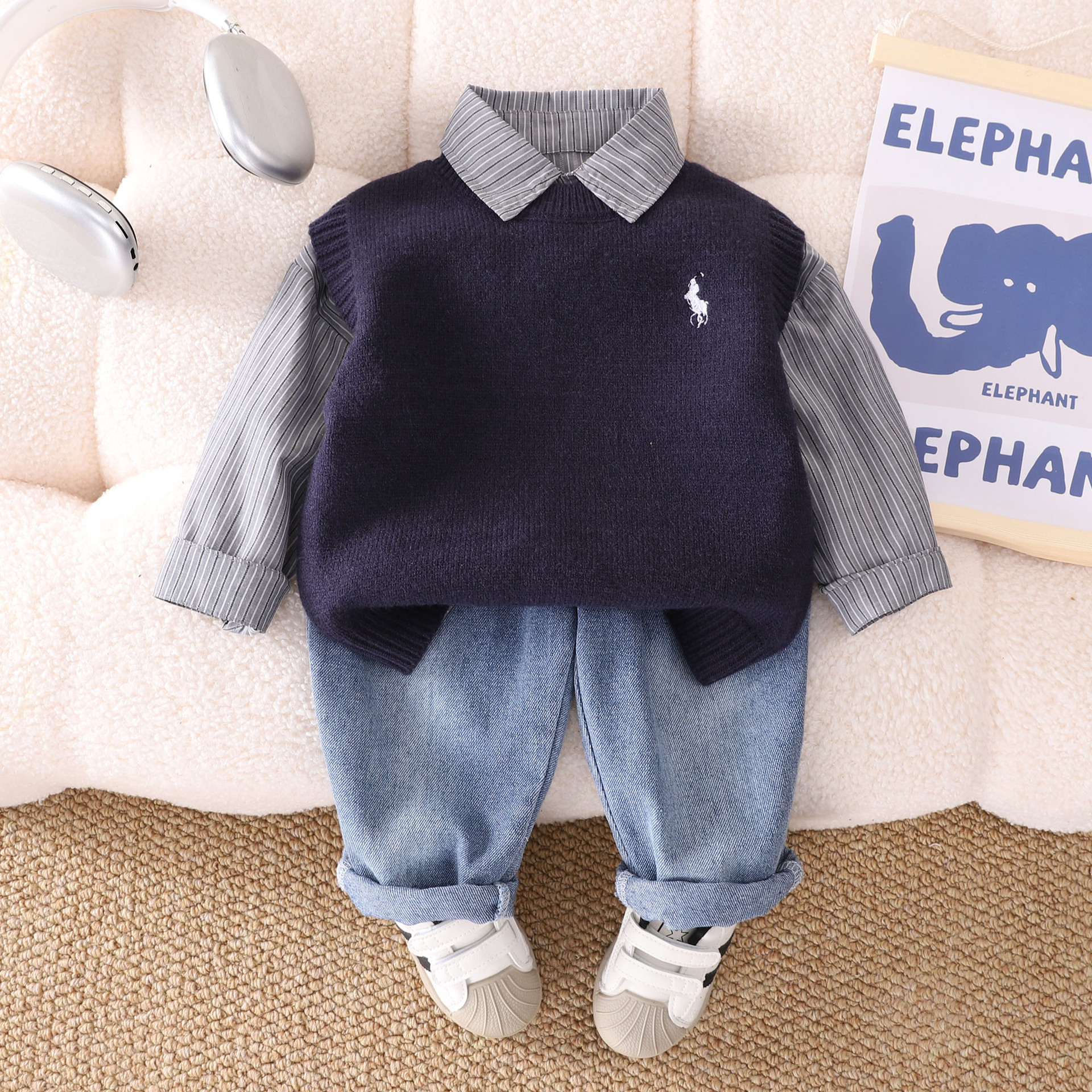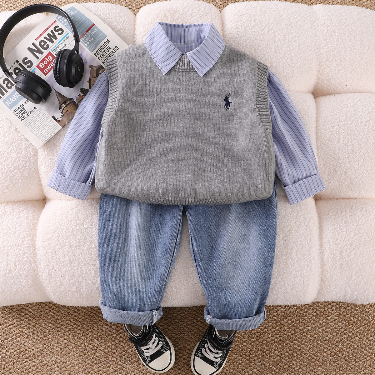 소년 봄 세트 2025 새로운 잘 생긴 아기 봄과 가을 스웨터 조끼 셔츠 3 피스 아동복스토어 가기