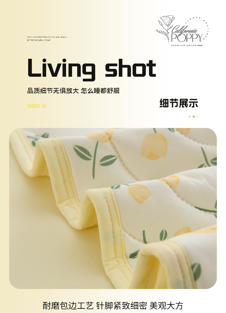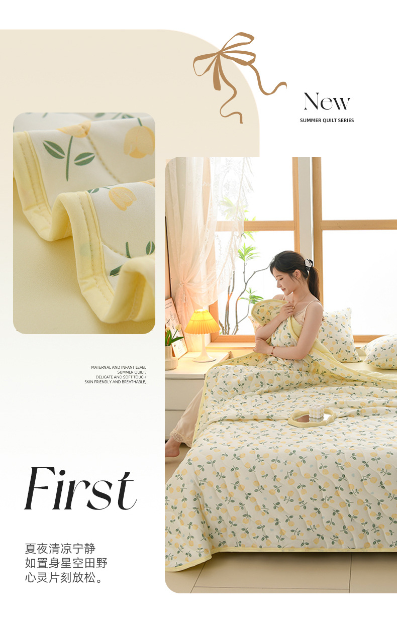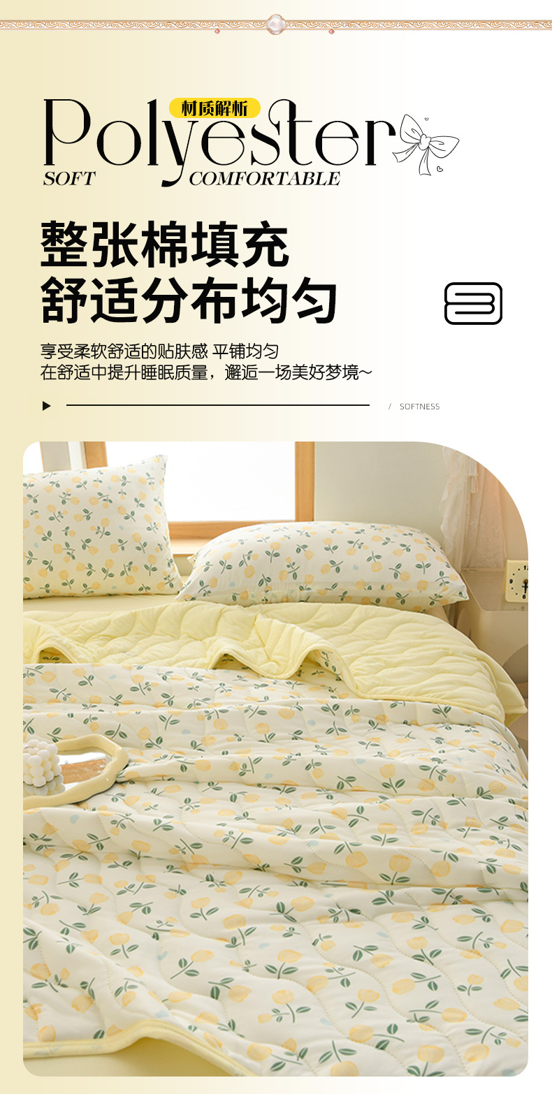 - **填充物**:多为超细纤维或天然棉絮,轻盈蓬松但保暖适中,冷气环境下保暖不闷,春秋季也可作为薄被使用。
