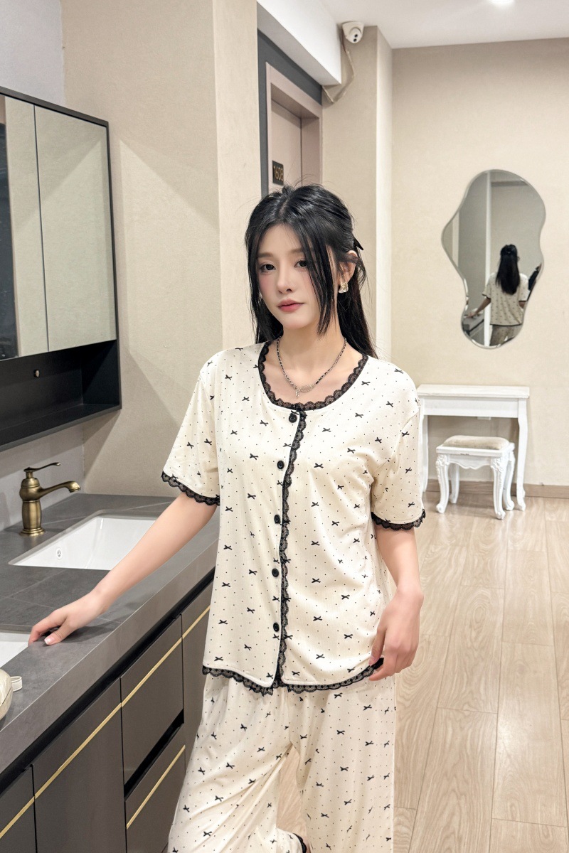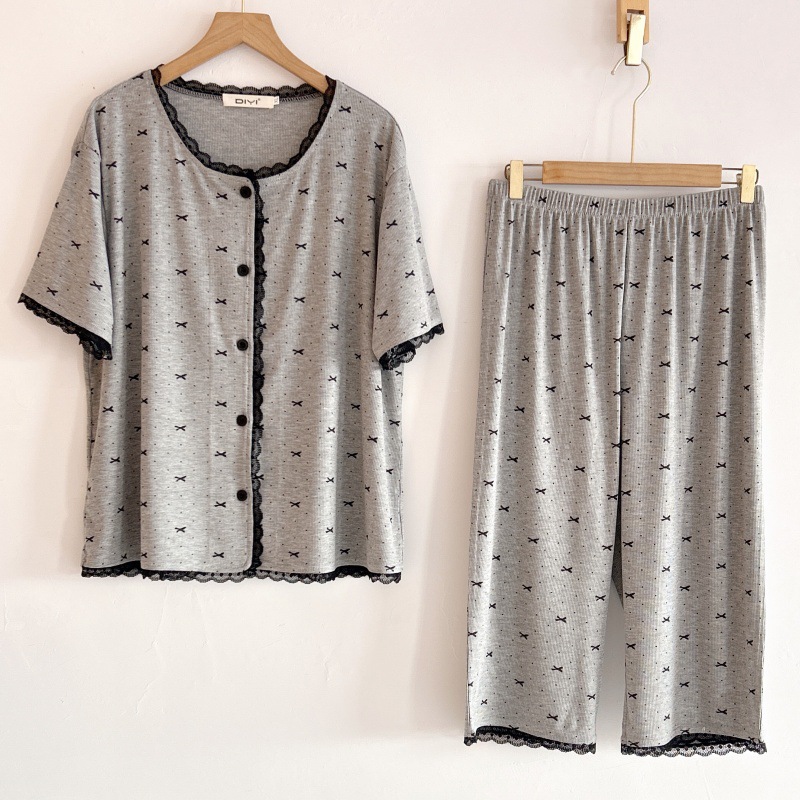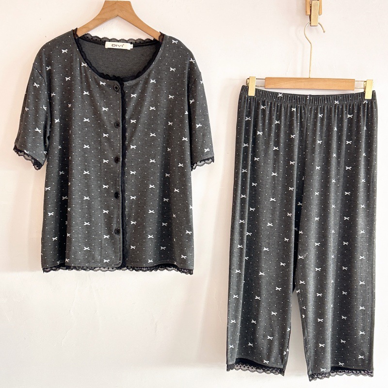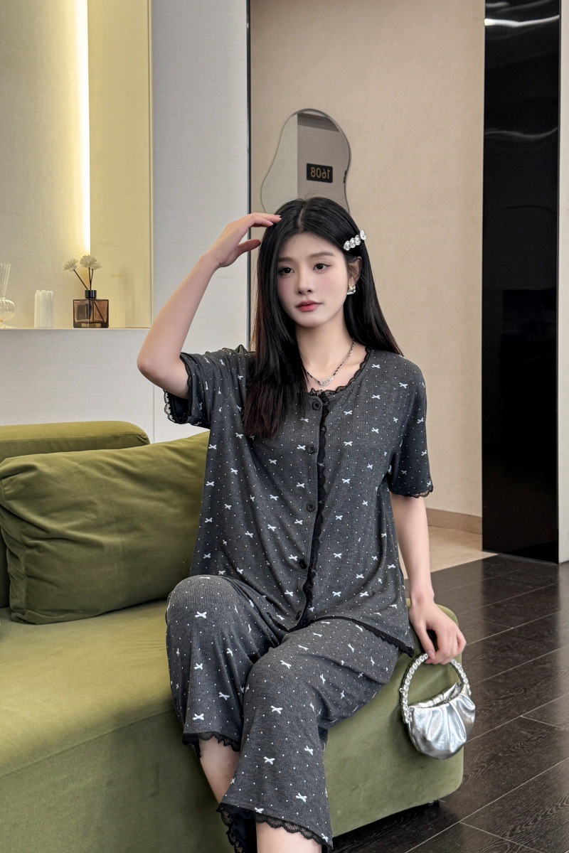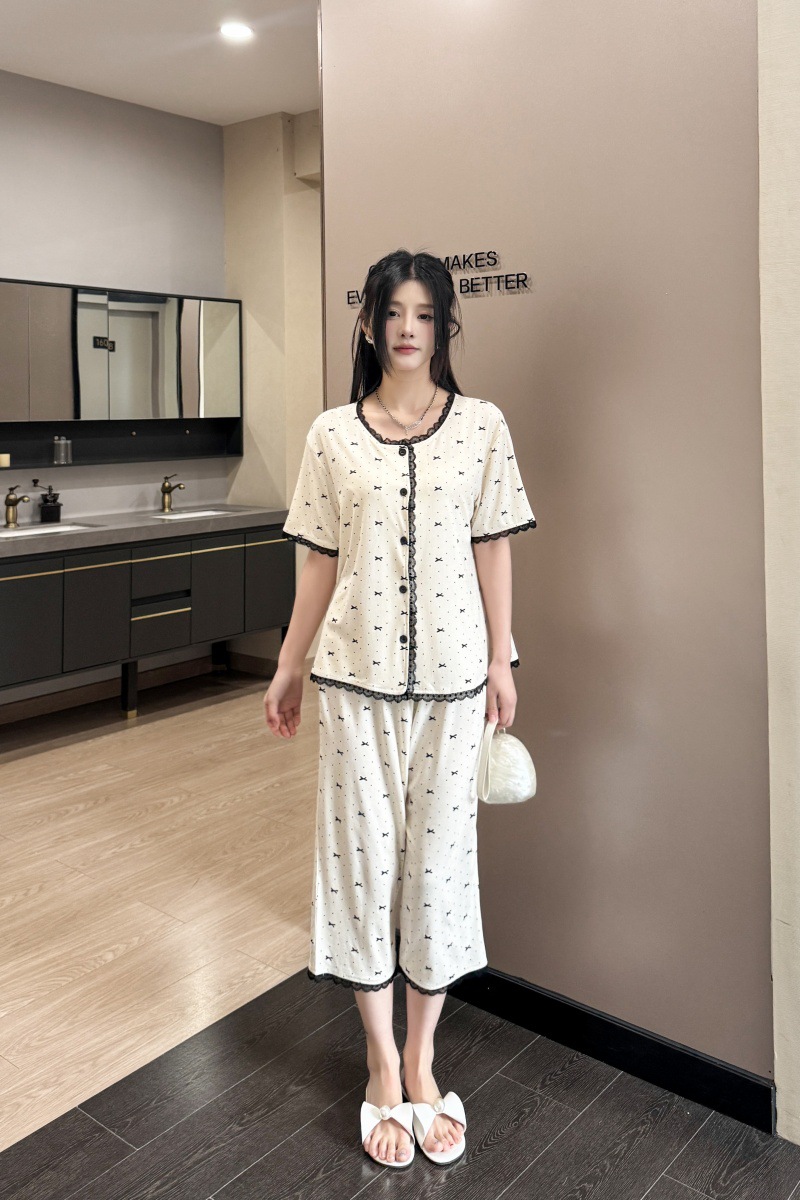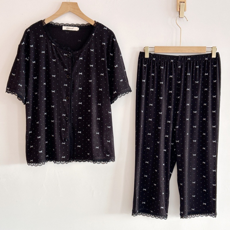 폴카 도트 활 인쇄 달콤한 크루 넥 레이스 파자마 여성의 봄과 여름 반팔 카프리 바지 공주 스타일 홈 옷스토어 가기