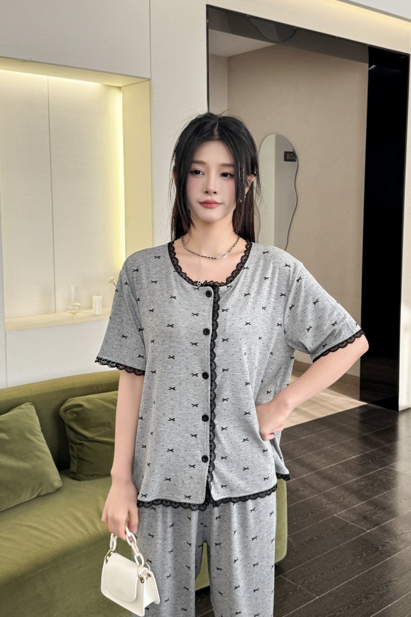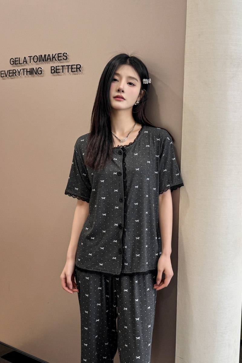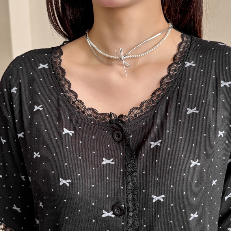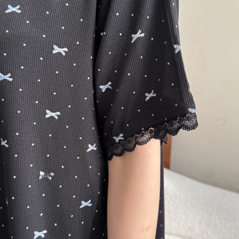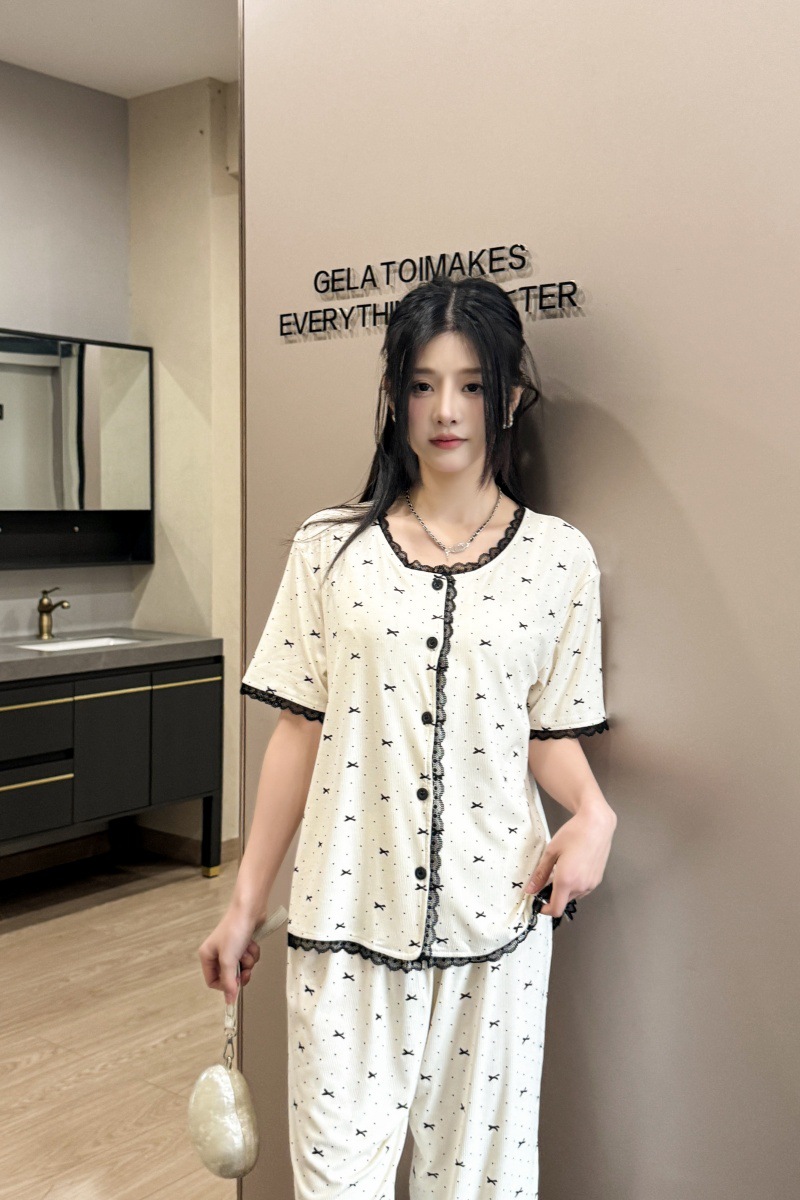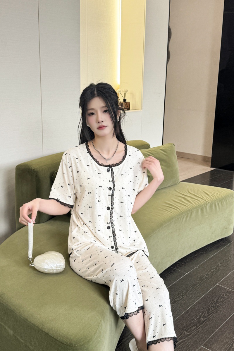 폴카 도트 활 인쇄 달콤한 크루 넥 레이스 파자마 여성의 봄과 여름 반팔 카프리 바지 공주 스타일 홈 옷스토어 가기