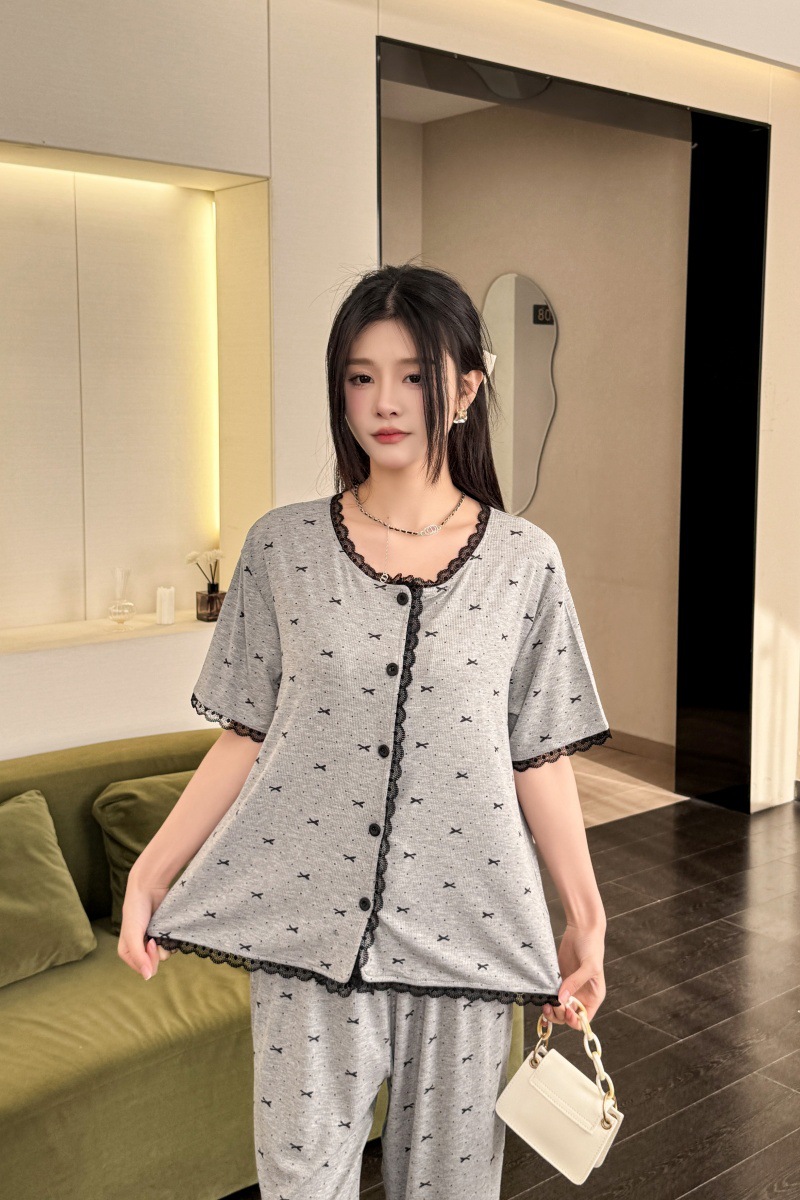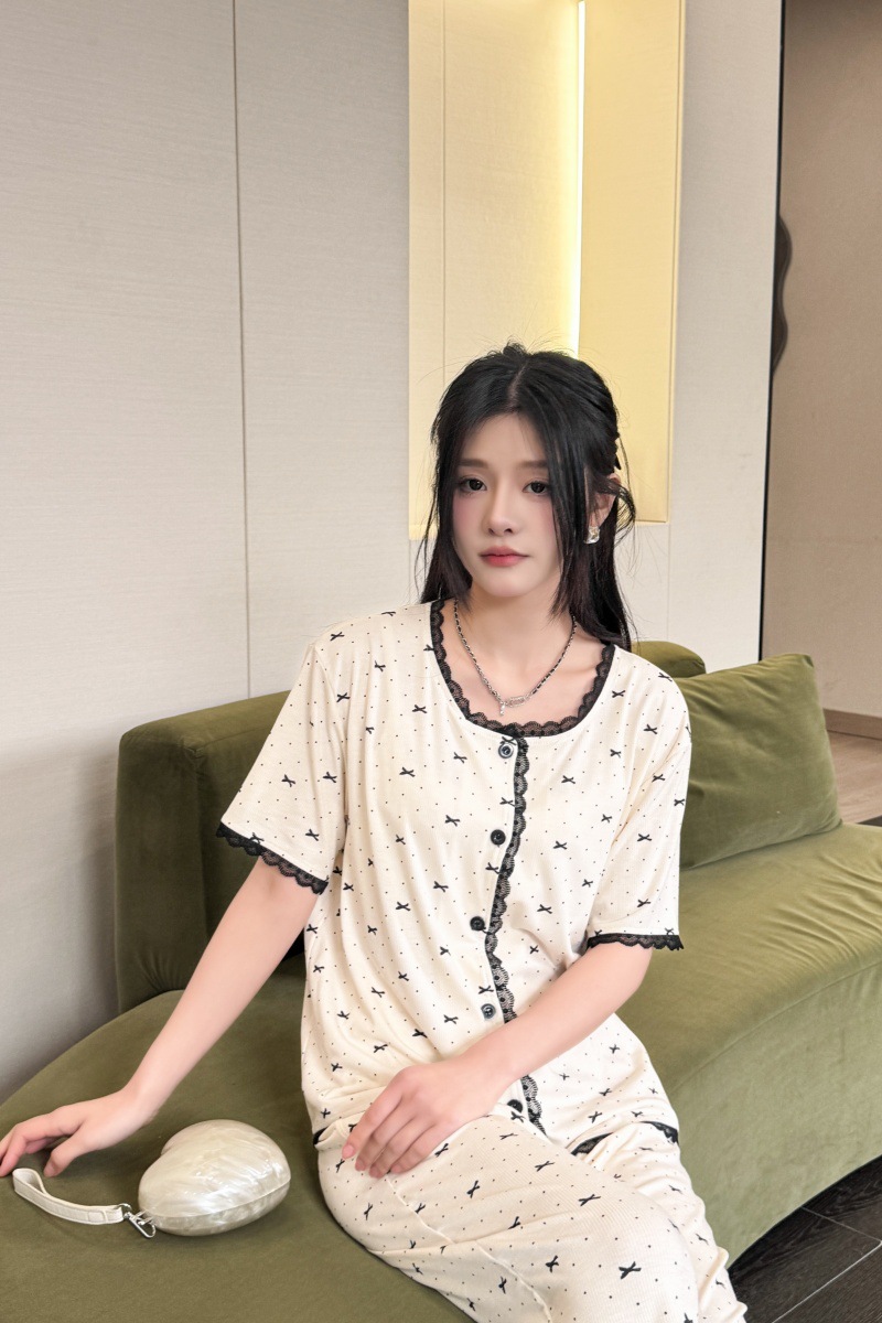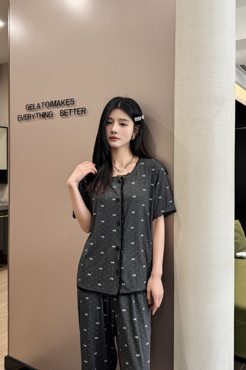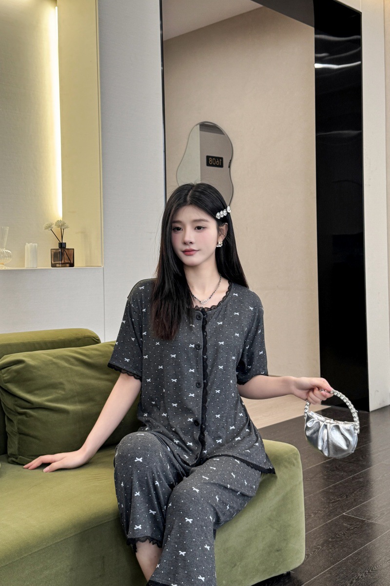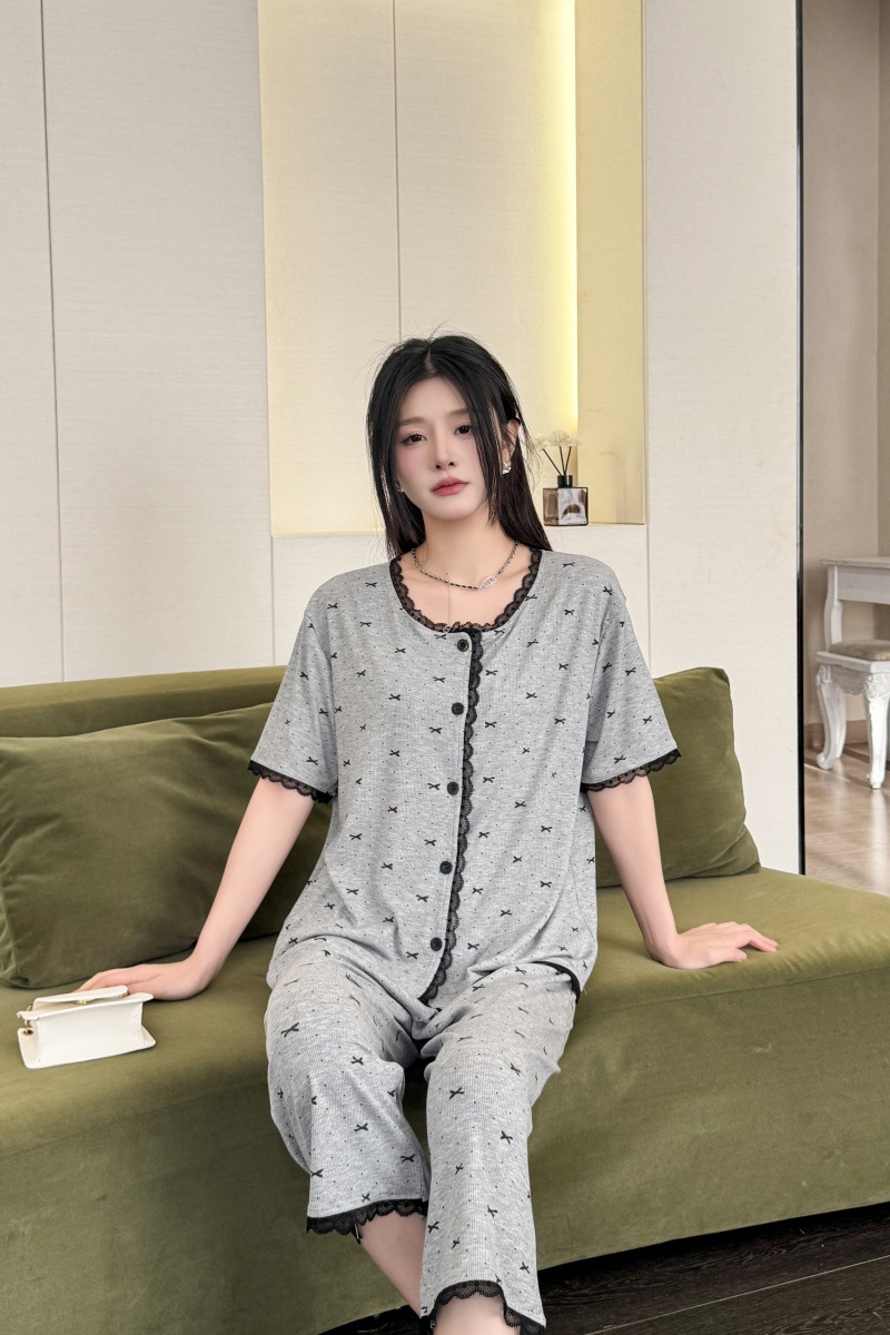 폴카 도트 활 인쇄 달콤한 크루 넥 레이스 파자마 여성의 봄과 여름 반팔 카프리 바지 공주 스타일 홈 옷스토어 가기