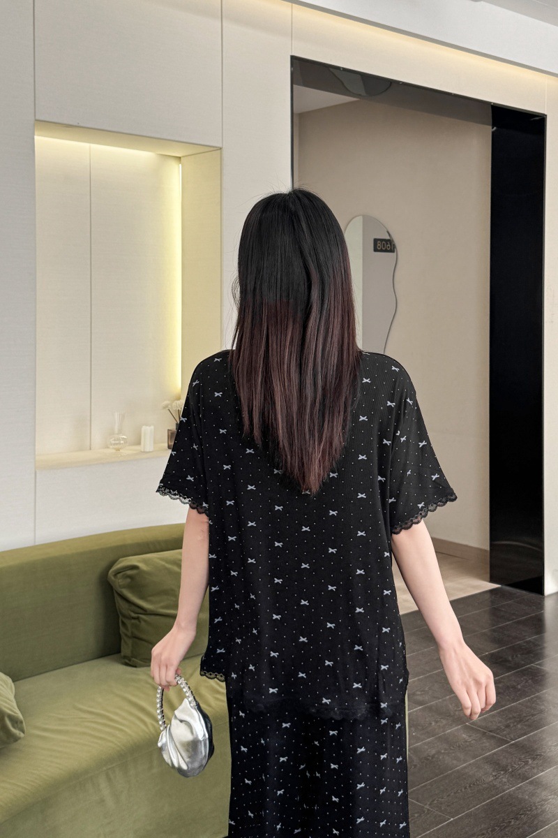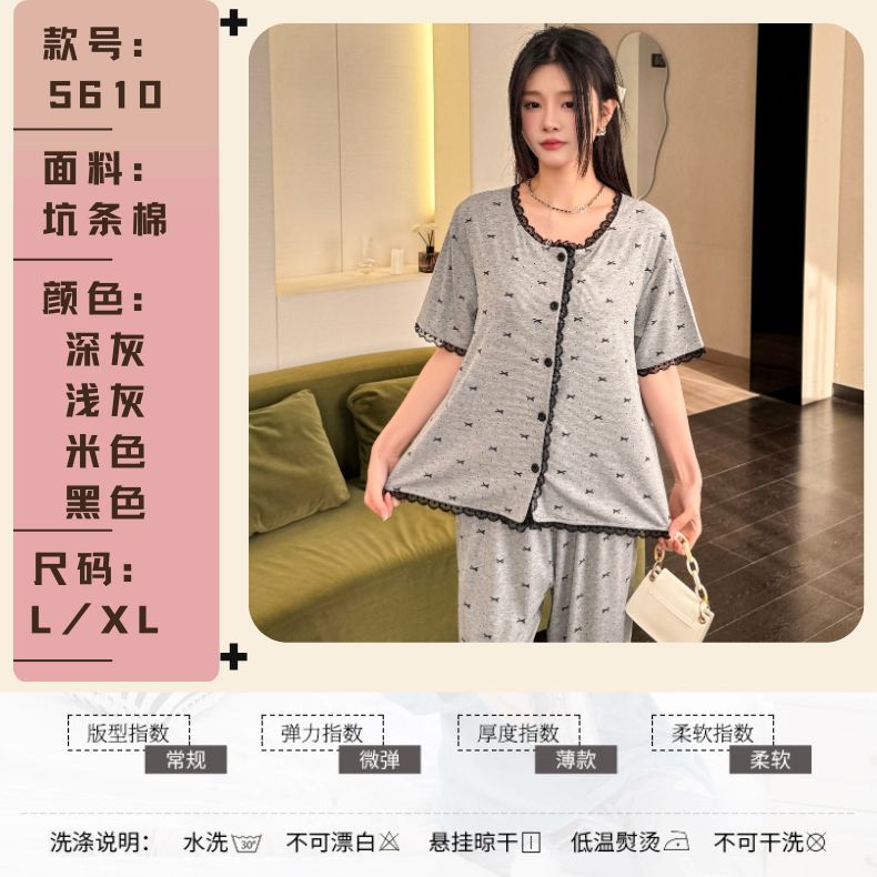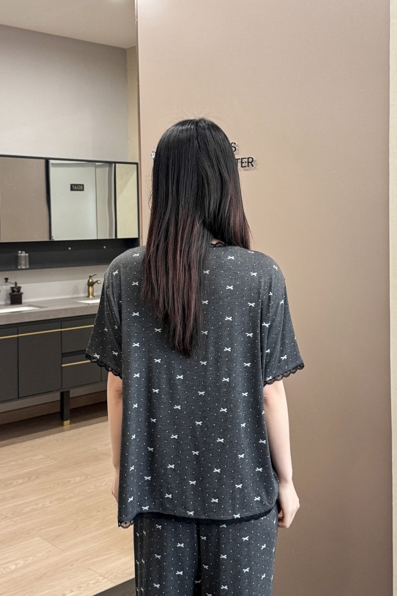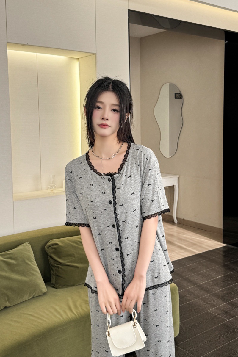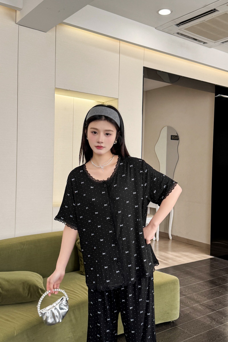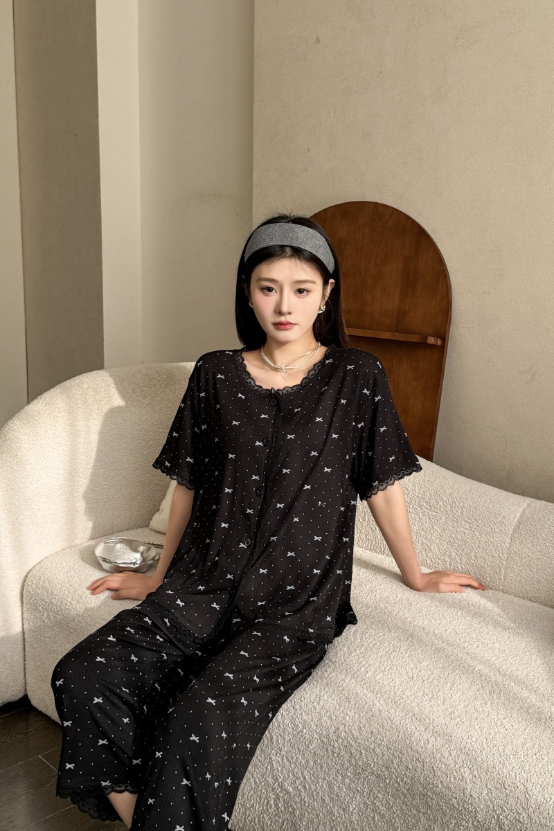 폴카 도트 활 인쇄 달콤한 크루 넥 레이스 파자마 여성의 봄과 여름 반팔 카프리 바지 공주 스타일 홈 옷스토어 가기