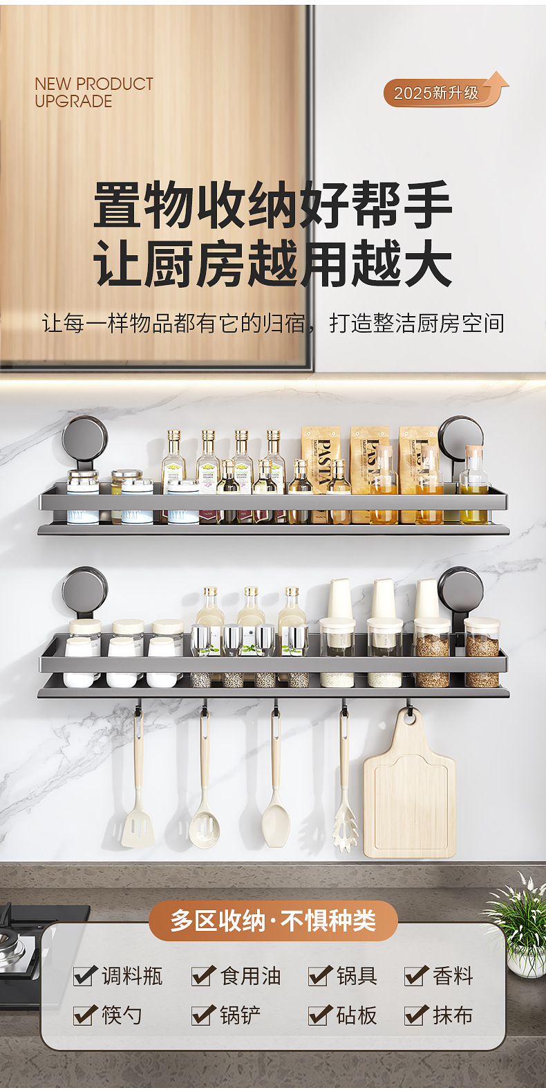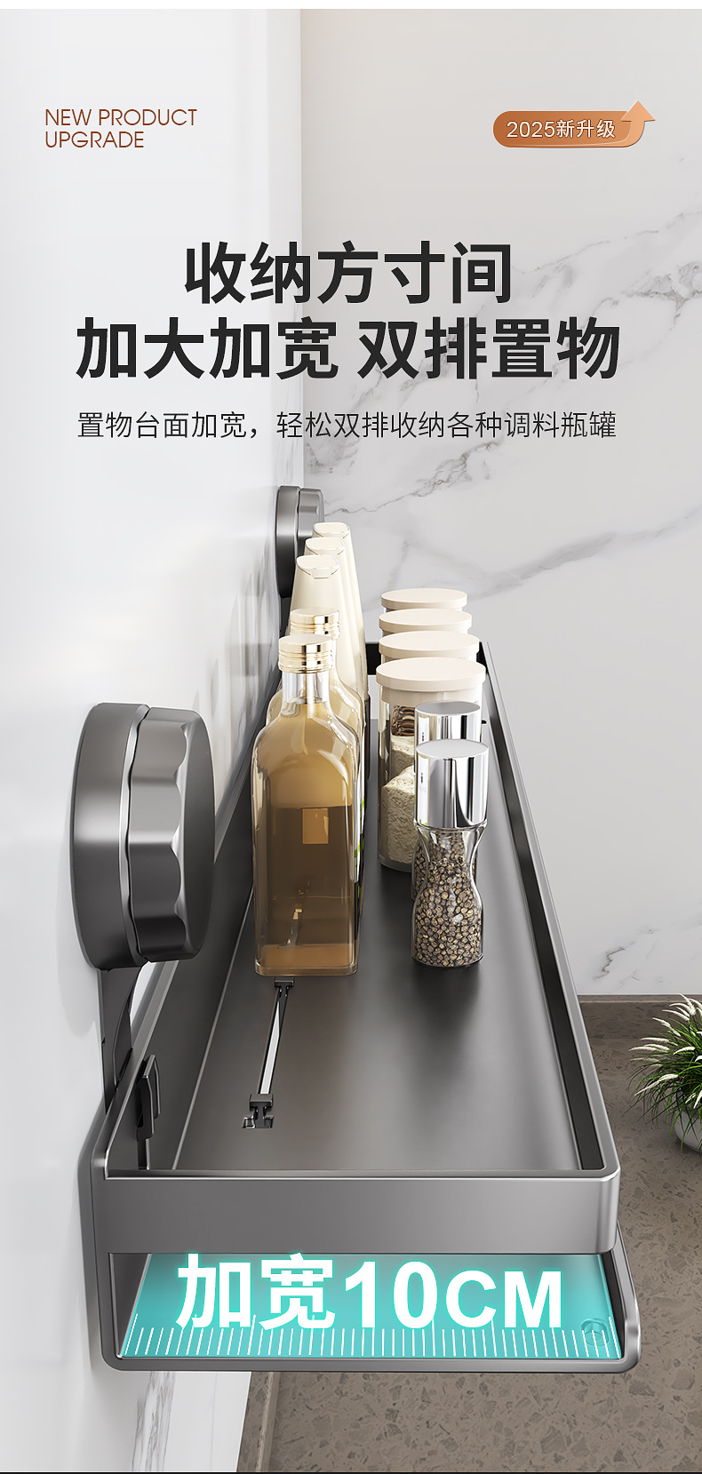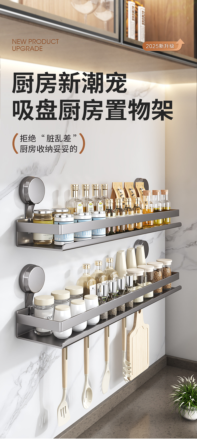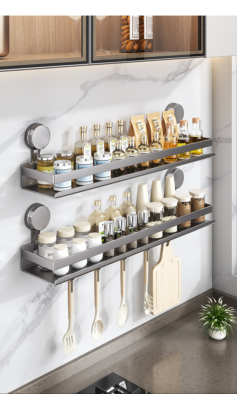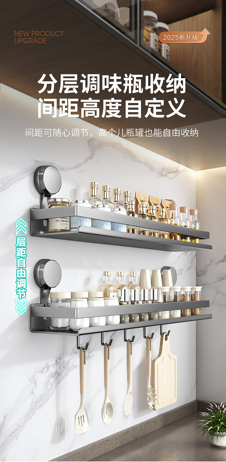 새로운 무타공 흡착컵 주방 수납 선반, 다기능 가정용 벽걸이형 벽걸이 양념통 수납 선반