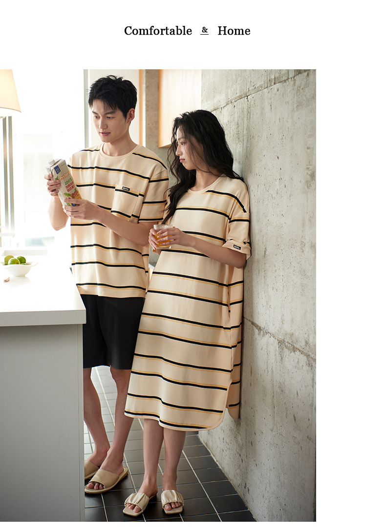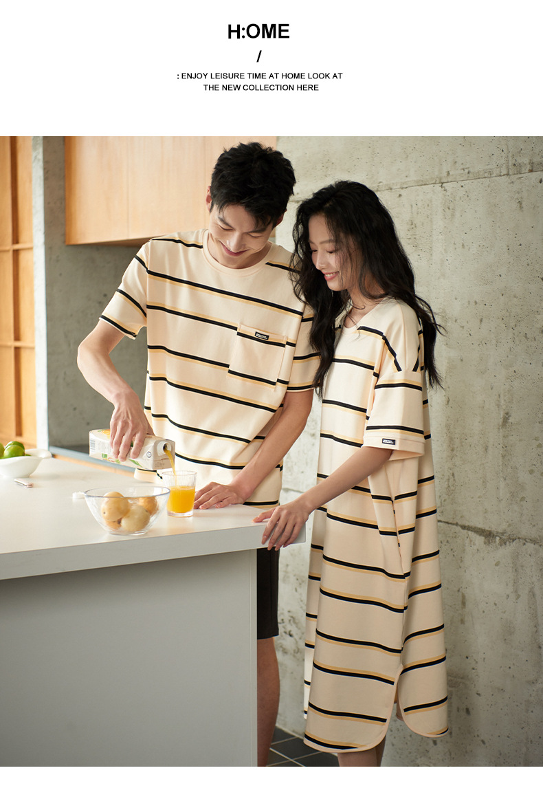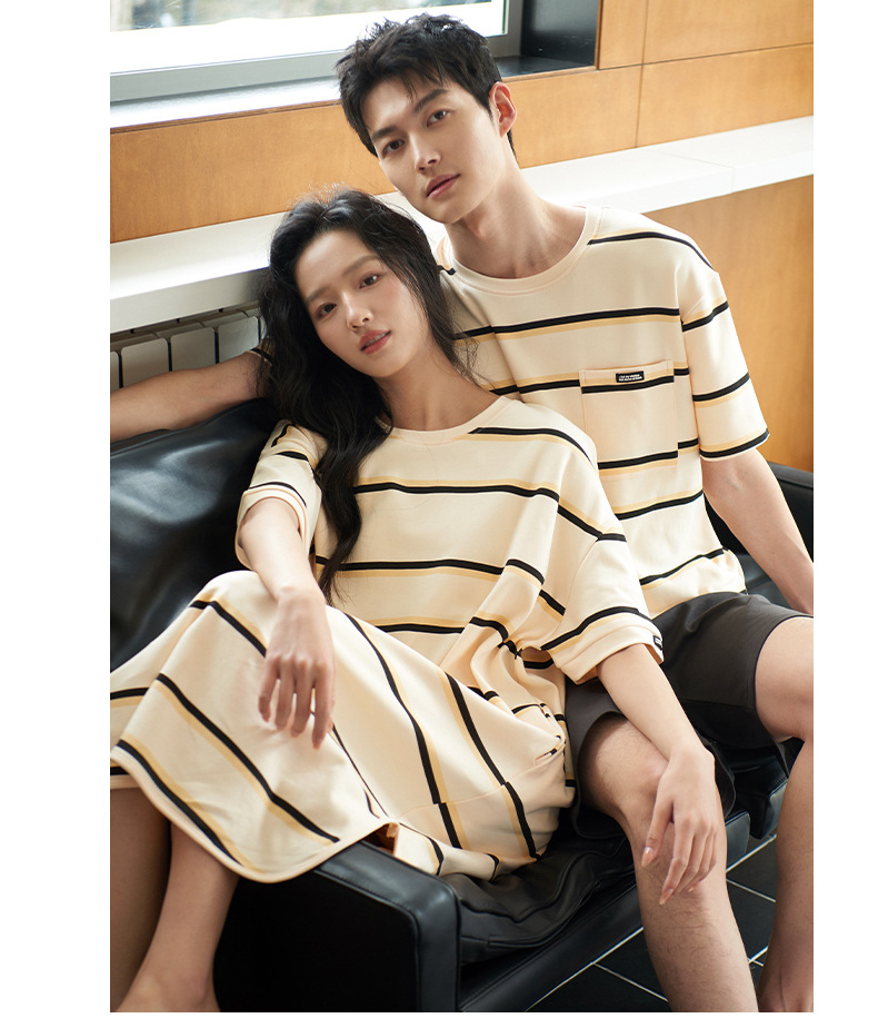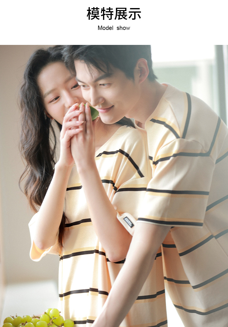 커플 잠옷 여름 순면 반팔 스트라이프 잠옷 여성용 외출 가능 얇고 편안한 남성용 홈웨어